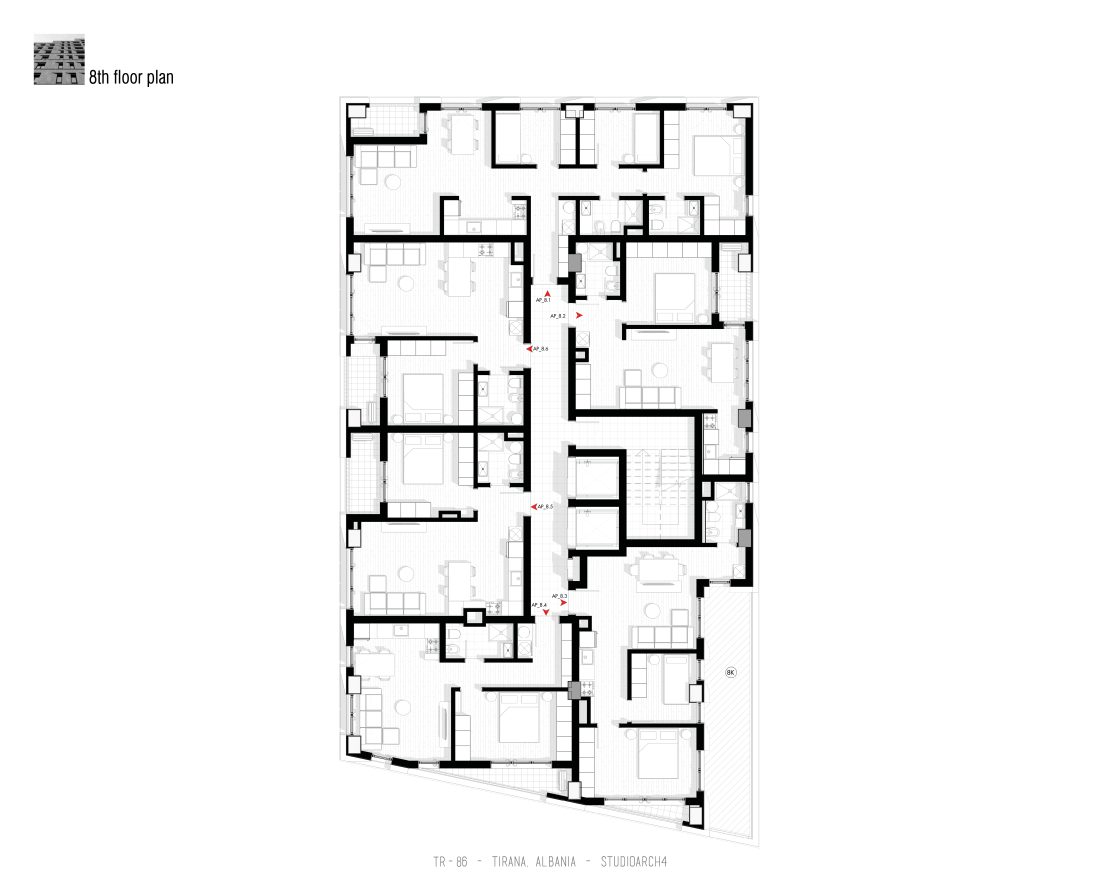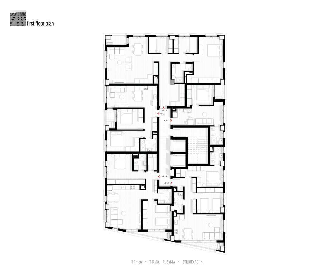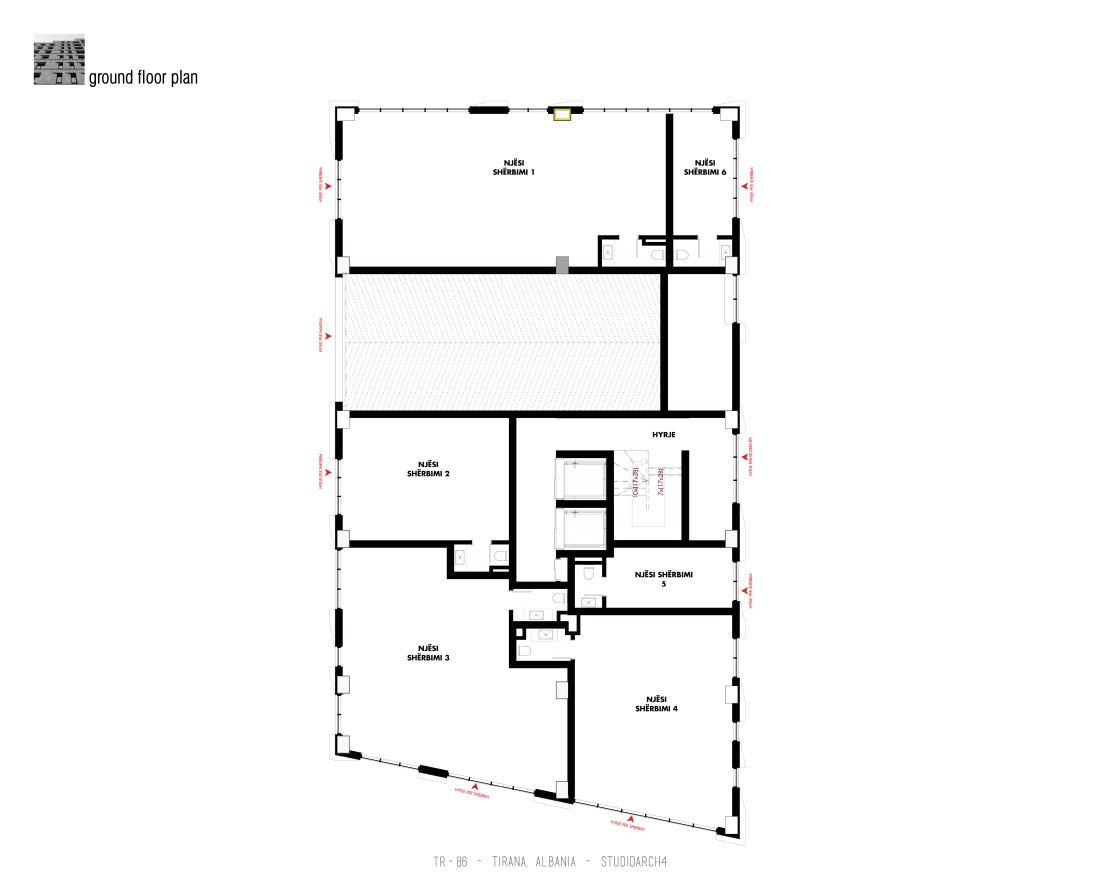 Kati përdhe akomodon hapësirat e shërbimit, ndërsa njësitë e banimit fillojnë në katin e parë deri në katin