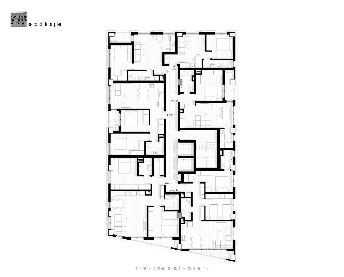 The ground floor accommodates the service spaces, while the residential units start from the first floor to the