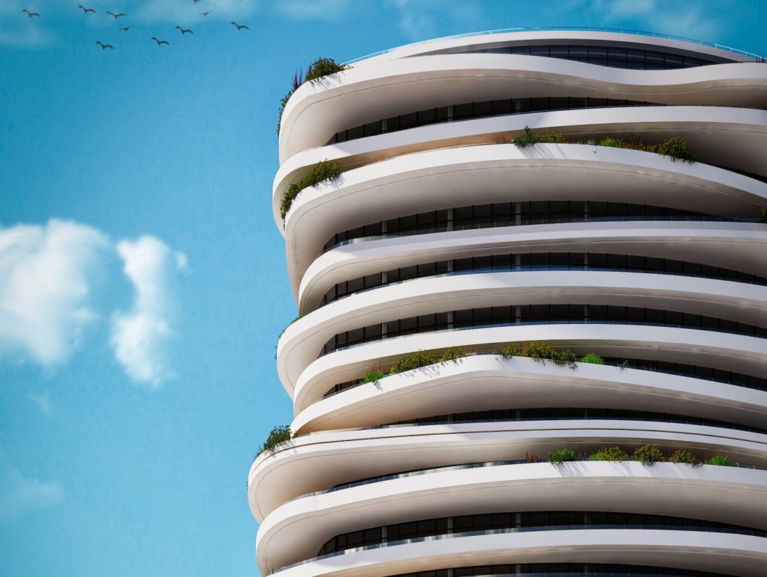 The elegant triangular base and arched facades create an organic volume that adapts to the characteristics of the site, giving the building a unique and harmonious appearance with the surrounding environment. The curved terraces add fluidity and dynamism to the façade, creating captivating effects that change depending on the light and atmospheric conditions.