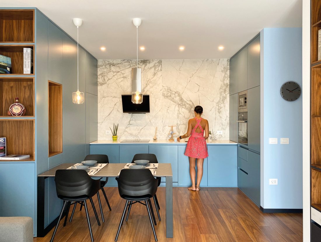 The color palette of the apartment is dominated by earth tones, which blend harmoniously to create a warm and lively atmosphere, giving each space a sense of stability and tranquility. Natural materials, such as wood and stone, are combined with the furniture’s, featuring clean, straight lines highlighting the essence of minimalist style and ensuring a sophisticated and refined look. These modern, functional and aesthetic elements create a contemporary apartment.