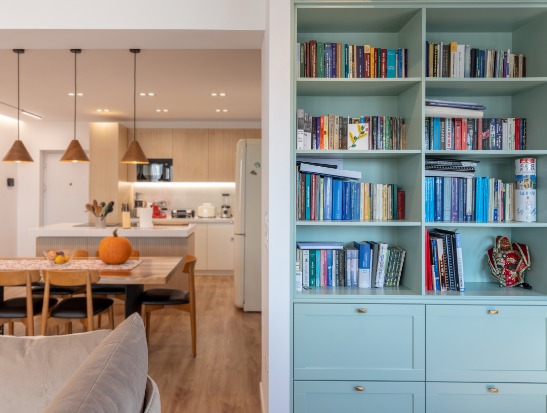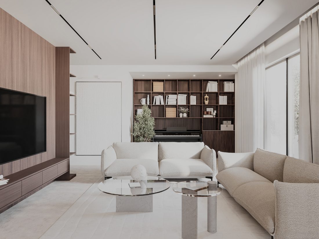 This apartment is designed in a minimalist style to create functional and comfortable spaces, ideal for fulfilling the needs of a family. With a clear zoning, each space is organized in order to maximize functionality. The living area consists of the living room with a study area {library and piano), the kitchen and the dinning area. The bedrooms are separated from it by a corridor that includes the sanitary facilities and the laundry room.