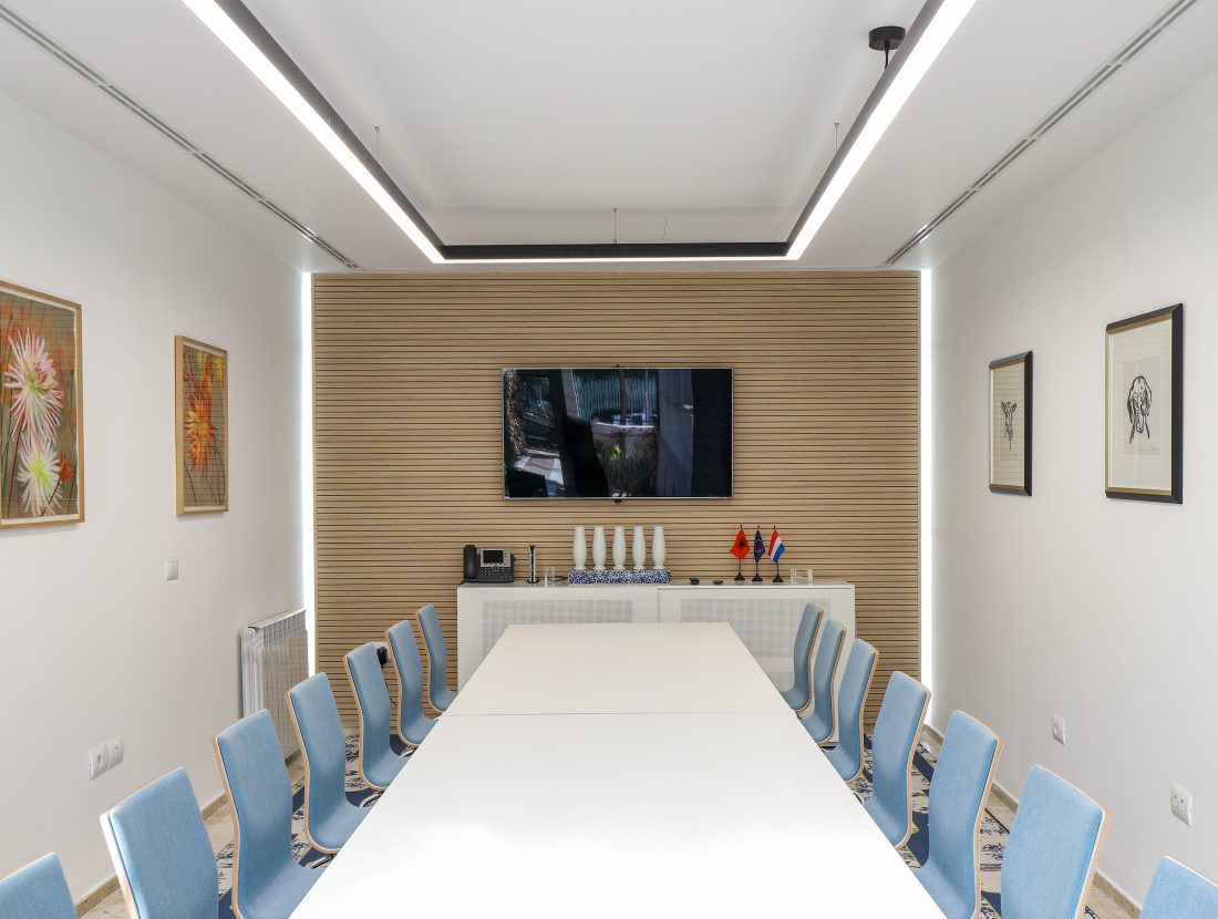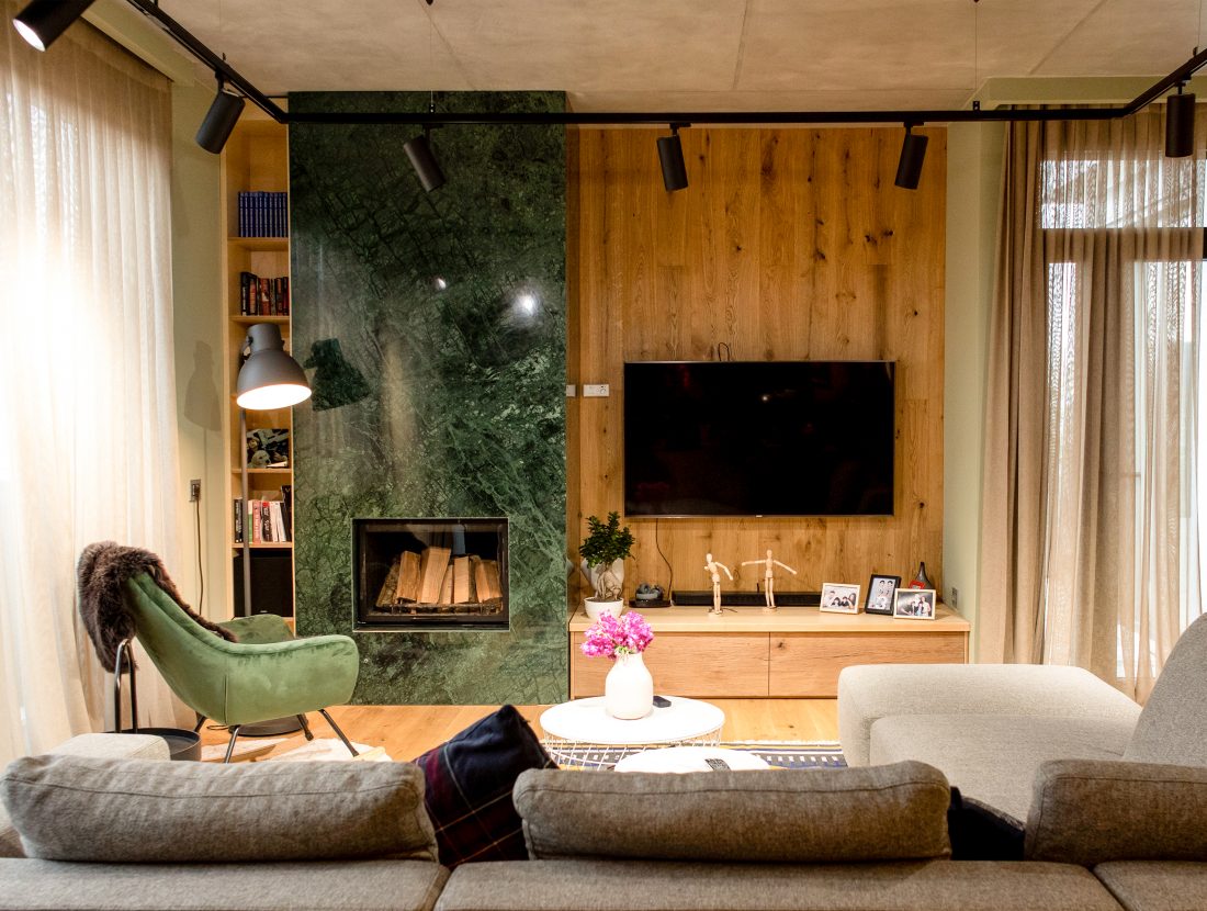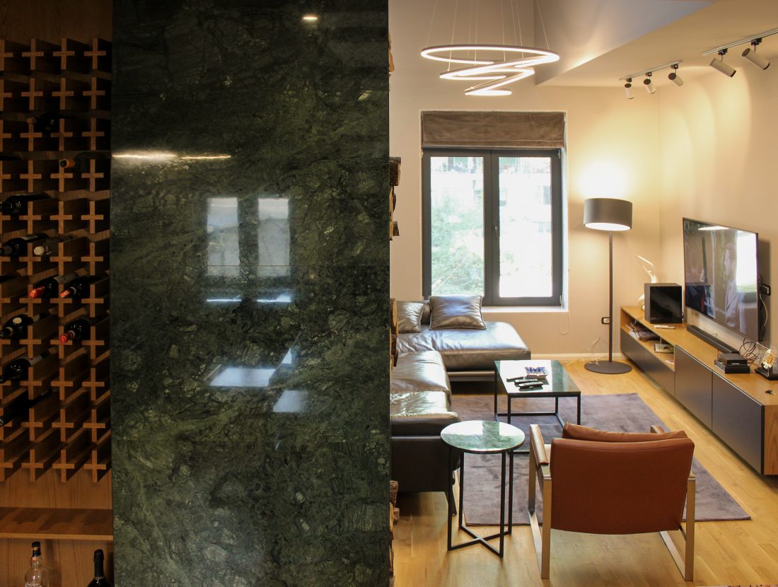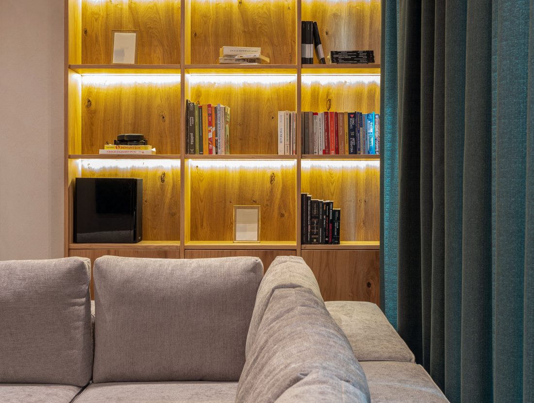The apartment has an area of 158 m2, fitting for a 3+1 typology The functions include the living room and the kitchen, 3 bedrooms, one of which has a “walk-in” closet, and 2 bathrooms. The apartment has strong visual elements in the materialization of its furniture and accessories. The furniture are treated with oak wood, which presents a warm color in the interior palette that easily combines with the selected wood flooring. The accessories of the apartment, such as frames, paintings and curtains are in cool colors to create a contrast with the warmth created by the colors of the furniture and wood flooring. As for the furniture, the concept of exposed shelves is applied in the corridor as well as in the living room. Lighting is also a personifying element of the apartment, where we see a combination of spotlights, pendant lamps and ceiling and wall rails. The latter are composed complementing each other by creating continuous strips on the plaster walls – which emphasizes the attention to the specific areas of the apartment.