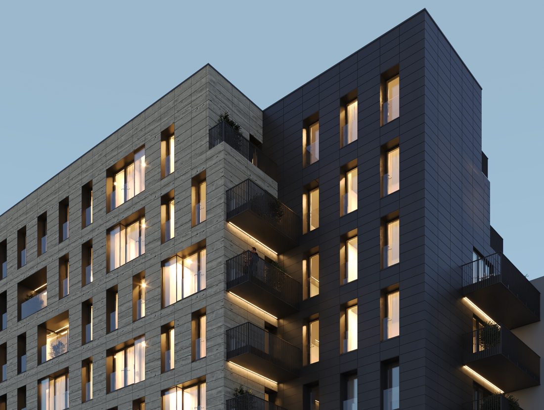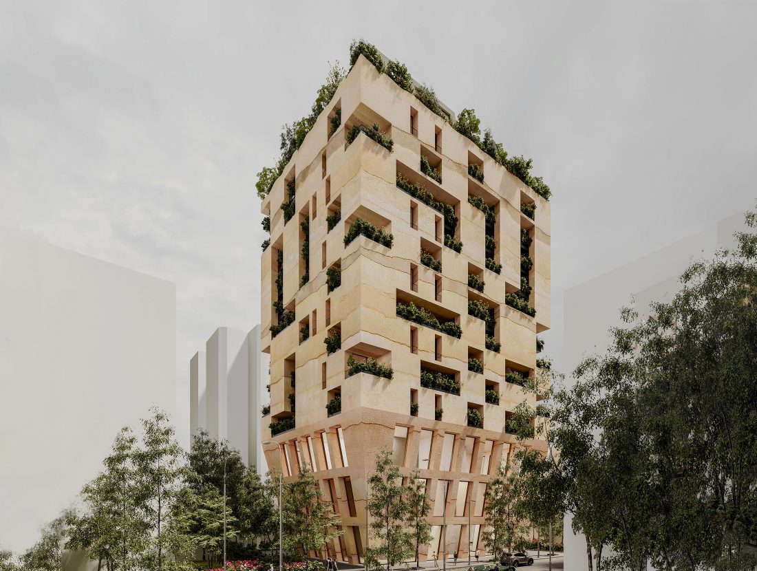 The elegant triangular base and arched facades create an organic volume that adapts to the characteristics of the site, giving the building a unique and harmonious appearance with the surrounding environment. The curved terraces add fluidity and dynamism to the façade, creating captivating effects that change depending on the light and atmospheric conditions.