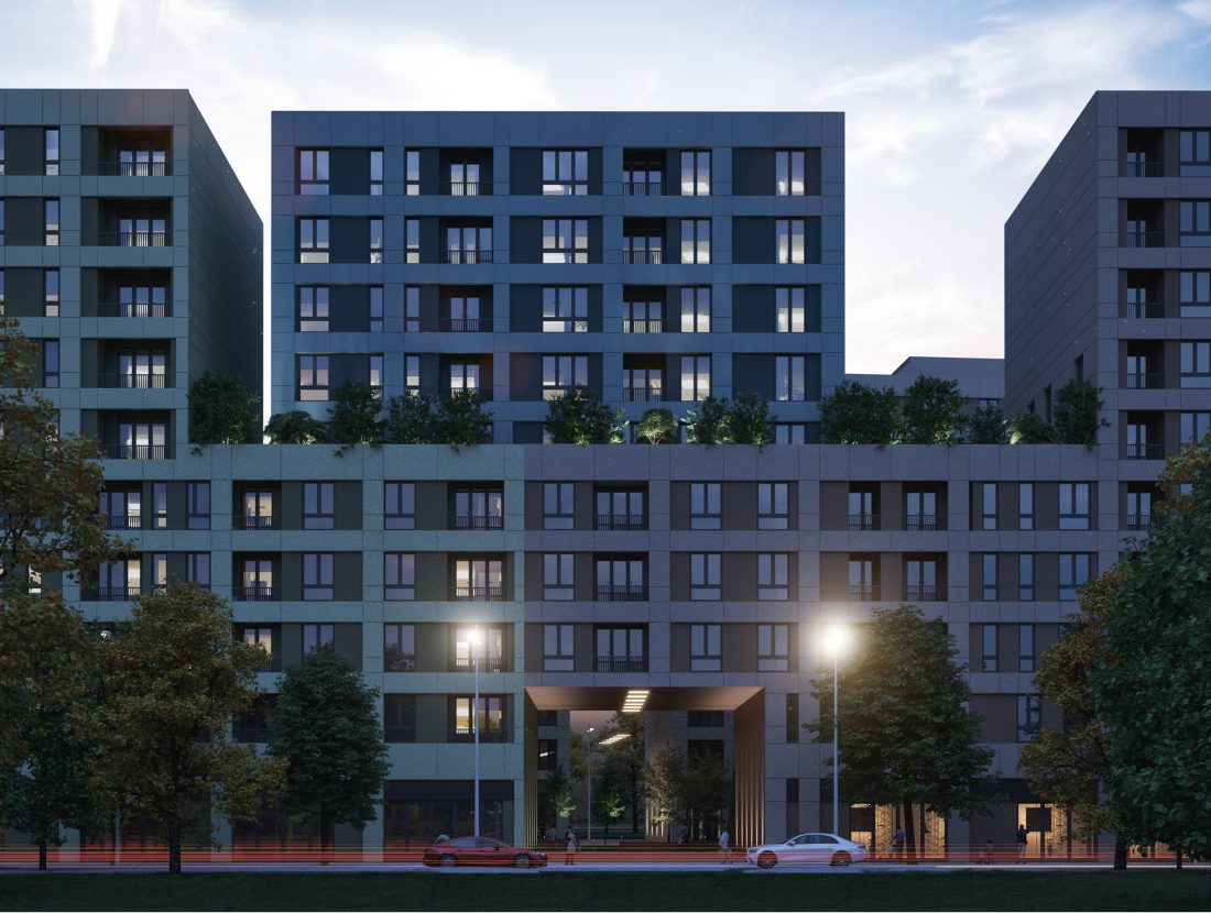 Forma elegante e ndërtesës me bazë trekëndore dhe faqe të harkuara krijon një volumetri organike që përshtatet me karakteristikat e truallit, duke i dhënë asaj një pamje unike dhe harmonike me ambientin përreth. Verandat e lakuara shtojnë fluiditet dhe dinamikë në fasadë, duke krijuar një efekte tërheqëse, që ndryshojnë në varësi të dritës dhe kushteve atmosferike.