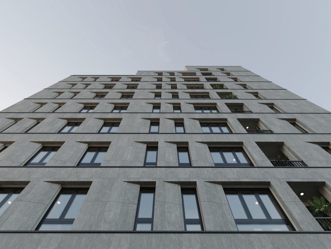 Fasada është e veshur me xhama vertikalë të vazhduar dhe elemente metalike, që sigurojnë ndriçim natyral brenda ndërtesës dhe ofrojnë pamje panoramike të mrekullueshme nga çdo kat. Ky dizajn jo vetëm që mundëson lidhje të ngushtë me jashtësinë, por gjithashtu rrit efikasitetin energjetik të ndërtesës.