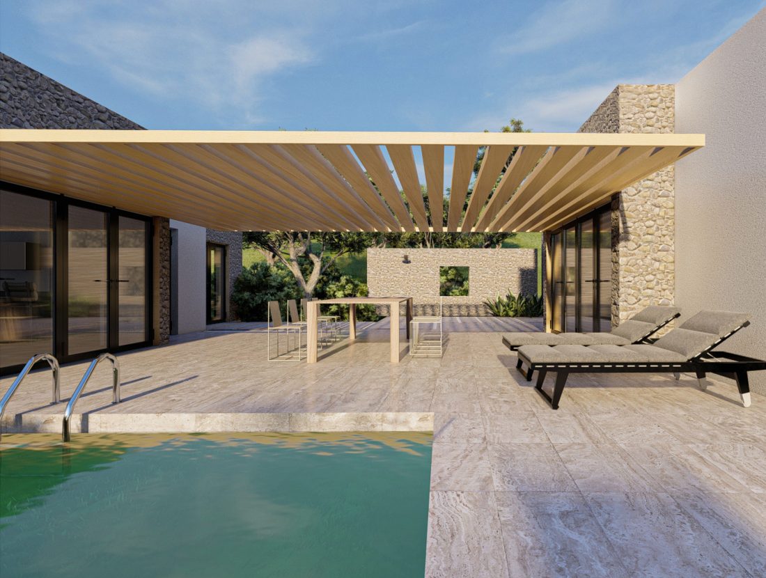 This project consists of a series of villas and a hotel located in the village of Dhërmi, in South Albania. The project aims to connect the design brief, a touristic resort, to the location, which is a very steep hill overlooking the sea. Therefore, the concept of villas and a separate hotel was born. The design derives from the old village of Dhërmi, which is rooted in vernacular architecture. The streets connecting the villas provide green squares for the residents. The materials used are stone, white plaster, and light wood for shade. There are five types of villas: a) the cozy, b)the medium, c) the big, d) the luxury, and e) the families villa- in cases there’s more than one family vacationing together. Special attention is paid to the outdoor space of each villa to have a pool and green terrace. This outdoor space is confined by small segments of stone walls, recalling the local architecture. These walls provide privacy while sunbathing or using the private pool but are equipped with openings for direct sea views. The interiors of the villas have white plaster walls, arch openings, and large windows for natural light. Each villa has a kitchen and dining, large living and bedrooms to accommodate the needs of the residents for a long-term stay. The distribution of the villas takes advantage of the steep terrain to provide sea views and mixing the villas enhances the community feeling of the place. To have a smaller footprint, the hotel divides into three volumes. Each volume has a primary function: restaurant, bar, rooms for guests, and service areas. The hotel’s pool is on a higher view than the other hotel volumes enabling a direct view from the pool to the sea.