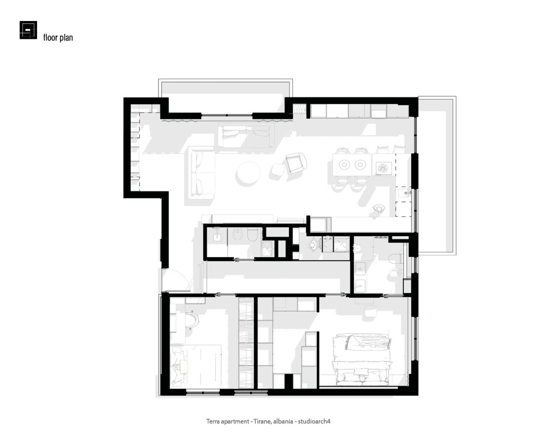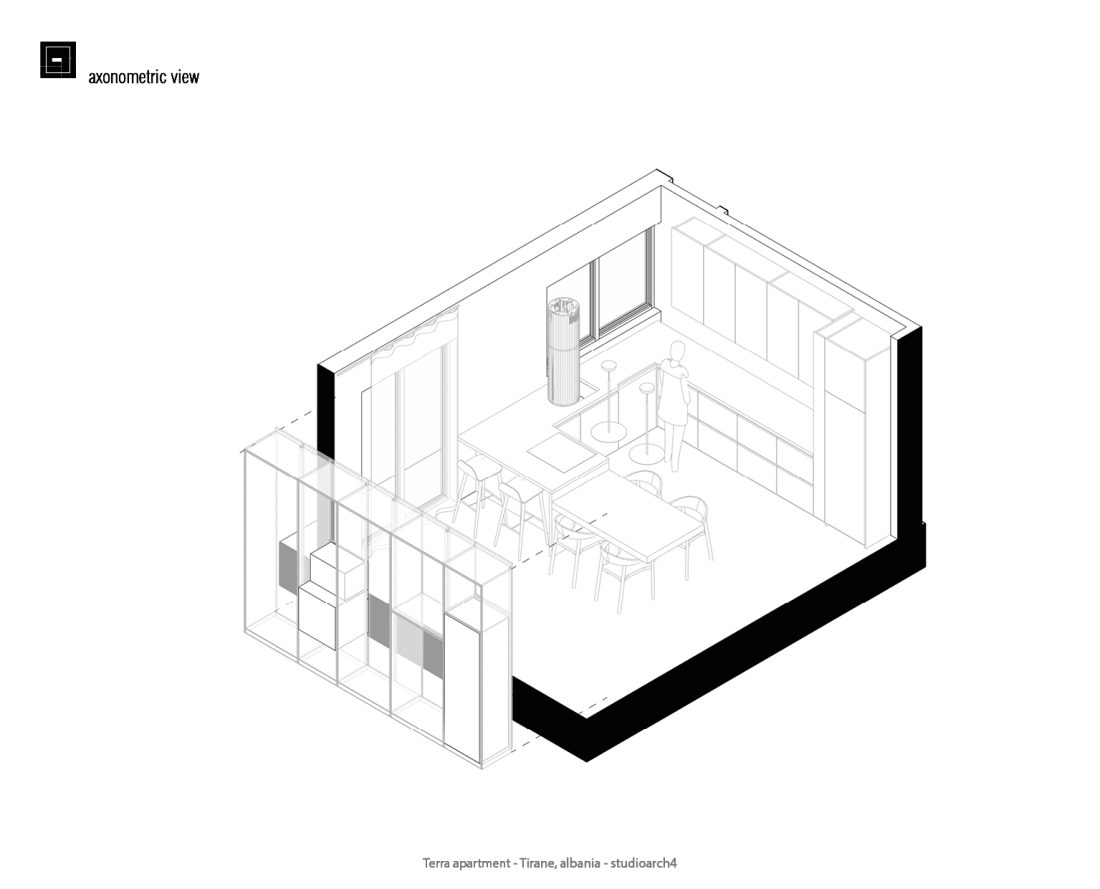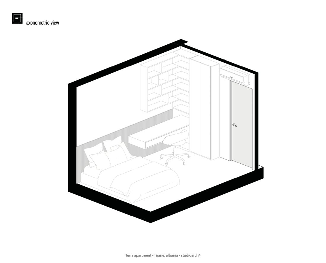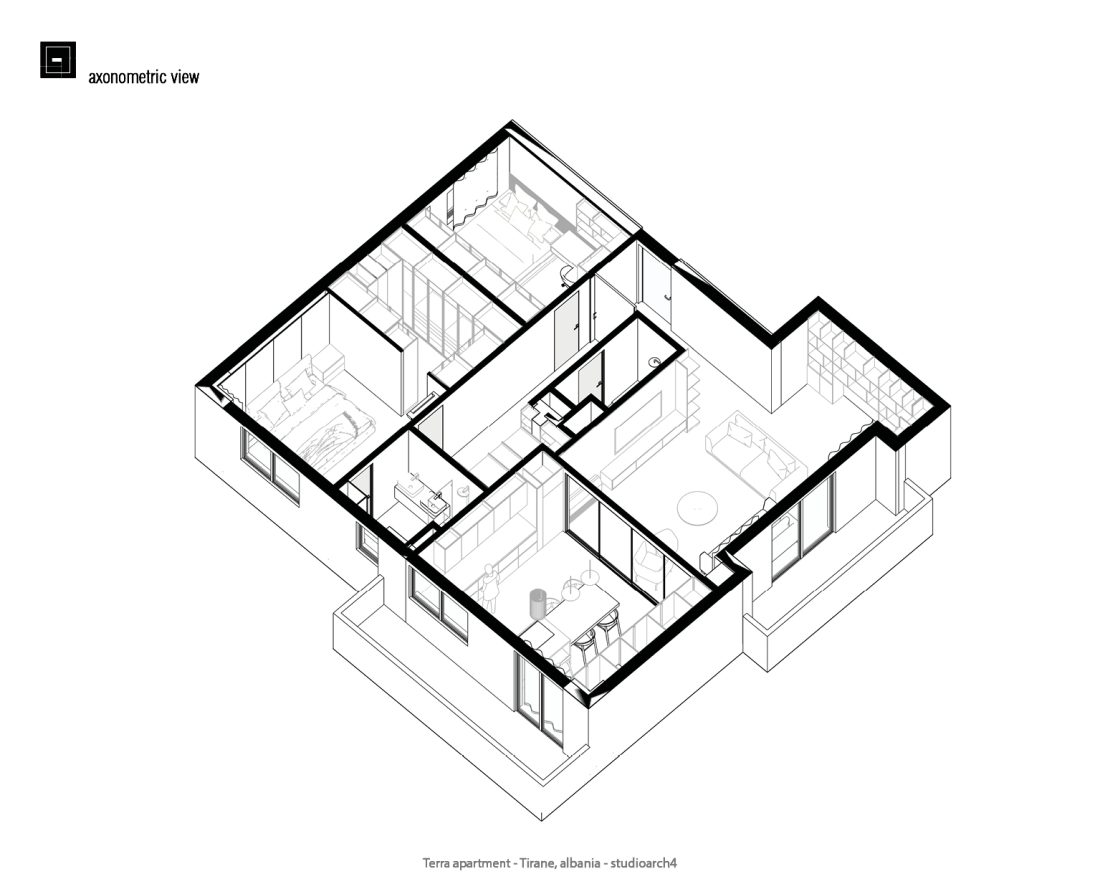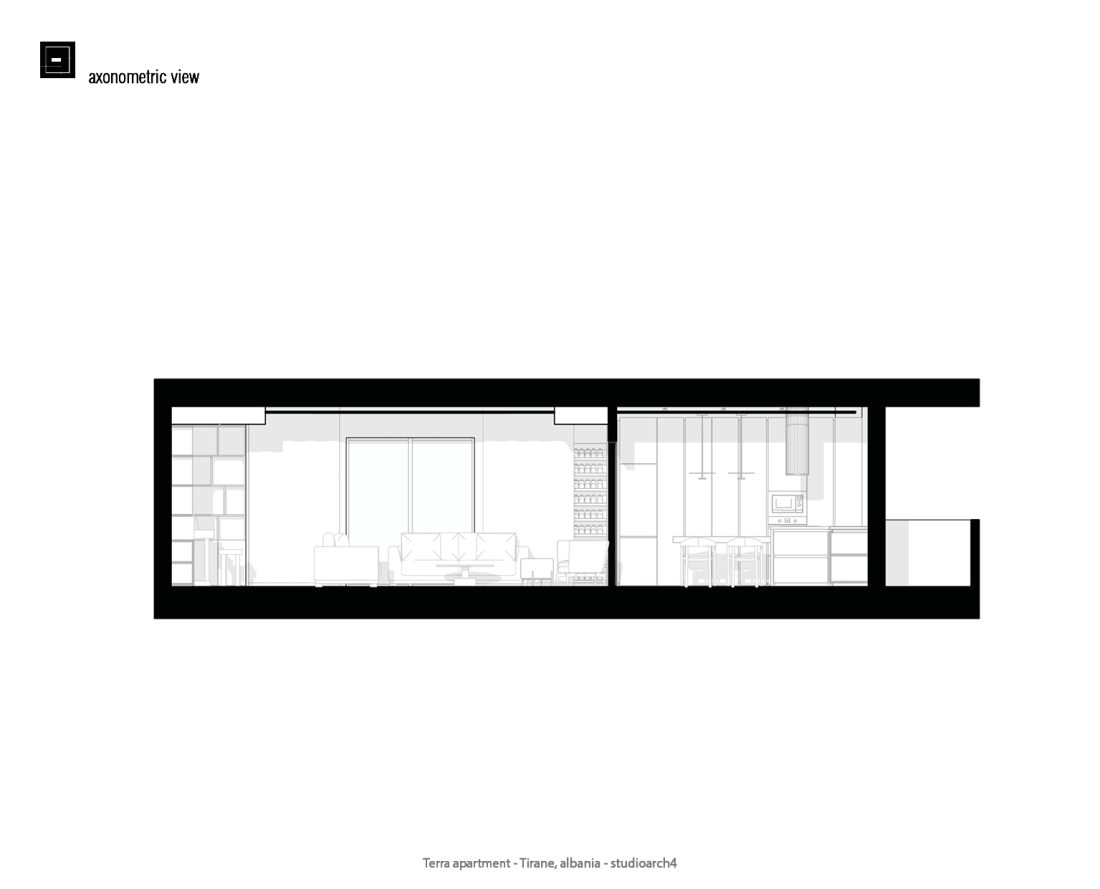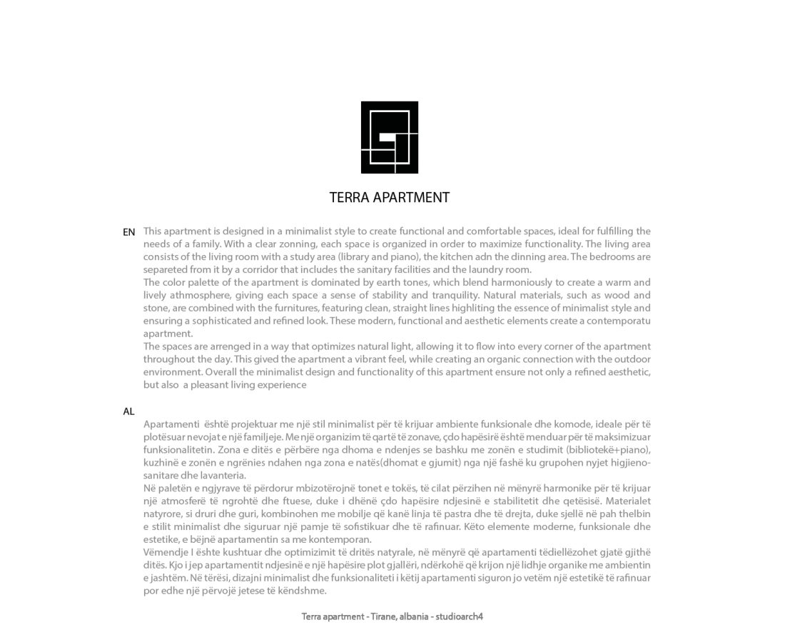 Apartamenti eshte projektuar me nje stilminimalist per te krijuar ambiente funksionale dhe komode,ideale per te plotesuar nevojate njefamiljeje. Menjeorganizimteqarte tezonave, do hapesireeshte menduar per te maksimizuar funksional itetin. Zona e dites e perbere nga dhoma e ndenjes se bashku me zonen e studimit (biblioteke+piano}, kuzhine e zonen e ngrenies ndahen nga zona e nates(dhomat e gjumit) nga nje fashe ku grupohen nyjet higjieno sanitare dhe lavanteria.