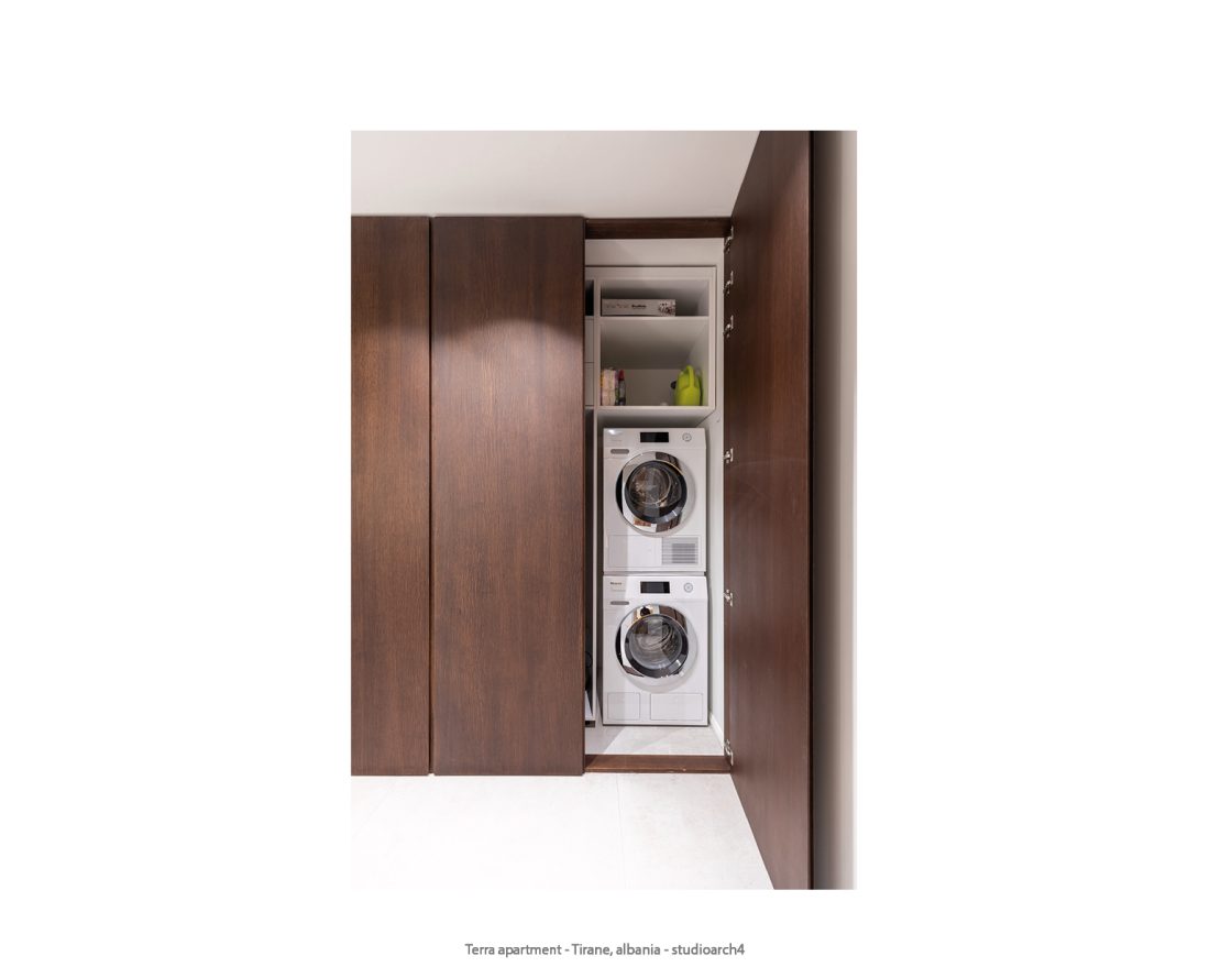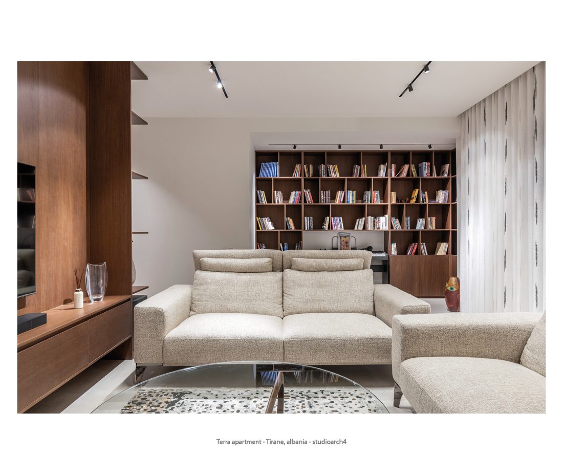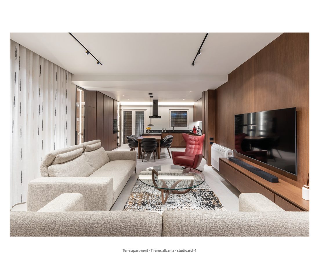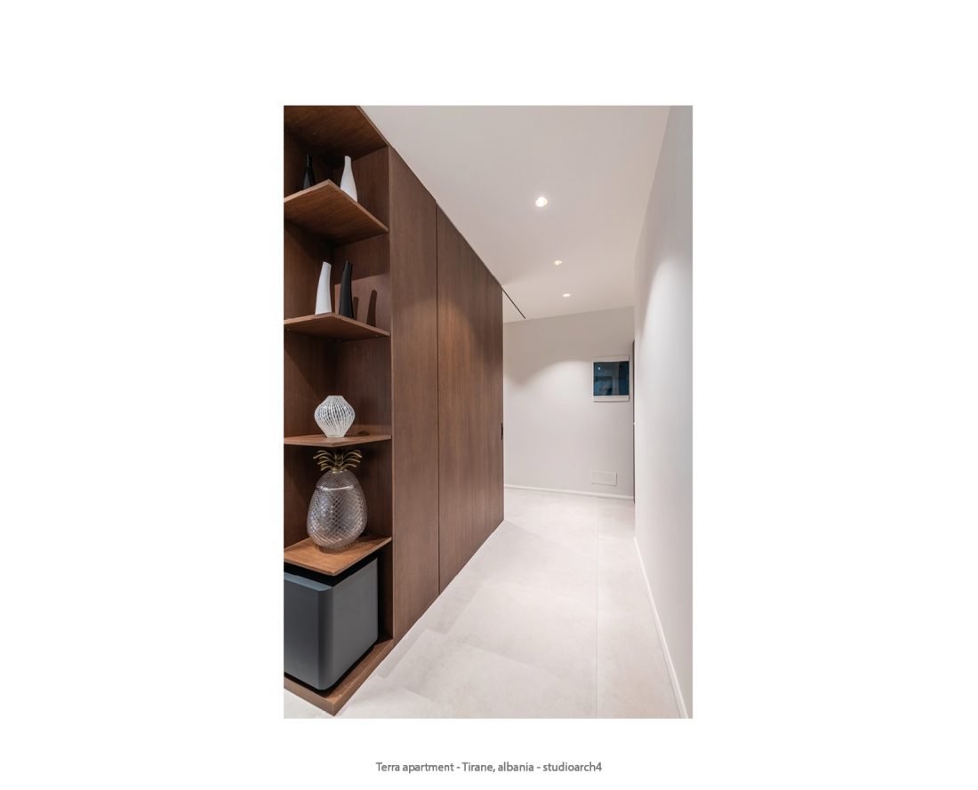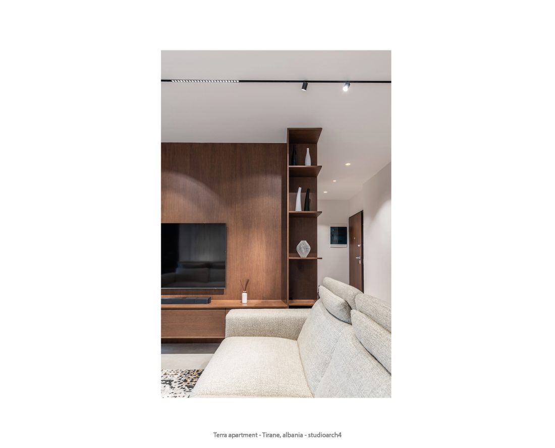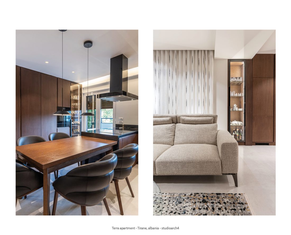 The color palette of the apartment is dominated by earth tones, which blend harmoniously to create a warm and lively atmosphere, giving each space a sense of stability and tranquility. Natural materials, such as wood and stone, are combined with the furniture’s, featuring clean, straight lines highlighting the essence of minimalist style and ensuring a sophisticated and refined look. These modern, functional and aesthetic elements create a contemporary apartment.