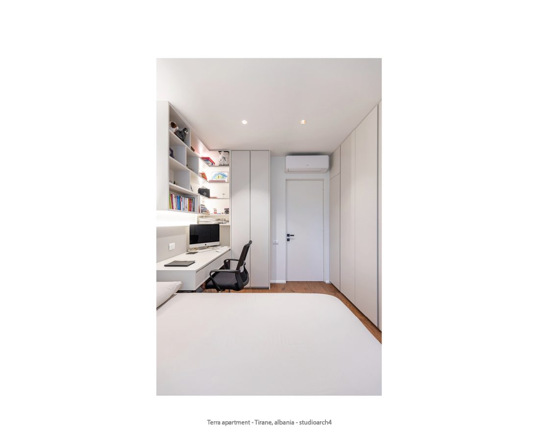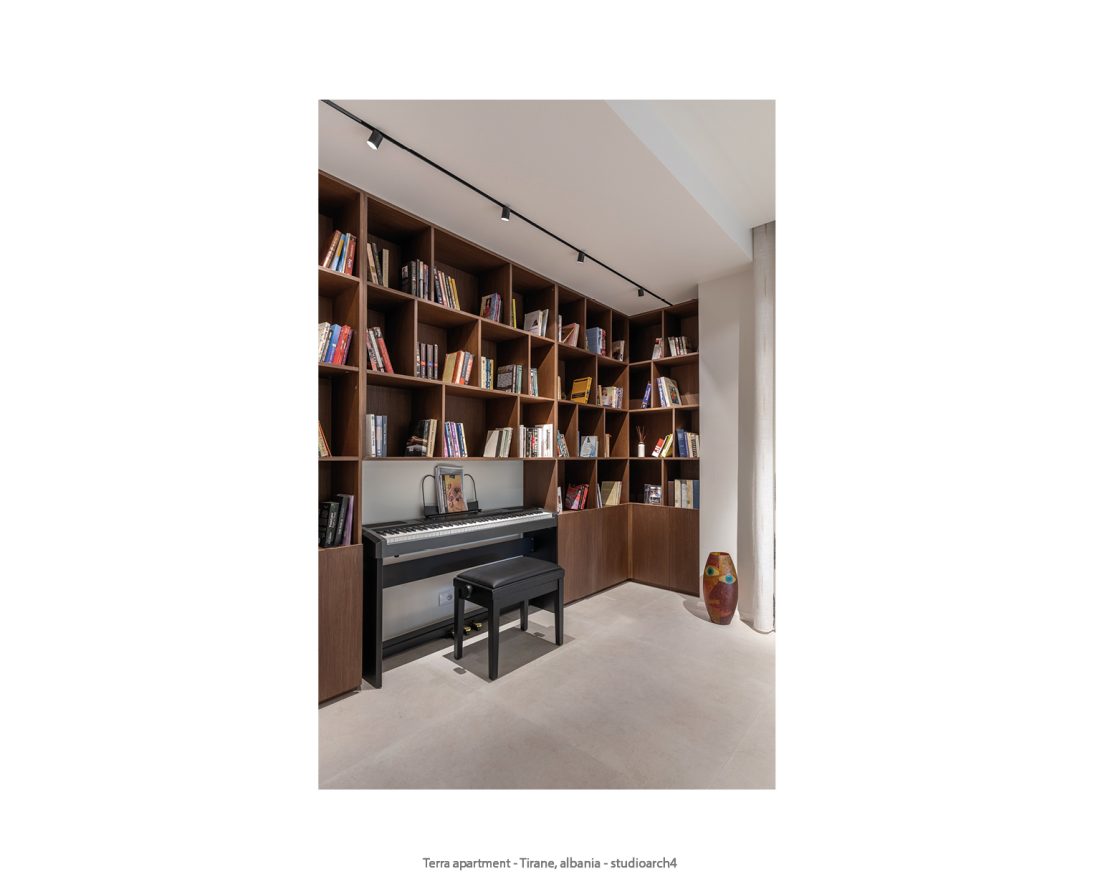 This apartment is designed in a minimalist style to create functional and comfortable spaces, ideal for fulfilling the needs of a family. With a clear zoning, each space is organized in order to maximize functionality. The living area consists of the living room with a study area {library and piano), the kitchen and the dinning area. The bedrooms are separated from it by a corridor that includes the sanitary facilities and the laundry room.