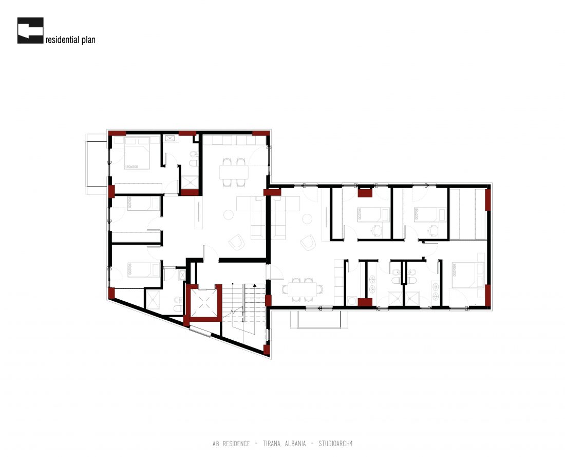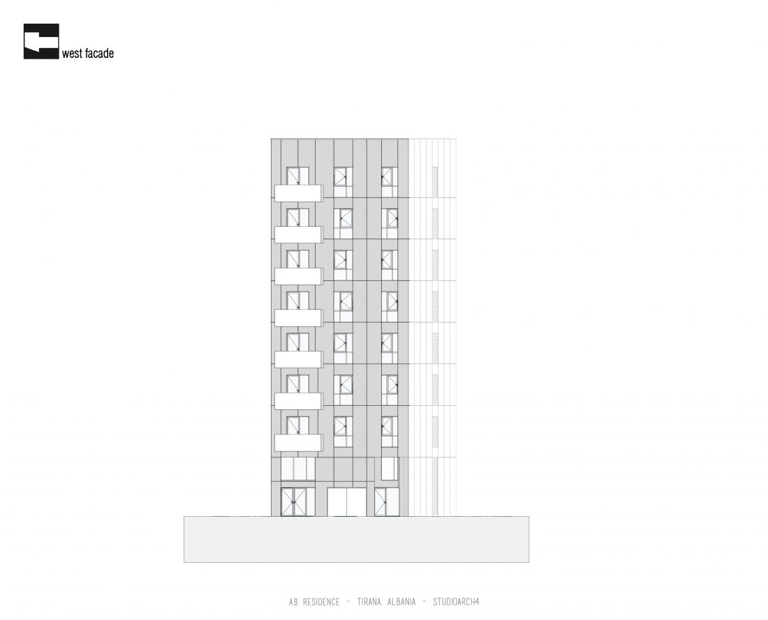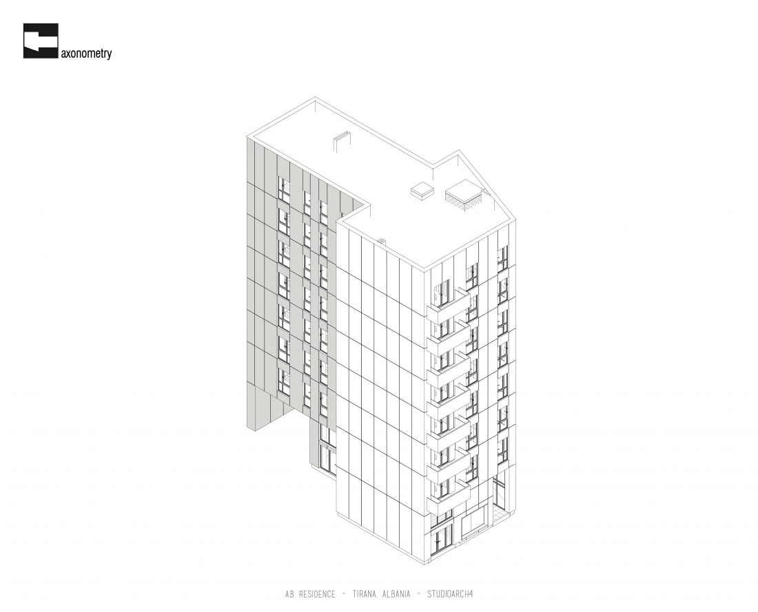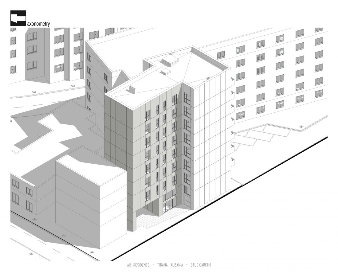 Rezidenca AB është një godinë tetë katëshe me dy kate parkimi nëntokë dhe ndodhet pranë rrugës ‘Pjetër Budi’. Neë katin përdhe janë pozicionuar shëbimet ndersa katet e tjera kane funksion rezidencial me nga dy apartamente në kat.