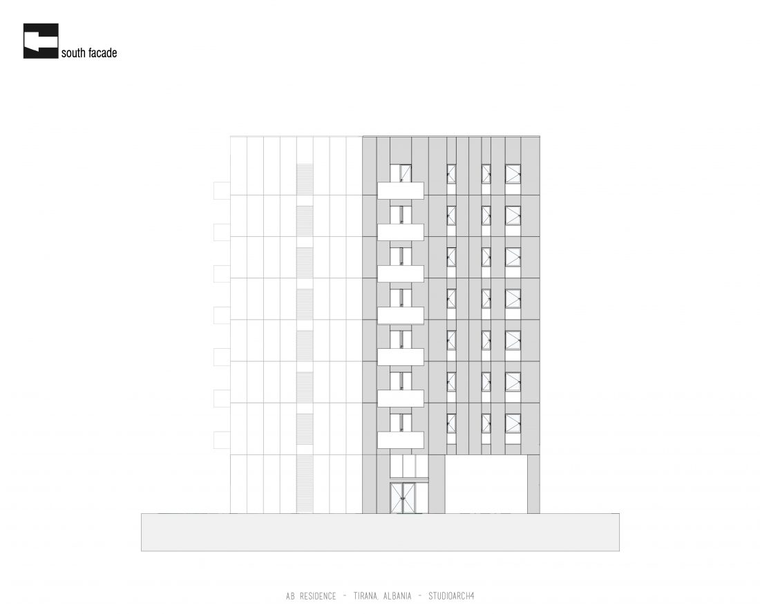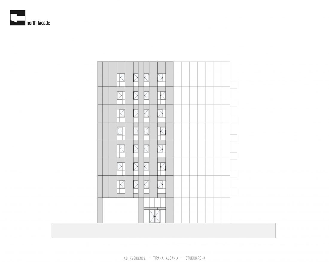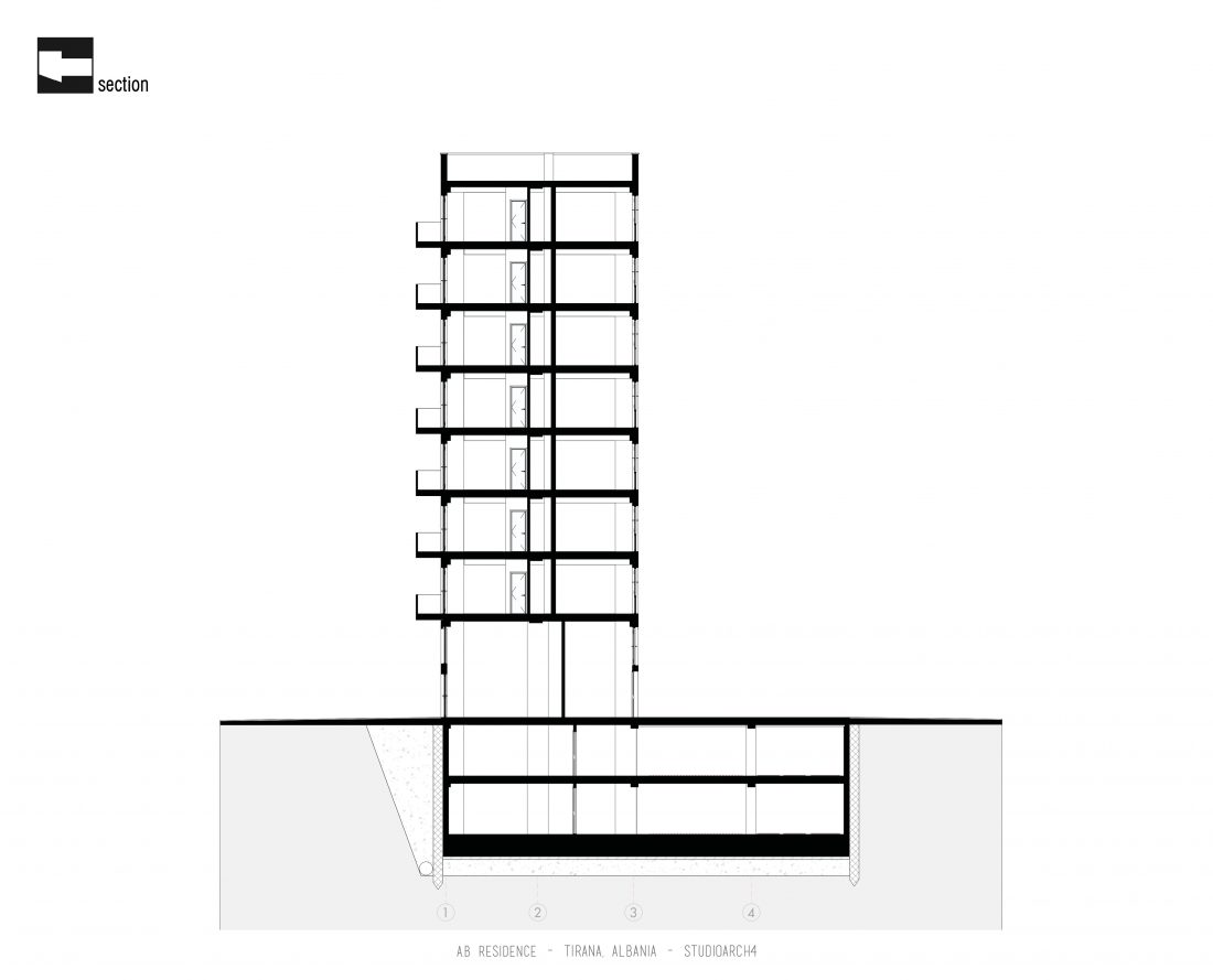 AB Residence is an eight-storey building with two underground parking floors and is located near Pjeter Budi Street. Services are positioned on the ground floor while the other storeys are residential with two apartments on each floor.