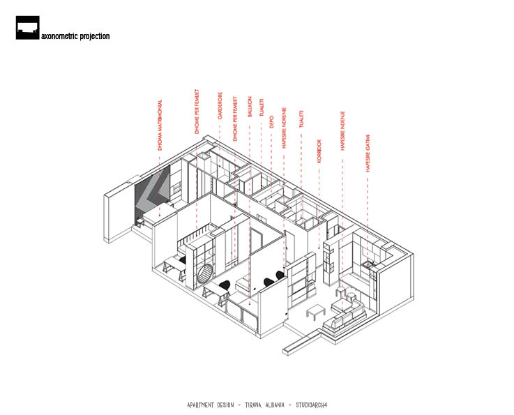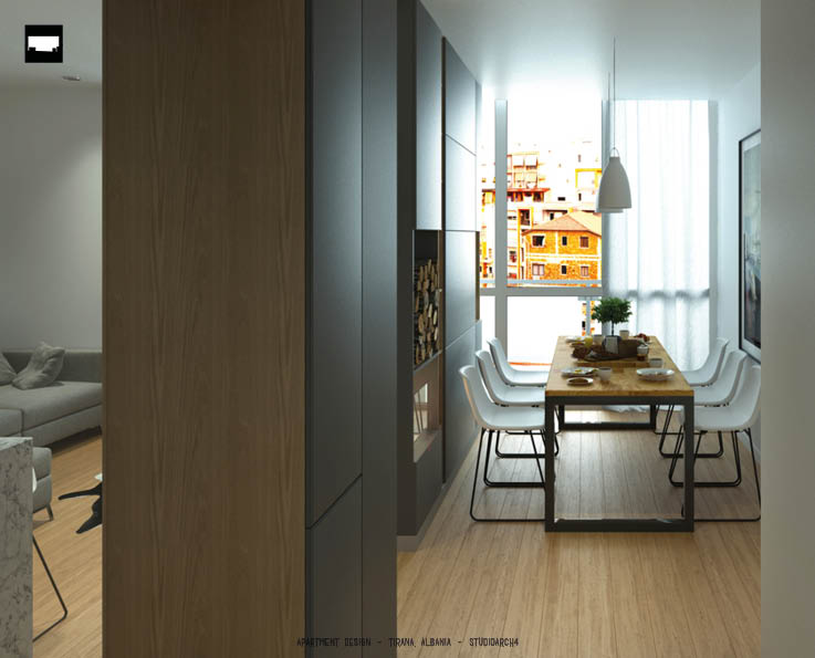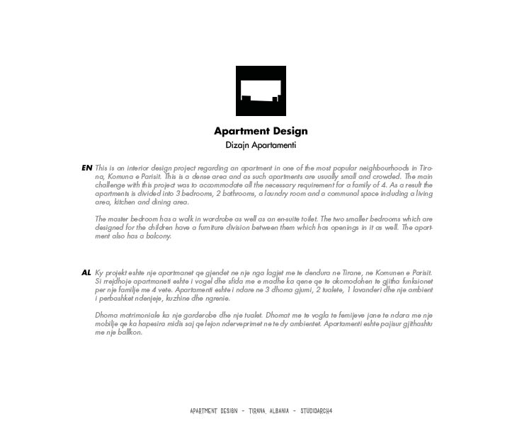 Ky projekt eshte nje apartmanet qe gjendet ne nje nga lagjet me te dendura ne Tirane, ne Komunen e Parisit. Si rrejdhoje apartmaneti eshte i vogel dhe sfida me e madhe ka qene qe te akomodohen te gjitha funksionet per nje familje me 4 vete. Apartamenti eshte i ndare ne 3 dhoma gjumi, 2 tualete, 1 lavanderi dhe nje ambient i perbashket ndenjeje, kuzhine dhe ngrenie.