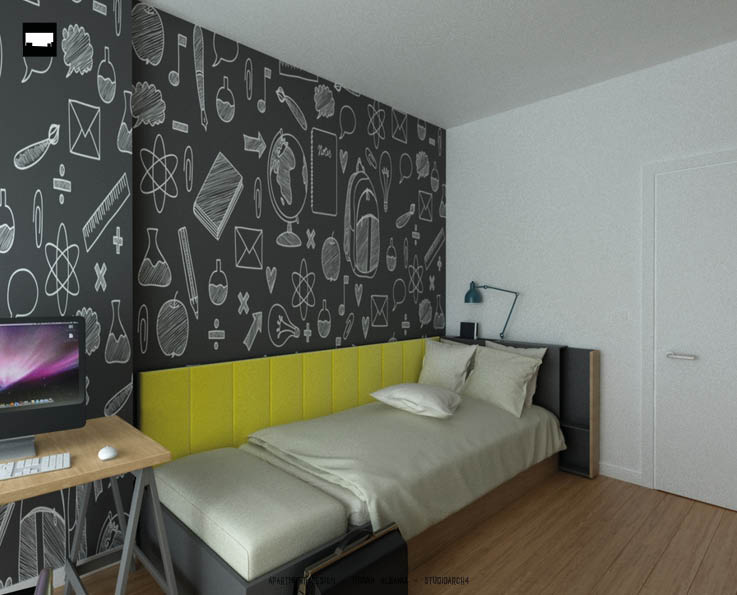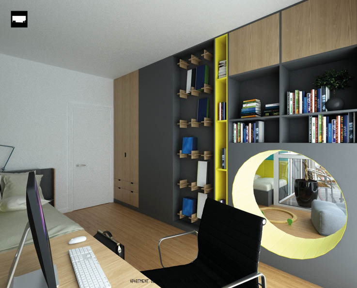 Dhoma matrimoniale ka nje garderobe dhe nje tualet. Dhomat me te vogla te femijeve jane te ndara me nje mobilje qe ka hapesira midis saj qe lejon nderveprimet ne te dy ambientet. Apartamenti eshte pajisur gjithashtu me nje ballkon.
