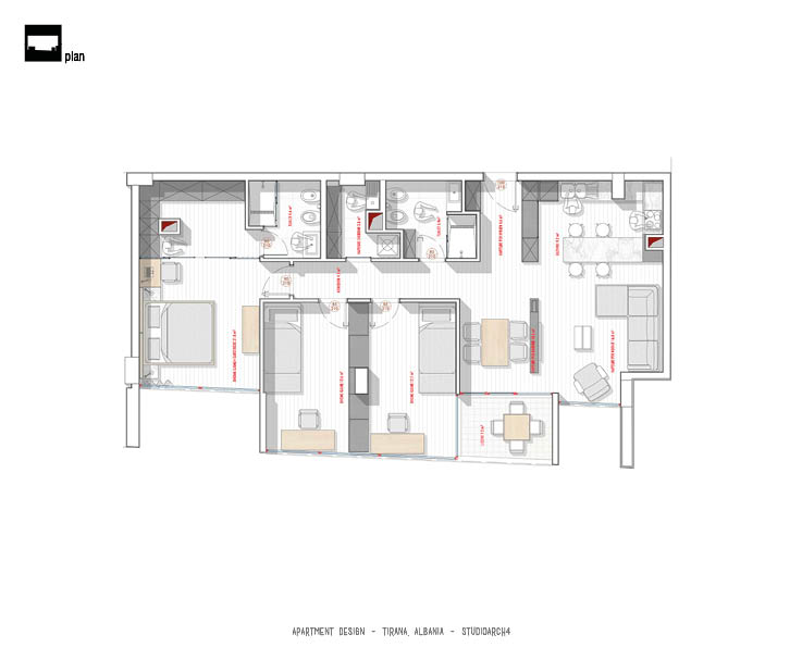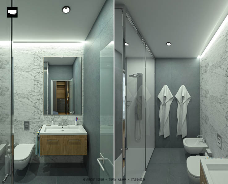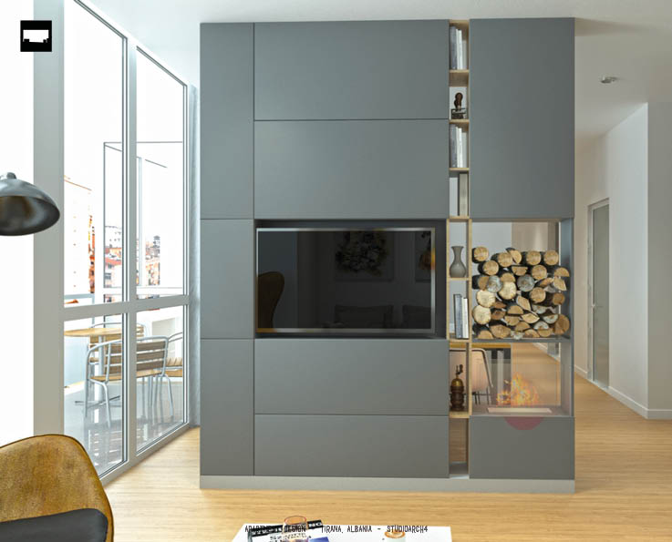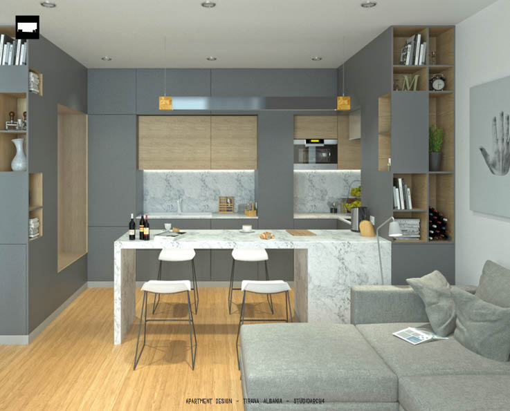 This is an interior design project regarding an apartment in one of the most popular neighbourhoods in Tirana, Komuna e Parisit. This is a dense area and as such apartments are usually small and crowded. The main challenge with this project was to accommodate all the necessary requirement for a family of 4. As a result the apartments is divided into 3 bedrooms, 2 bathrooms, a laundry room and a communal space including a living area, kitchen and dining area.