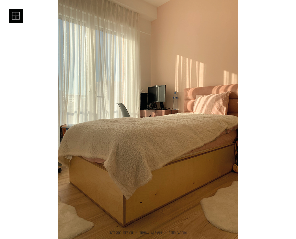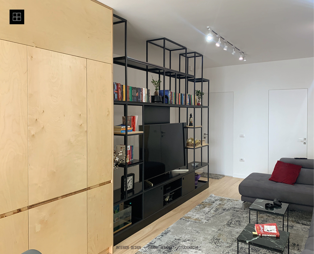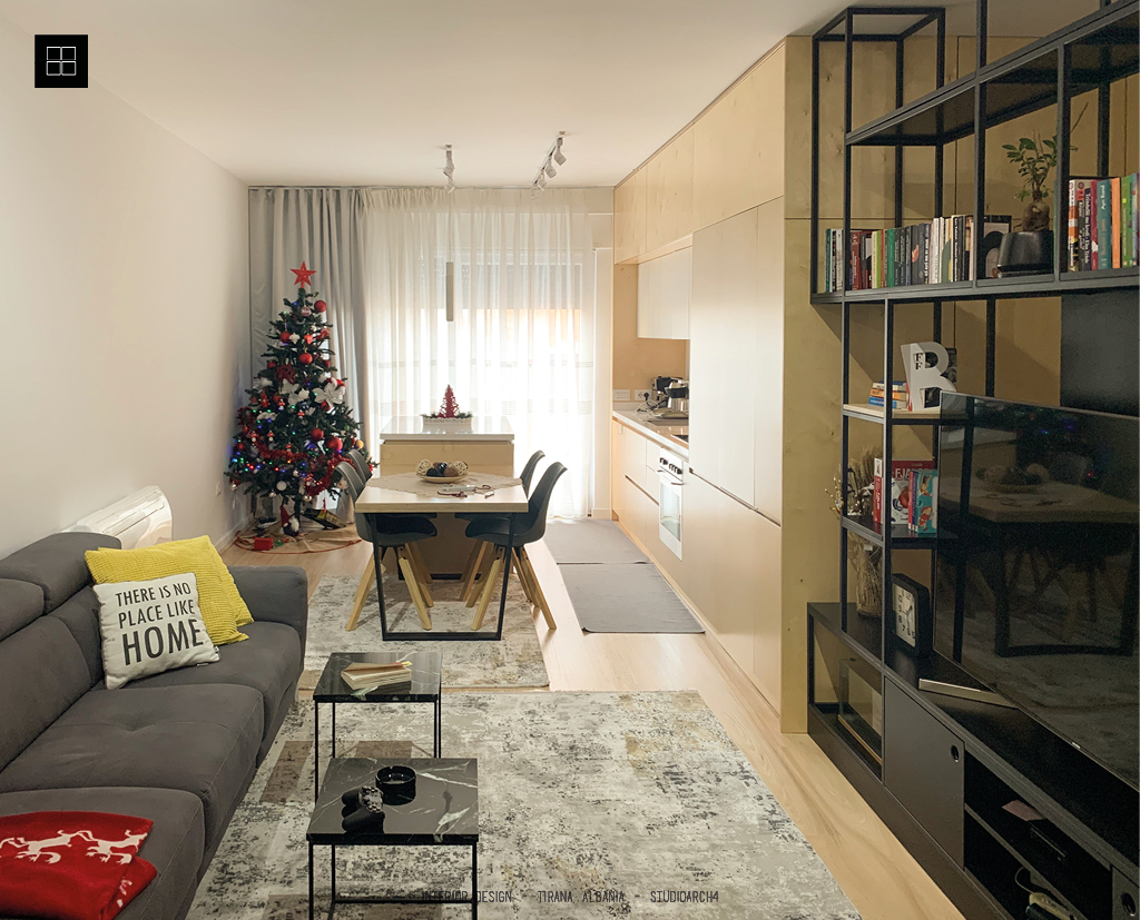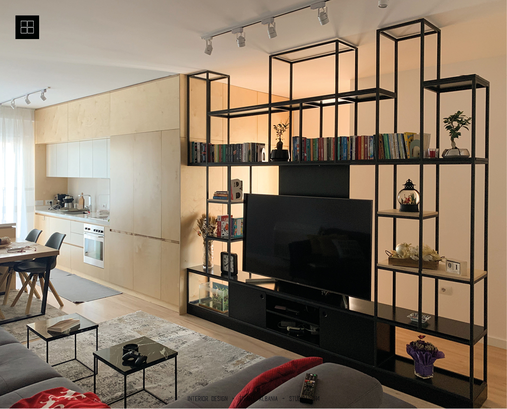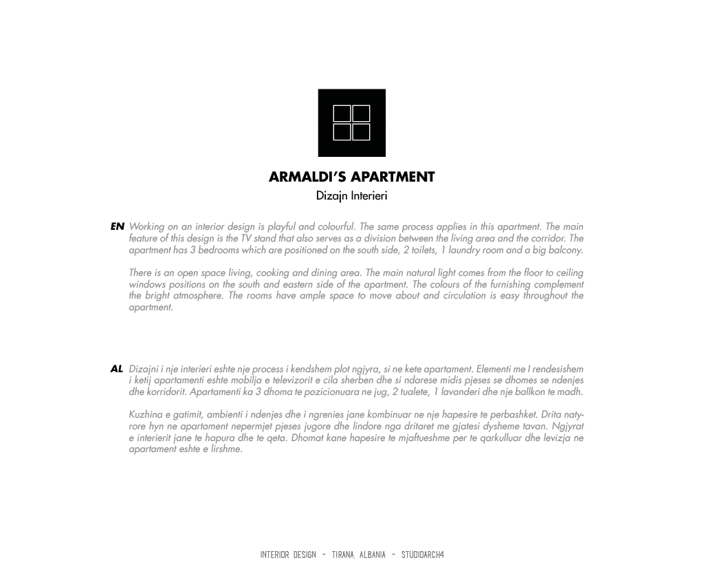Dizajni i nje interieri eshte nje process i kendshem plot ngjyra, si ne kete apartament. Elementi me I rendesishem i ketij apartamenti eshte mobilja e televizorit e cila sherben dhe si ndarese midis pjeses se dhomes se ndenjes dhe korridorit. Apartamenti ka 3 dhoma te pozicionuara ne jug, 2 tualete, 1 lavanderi dhe nje ballkon te madh.