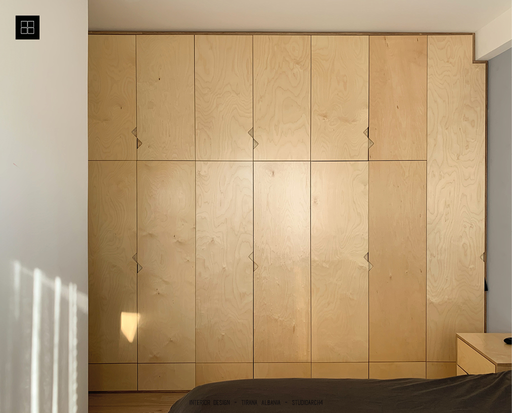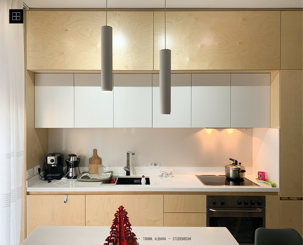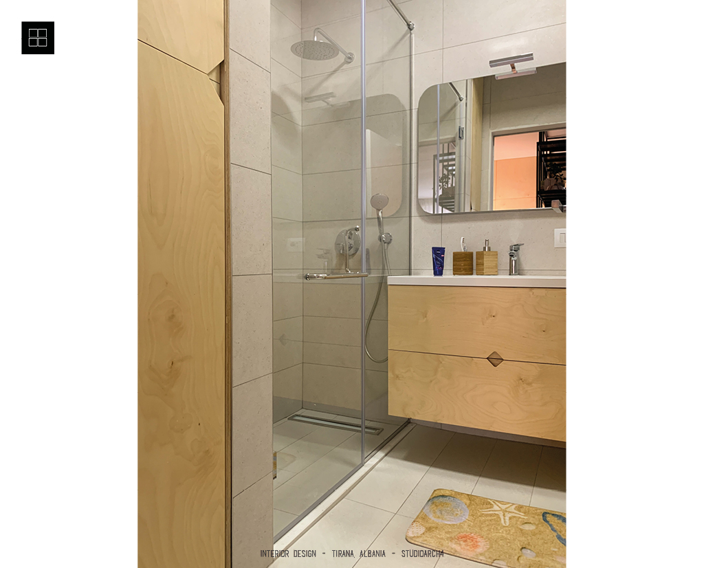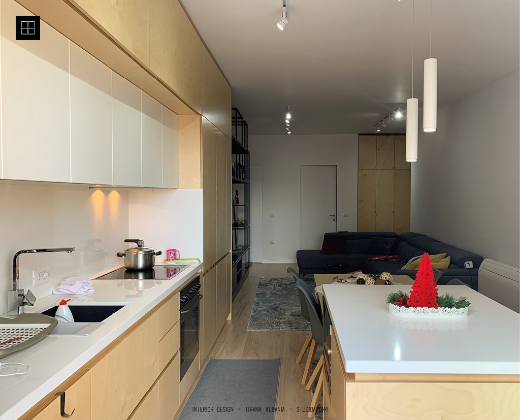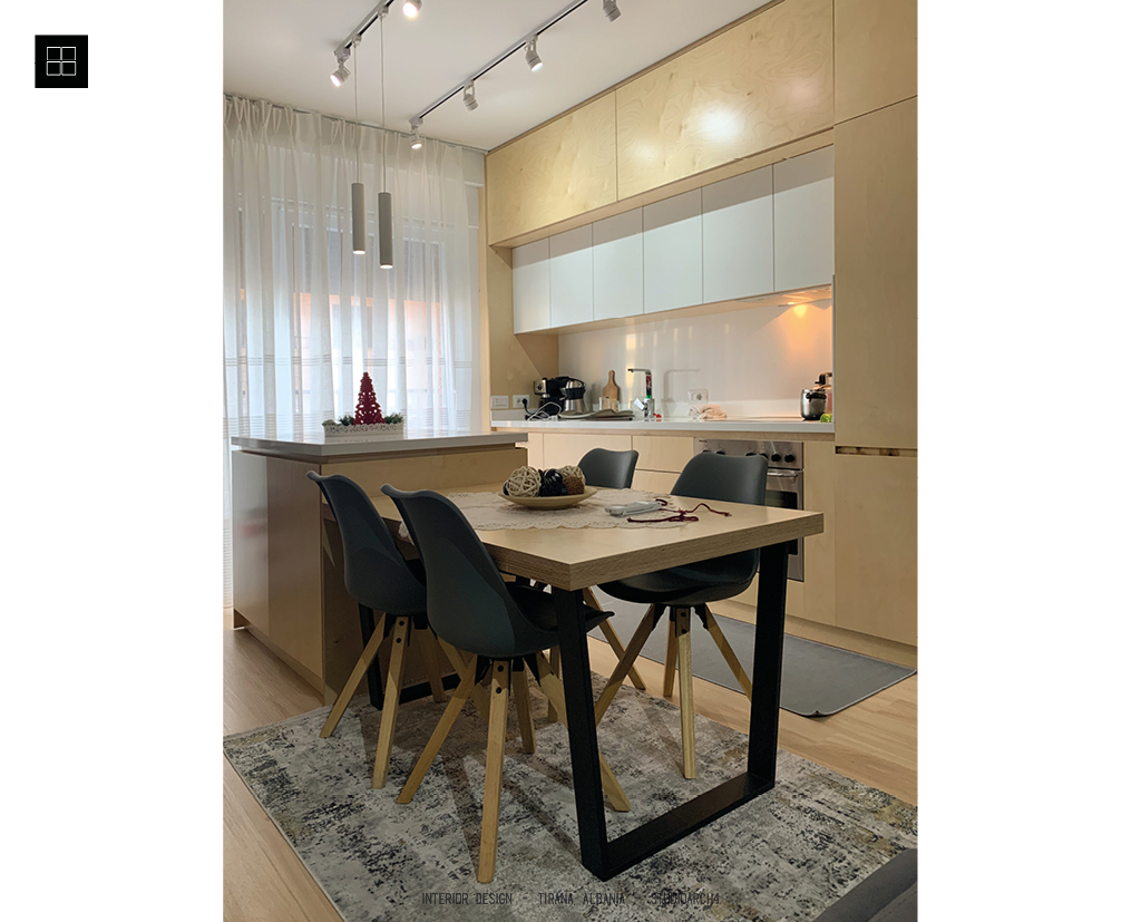 Kuzhina e gatimit, ambienti i ndenjes dhe i ngrenies jane kombinuar ne nje hapesire te perbashket. Drita natyrore hyn ne apartament nepermjet pjeses jugore dhe lindore nga dritaret me gjatesi dysheme tavan. Ngjyrat e interierit jane te hapura dhe te qeta. Dhomat kane hapesire te mjaftueshme per te qarkulluar dhe levizja ne apartament eshte e lirshme.