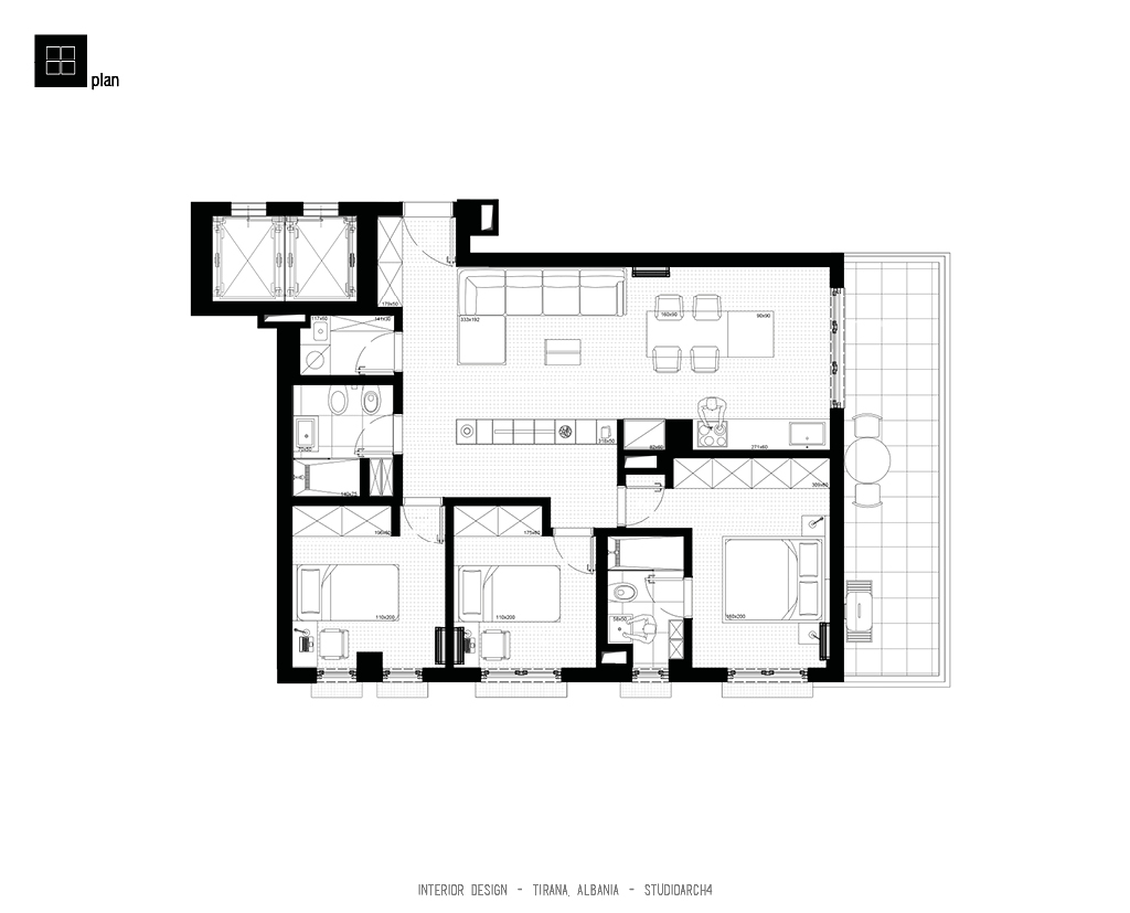 Working on an interior design is playful and colourful. The same process applies in this apartment. The main feature of this design is the TV stand that also serves as a division between the living area and the corridor. The apartment has 3 bedrooms which are positioned on the south side, 2 toilets, 1 laundry room and a big balcony.