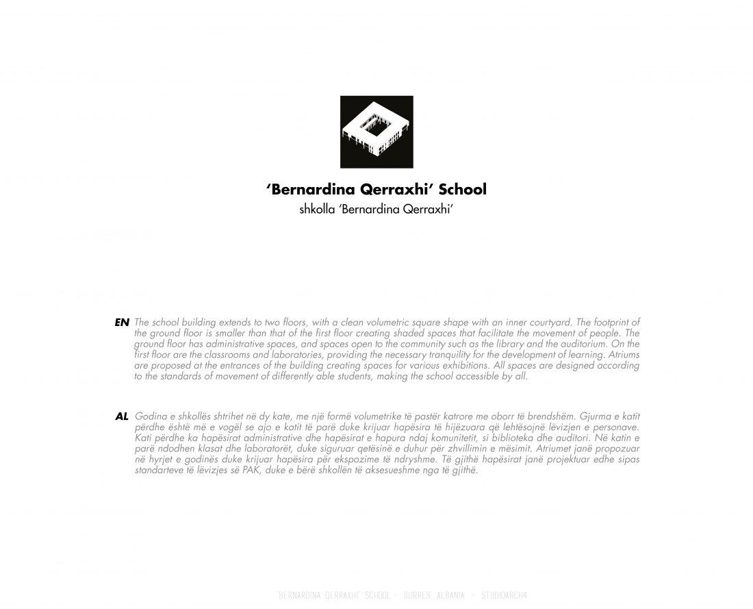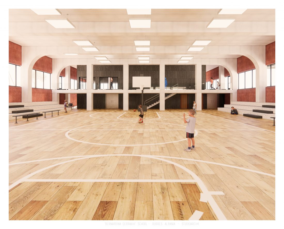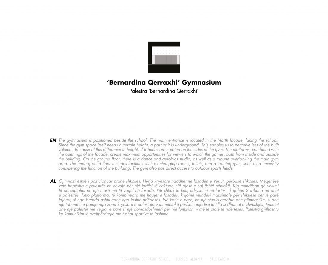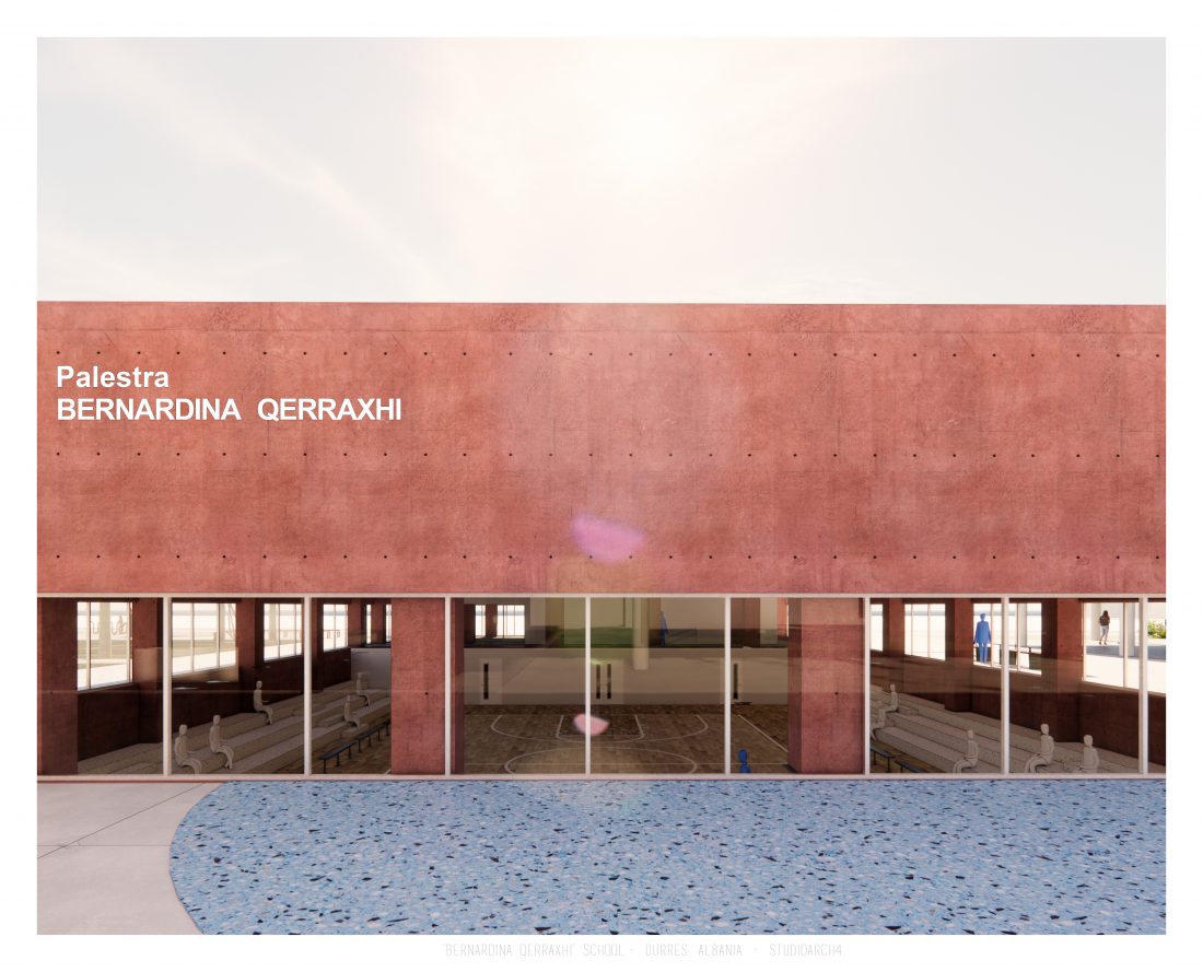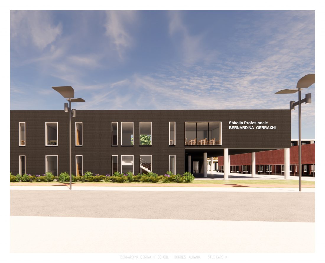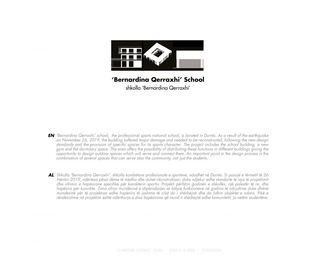 Shkolla ‘Bernardina Qerraxhi’, shkolla kombëtare profesionale e sporteve, ndodhet në Durrës. Si pasojë e tërmetit të 26 Nëntor 2019, ndërtesa pësoi dëme të mëdha dhe duhet rikonstruktuar, duke ndjekur edhe standarte të reja të projektimit dhe ofrimin e hapësirave specifike për karakterin sportiv. Projekti përfshin godinën e shkollës, një palestër të re, dhe hapësira për konvikte. Zona ofron mundësinë e shpërndarjes së këtyre funksioneve në godina të ndryshme duke dhënë mundësinë për të projektuar edhe hapësira të jashtme të cilat do i shërbejnë dhe do lidhin objektet e ndara. Pikë e rëndësishme në projektim është ndërthurja e disa hapësirave që mund ti shërbejnë edhe komunitetit, jo vetëm studentëve.