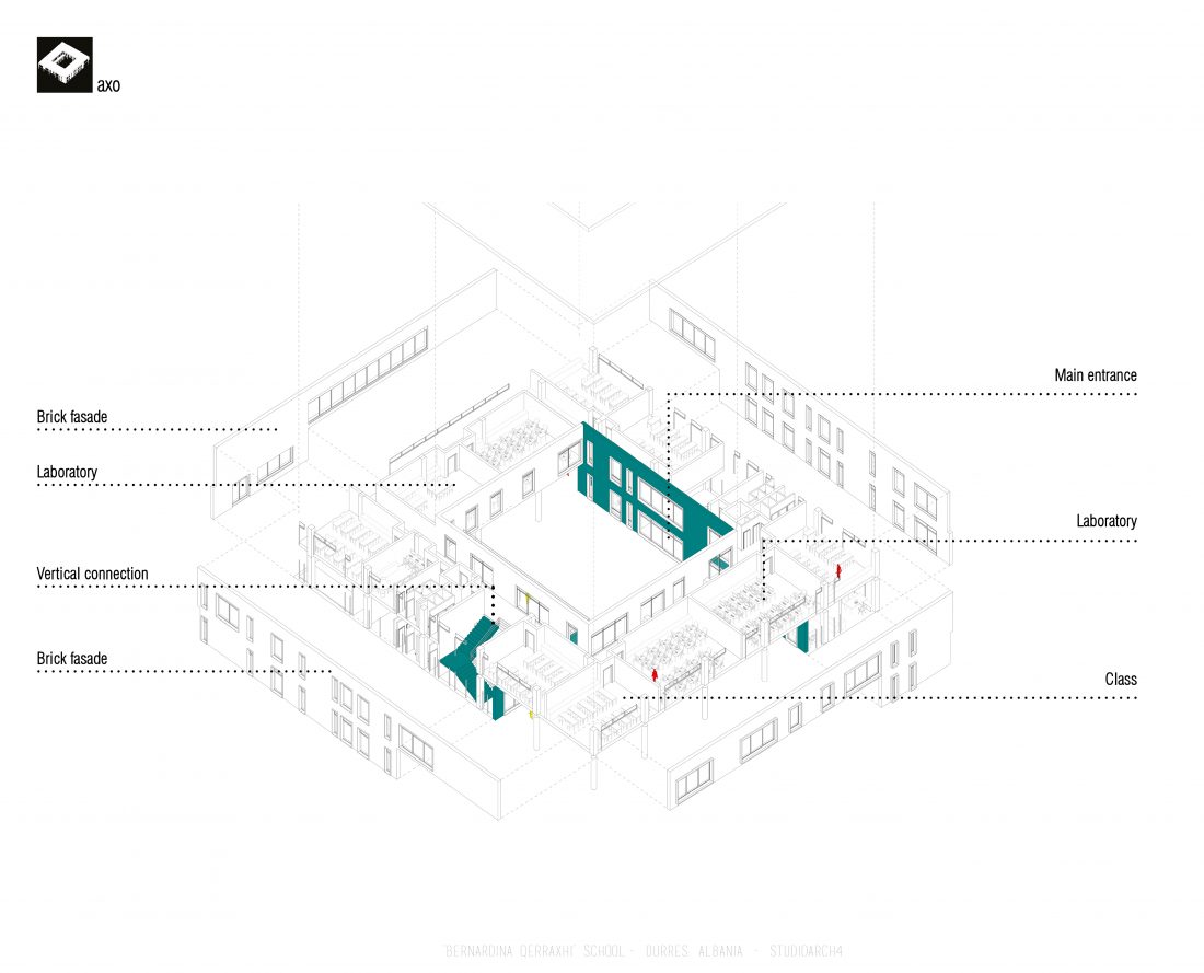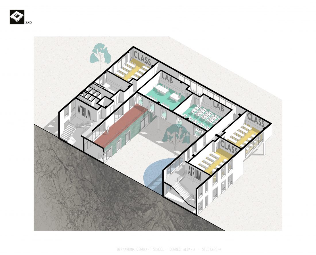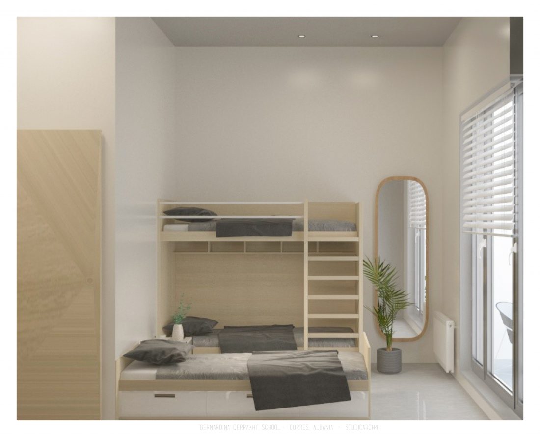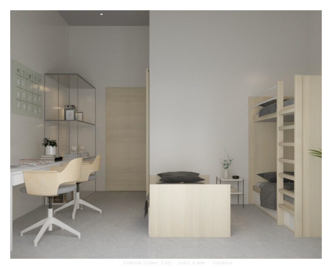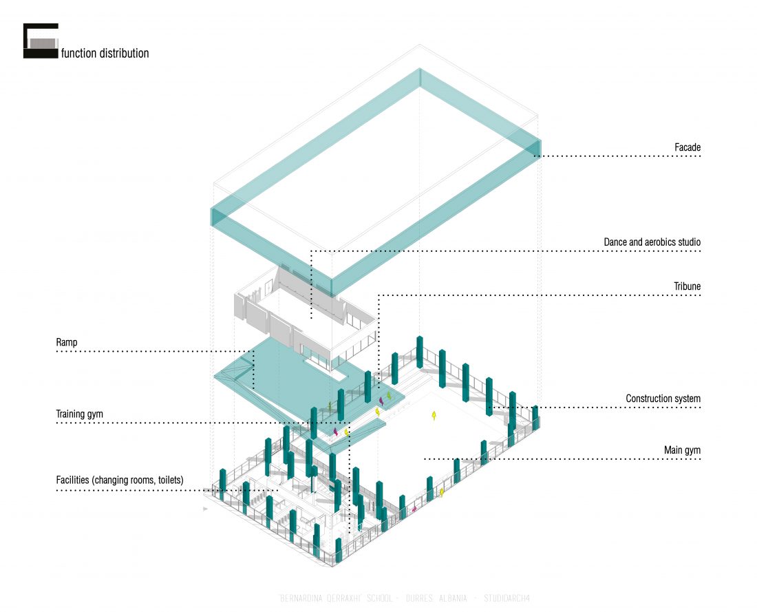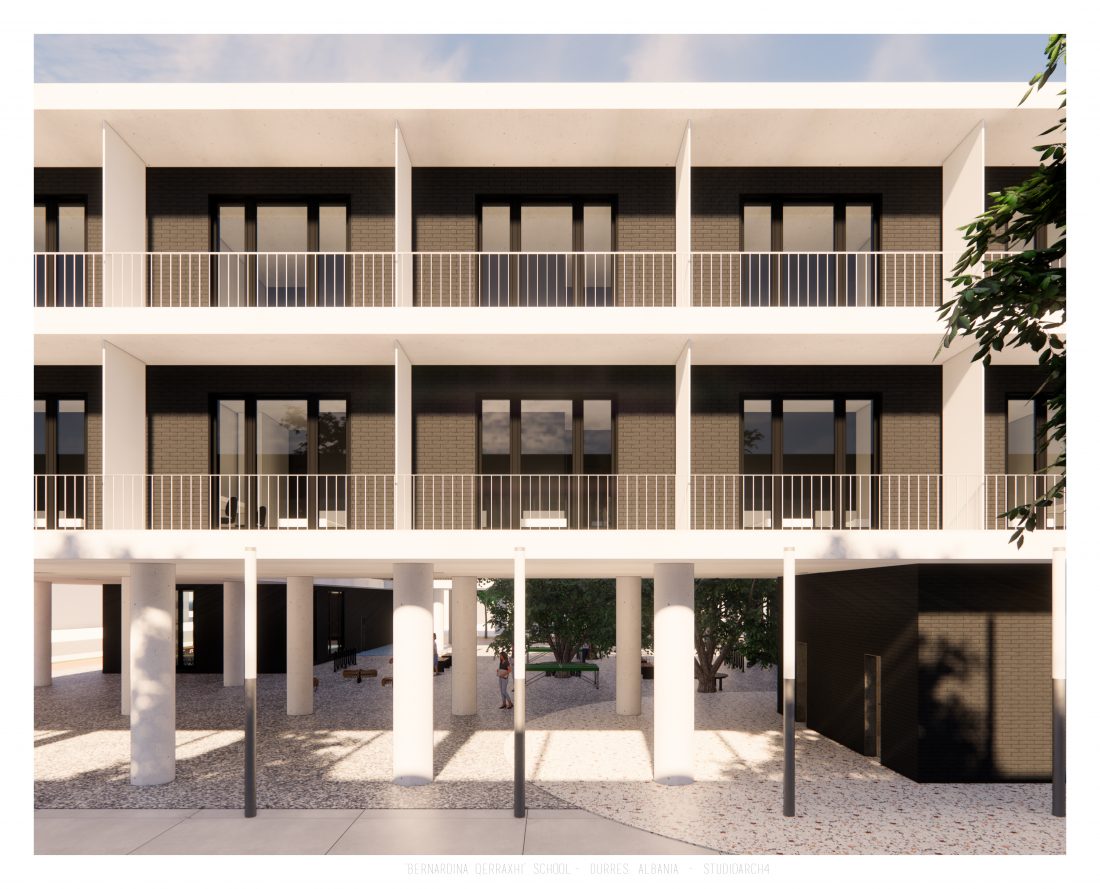 Shkolla ‘Bernardina Qerraxhi’, shkolla kombëtare profesionale e sporteve, ndodhet në Durrës. Si pasojë e tërmetit të 26 Nëntor 2019, ndërtesa pësoi dëme të mëdha dhe duhet rikonstruktuar, duke ndjekur edhe standarte të reja të projektimit dhe ofrimin e hapësirave specifike për karakterin sportiv. Projekti përfshin godinën e shkollës, një palestër të re, dhe hapësira për konvikte. Zona ofron mundësinë e shpërndarjes së këtyre funksioneve në godina të ndryshme duke dhënë mundësinë për të projektuar edhe hapësira të jashtme të cilat do i shërbejnë dhe do lidhin objektet e ndara. Pikë e rëndësishme në projektim është ndërthurja e disa hapësirave që mund ti shërbejnë edhe komunitetit, jo vetëm studentëve.