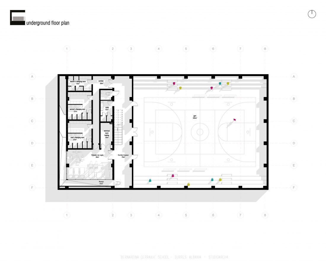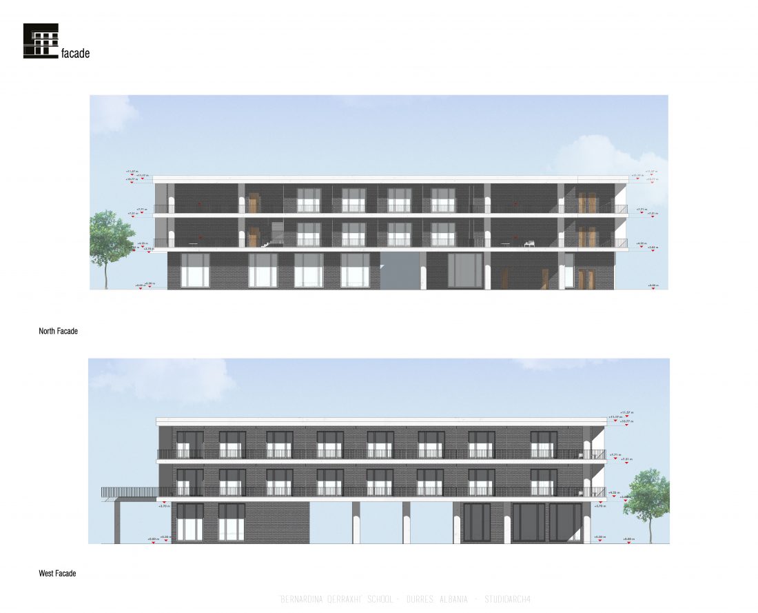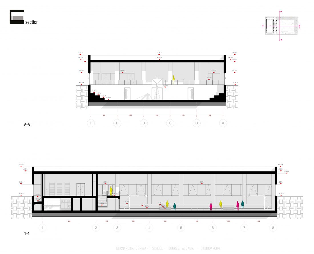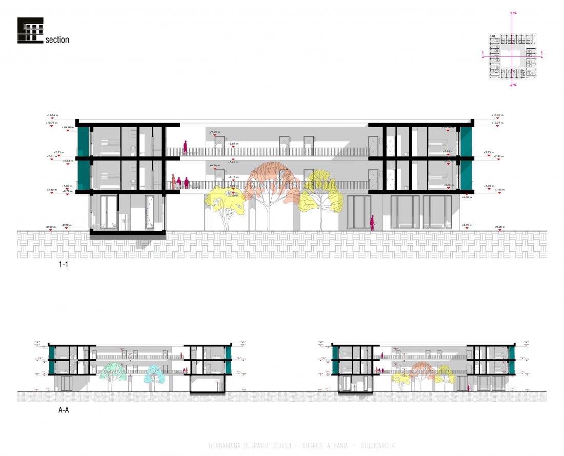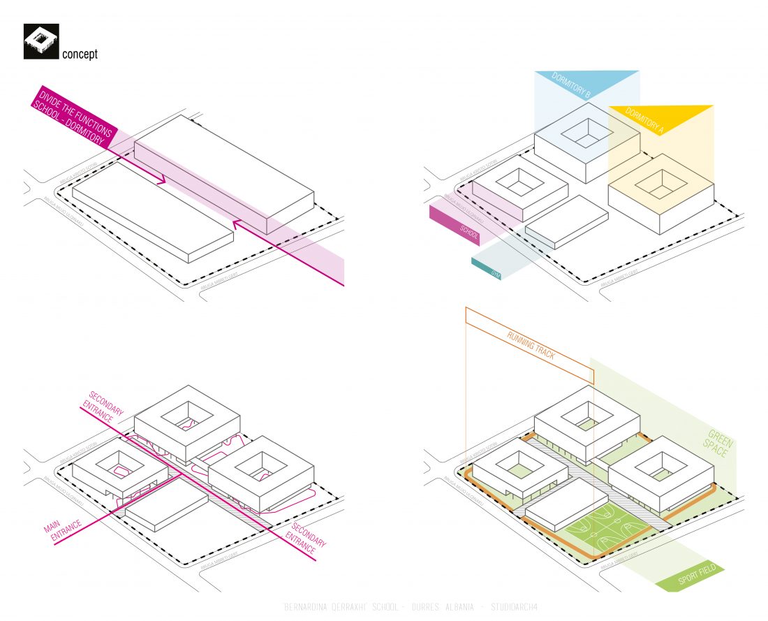 ‘Bernardina Qerraxhi’ school, the professional sports national school, is located in Durrës. As a result of the earthquake on November 26, 2019, the building suffered major damage and needed to be reconstructed, following the new design standards and the provision of specific spaces for its sports character. The project includes the school building, a new gym and the dormitory space. The area offers the possibility of distributing these functions in different buildings giving the opportunity to design outdoor spaces which will serve and connect them. An important point in the design process is the combination of several spaces that can serve also the community, not just the students.