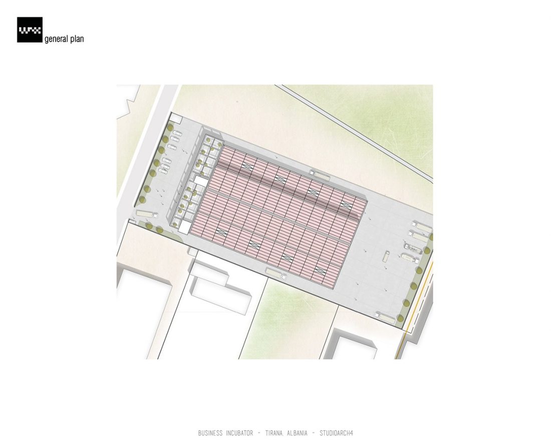 The total area amounts to 9075 m2. The total built area is 4306 m2. The building has a East-West orientation and is positioned in the middle of the enclosed site thus allowing for an ample parking space for small vehicles on the western side and parking for bigger trucks on the eastern side.