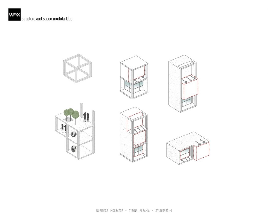 The structural frame follows the same modularity logic which is in tern reflected in the main facade through a grid concept of masses and voids. This concept is also perceived in the floor plans, where the ratio between internal and external spaces is altered through the facade grid. This creates micro situations of various usages.