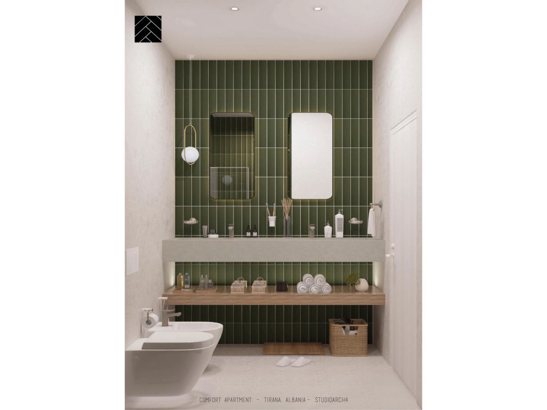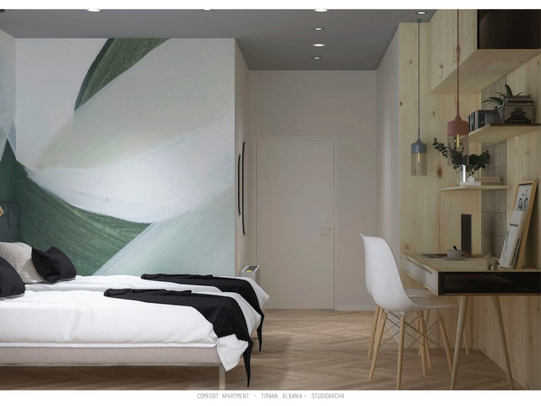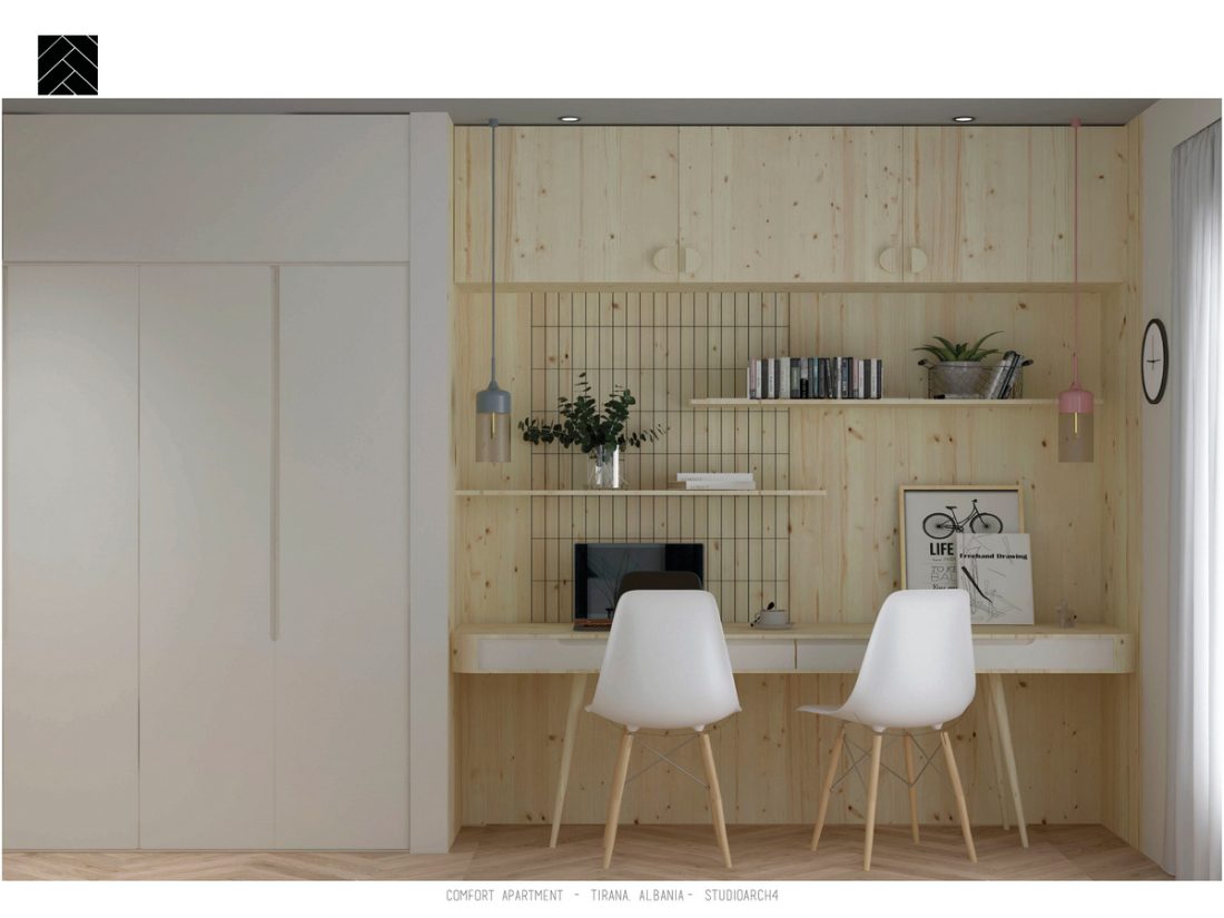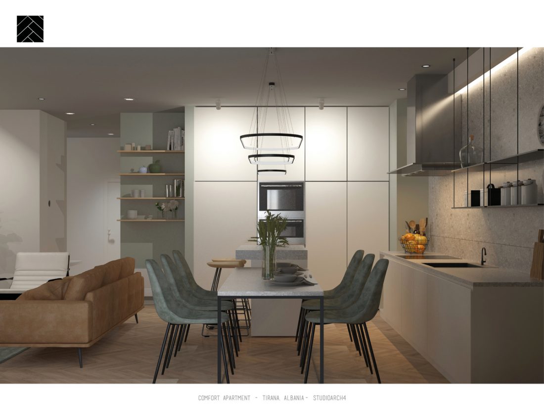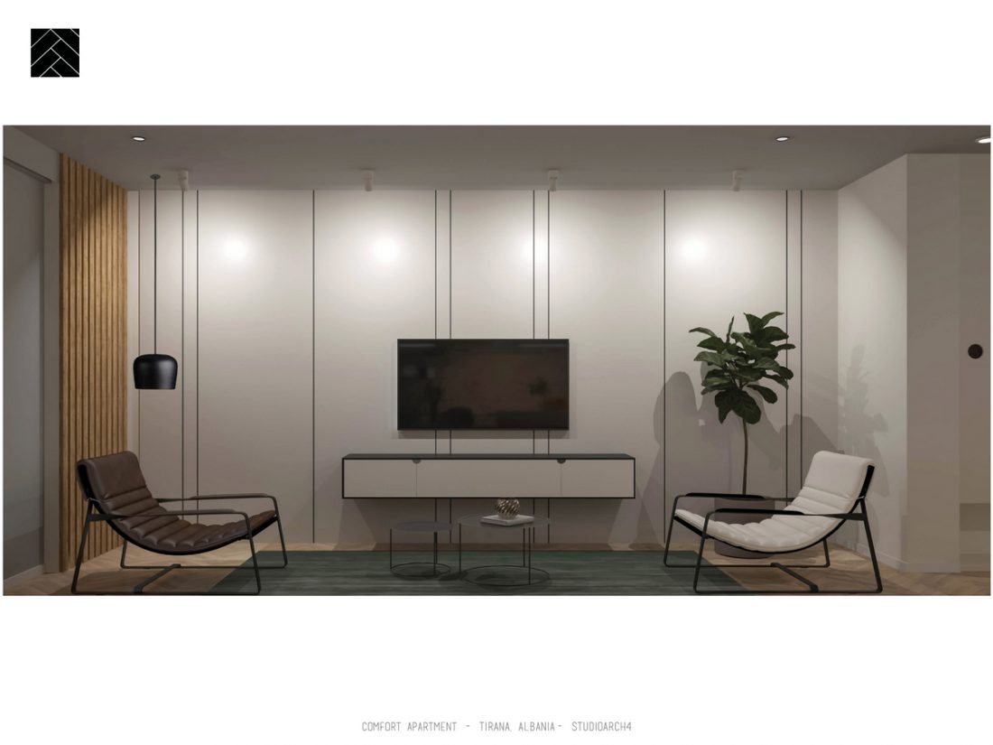 Importance is also given to lighting, natural and artificial. Natural light covers the main facilities such as living room area, study area in the children’s room and master bedroom. Natural light is followed by artificial lighting which through intensity and color of warmth emphasizes special spaces in the respective premises of the apartment.