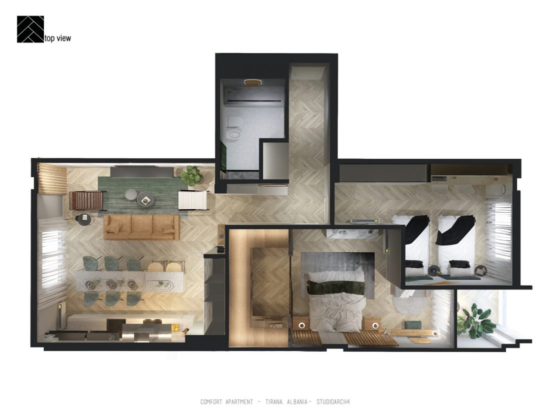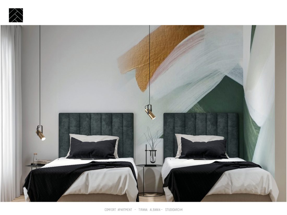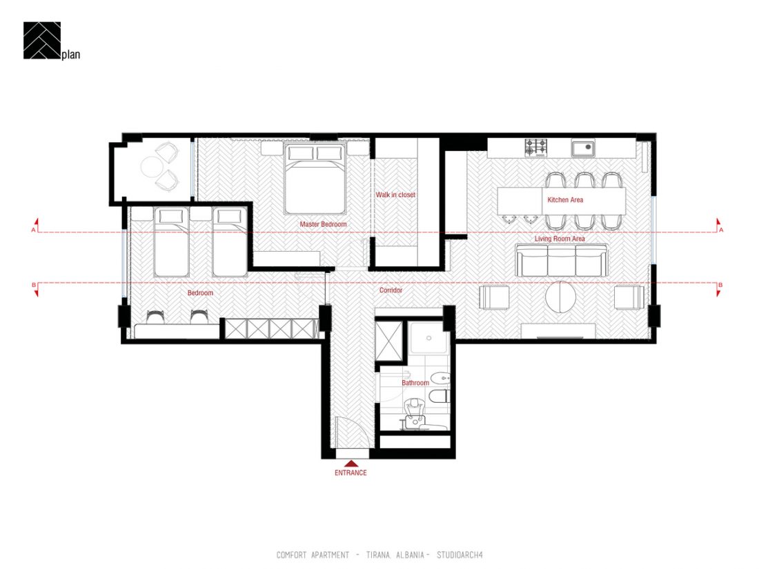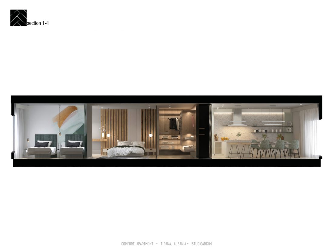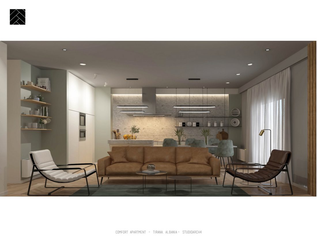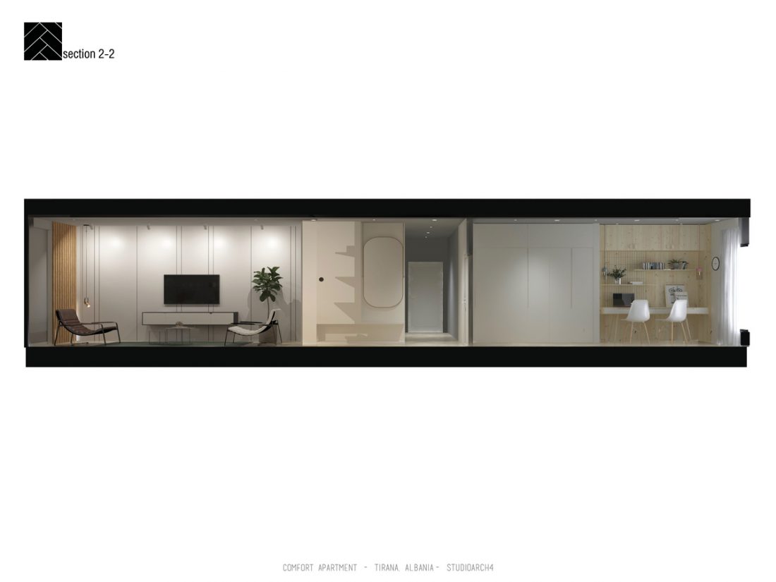 AL_Ky apartament është rikonceptuar për tju pershtatur dëshirave dhe komfortit të përdoruesve të tij. Në një hapësirë rreth 95 m2 shpaloset një paletë e koncetruar materialesh të cilat diferencojnë zonat e ndryshme të apartamentit. Një ndërthurje e materialeve të ngurta si Terrazo apo pllaka e mermerit me ato të ngrohta si druri i lisit. Materiali mbizotërues është druri, i cili vjen herë si parket dhe herë si material veshës i murit, duke përcjellë ngrohtësinë që transmeton ky material në hapësira të ndryshme të apartamentit.