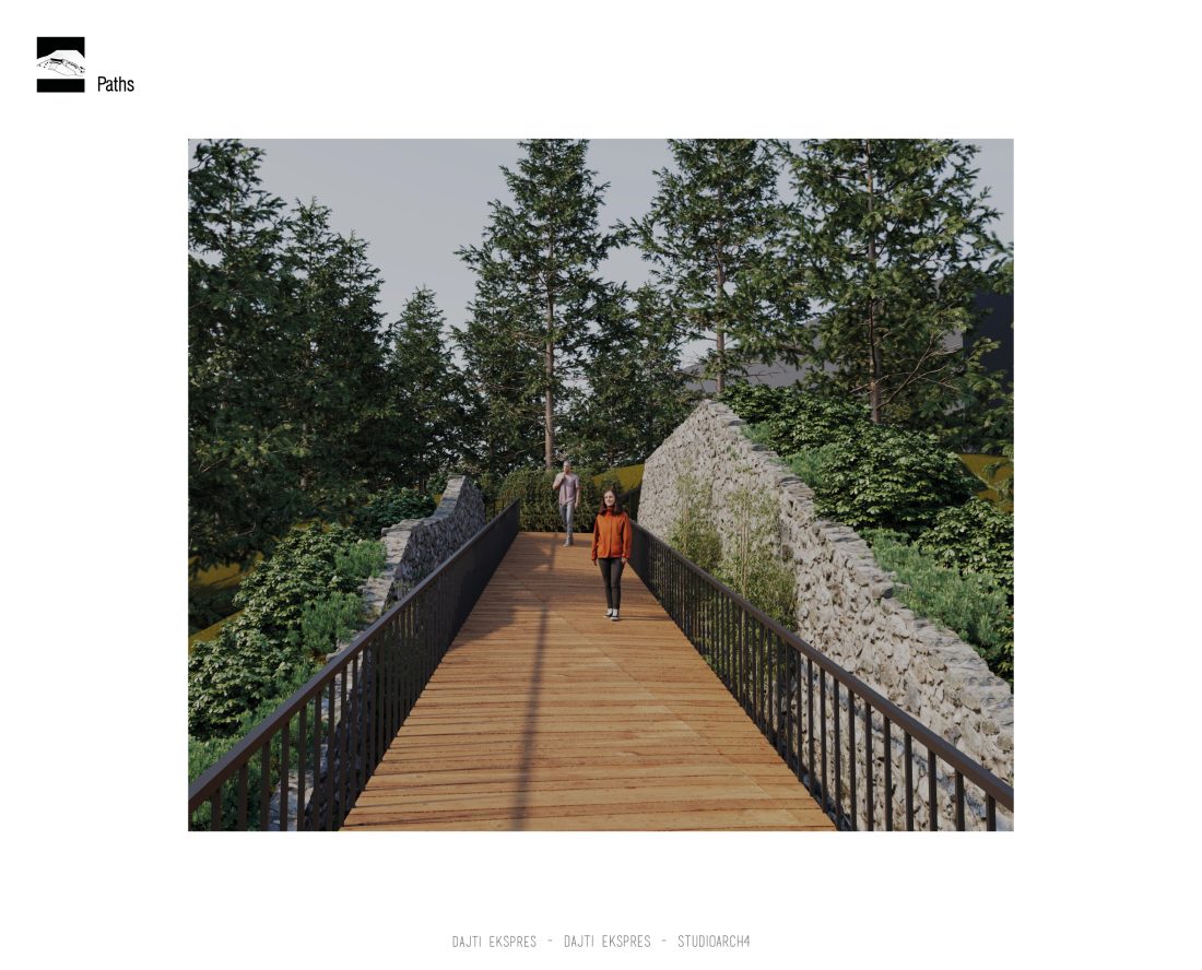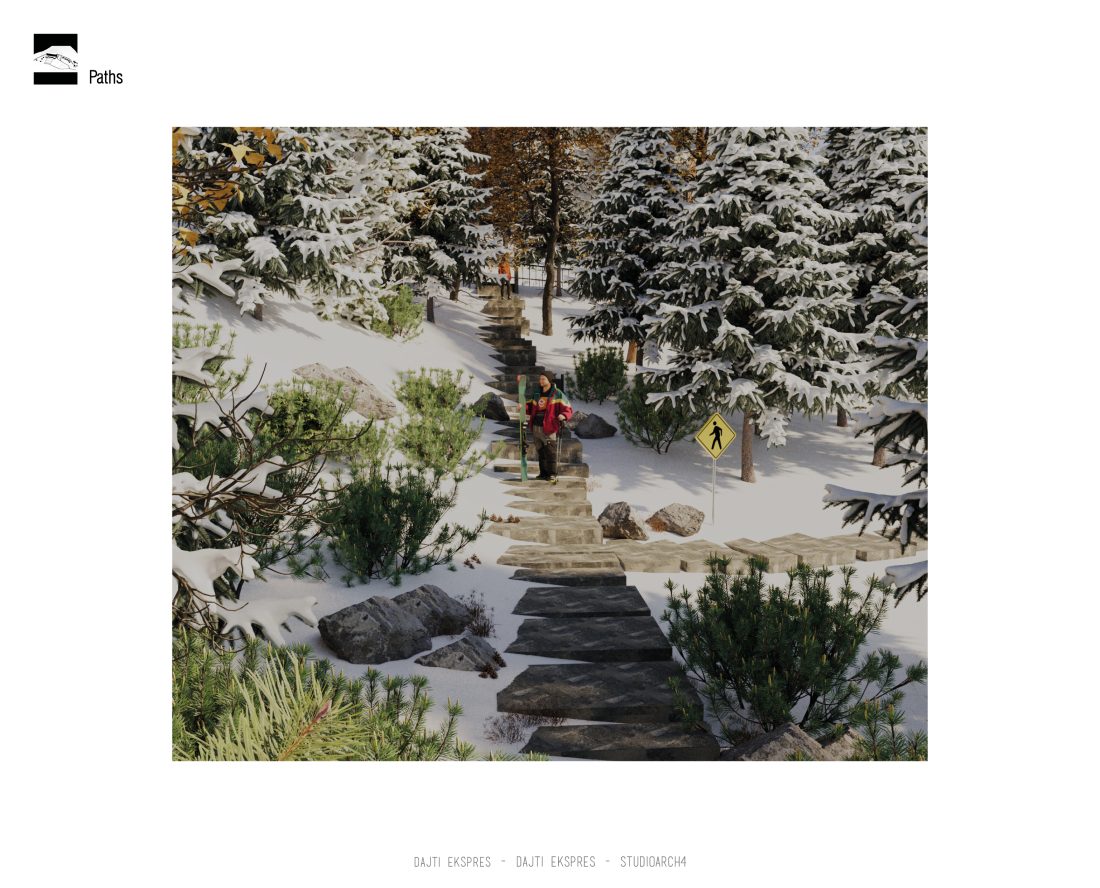 nga nje shetitore ne trajte bulevardi qe lidh objektin ekzistues te teleferikut me hotelin. Ne propozimin tone nje element thelbesor ka qene trajtimi i spoteve ne forma dhe materiale sa me natyrale dhe ne harmoni me peisazhin. Jane perdorur kryesisht materiale si gure natyral te zones , dru dhe elemente metalike te pershtatshme per klimen dhe karakterin e vendit vendin.