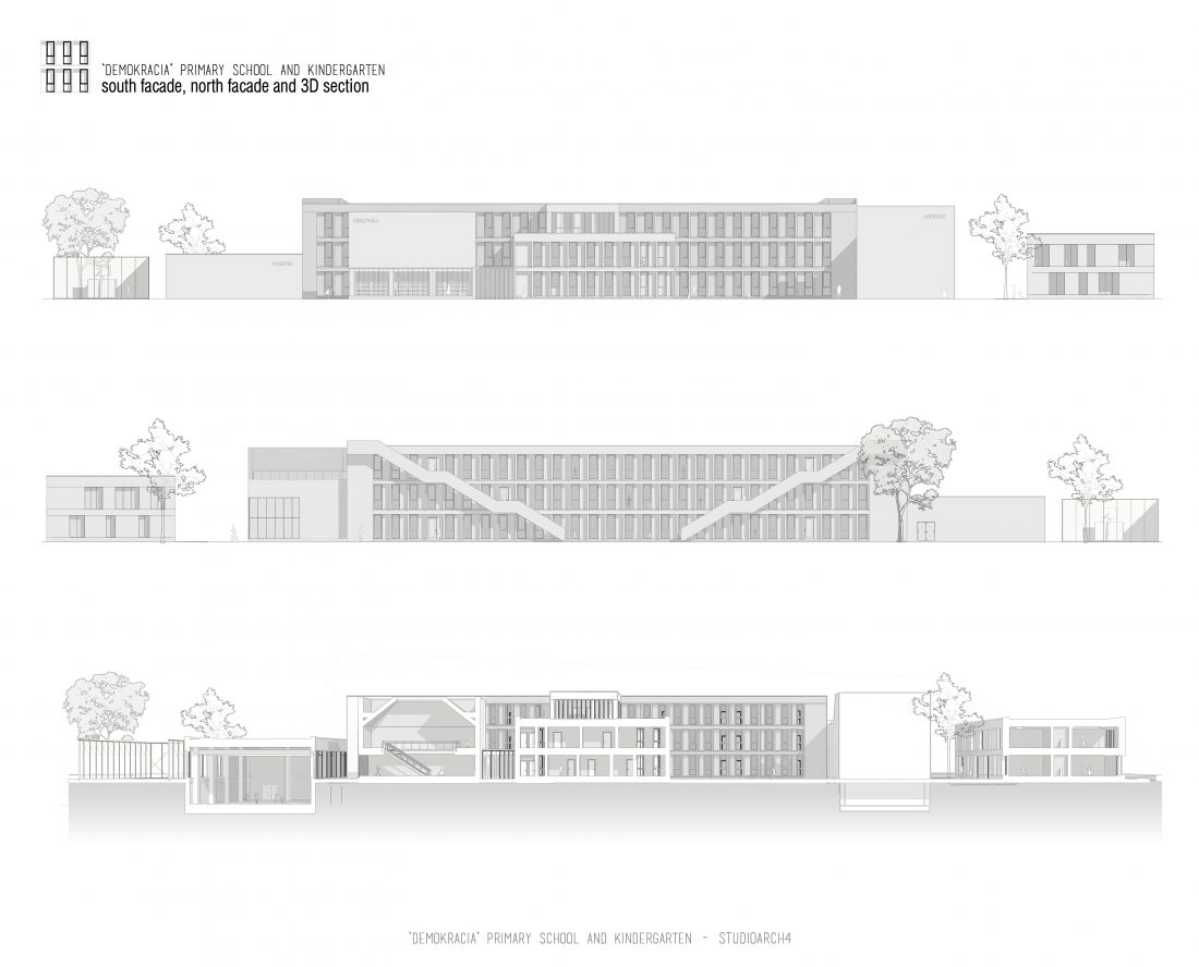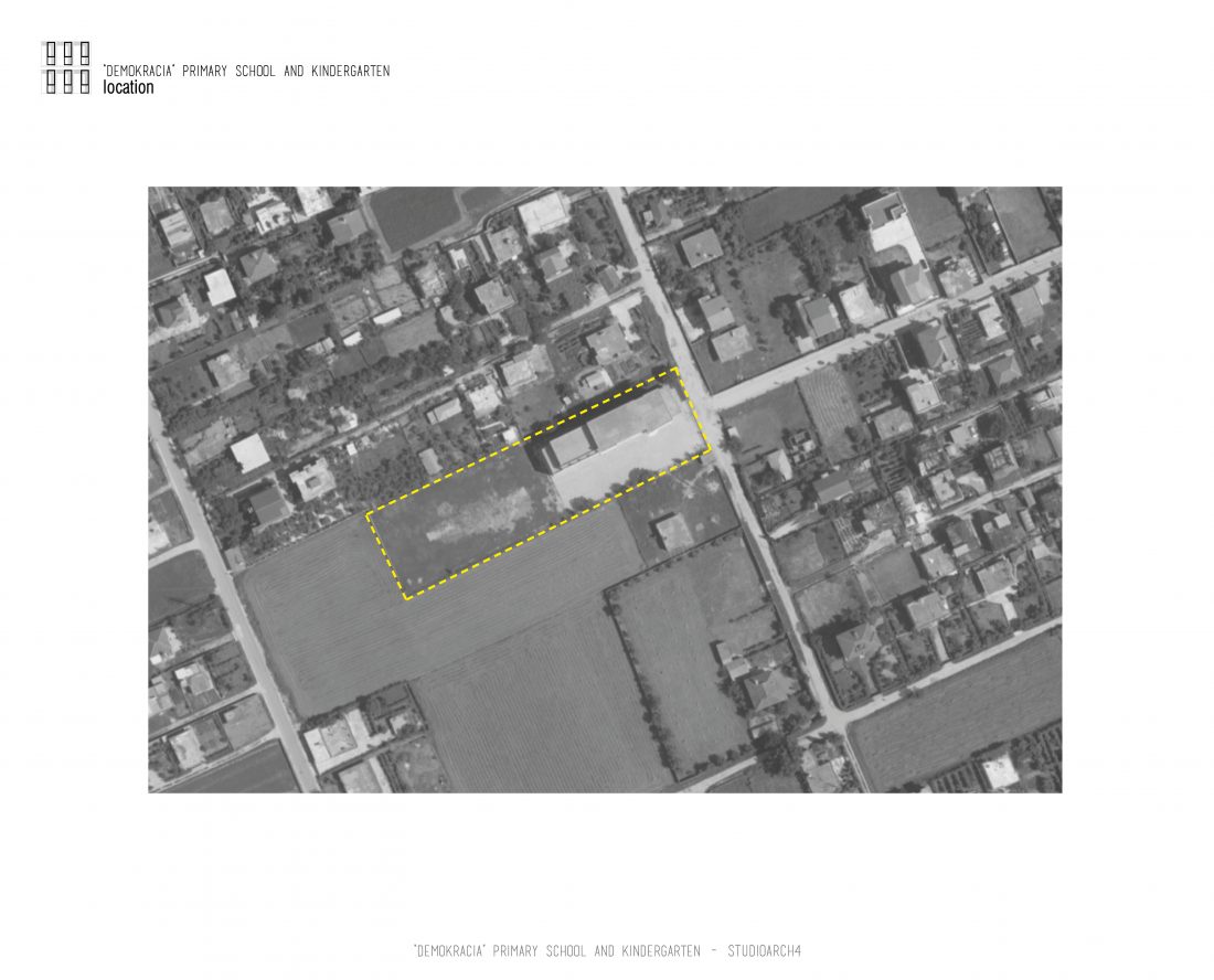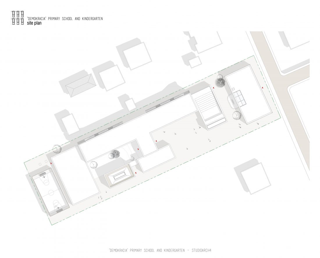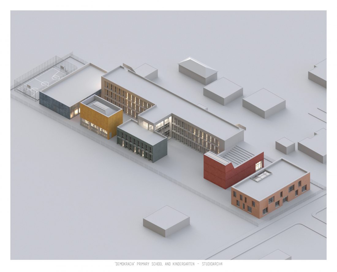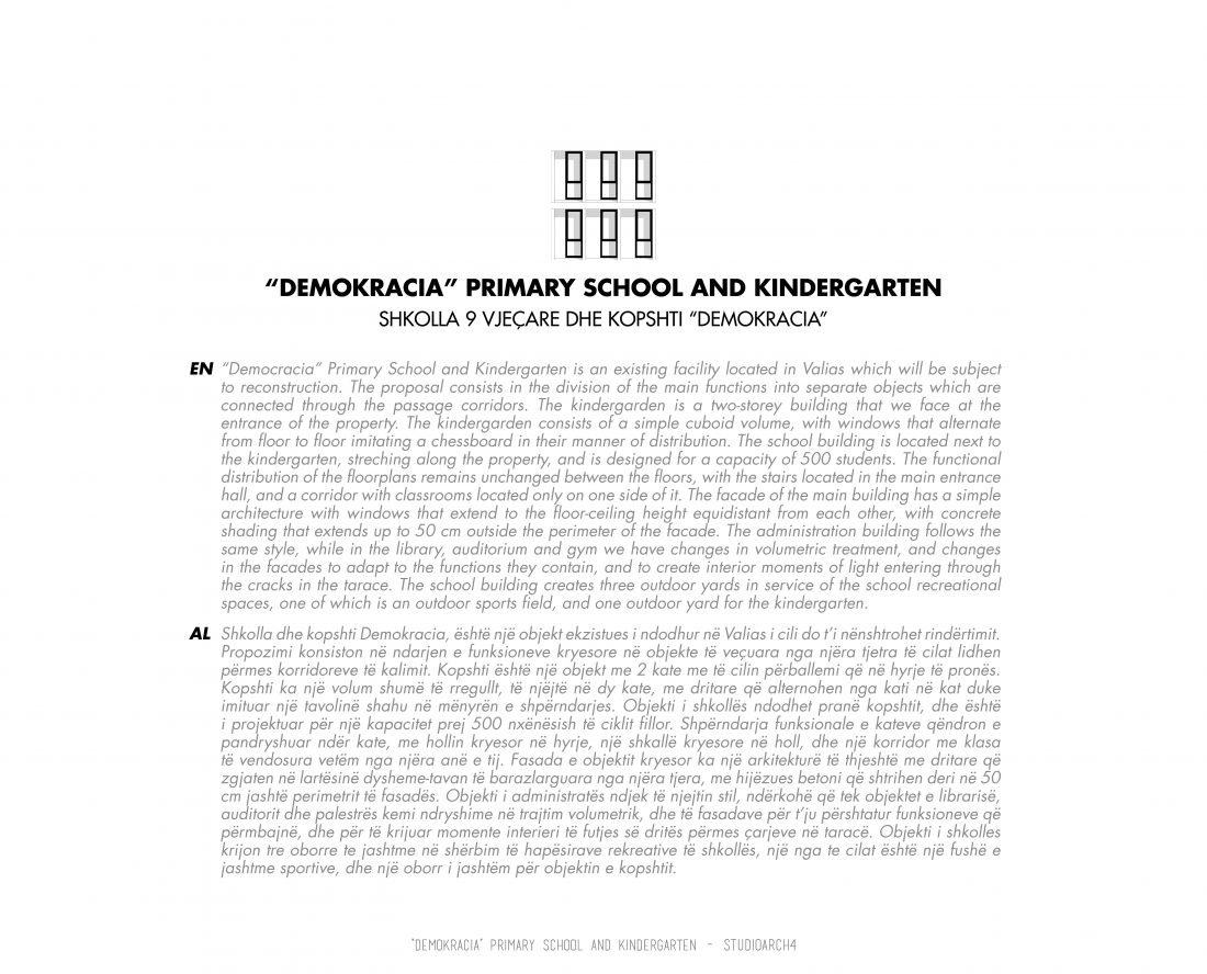 “Demokracia” Primary School and Kindergarten is an existing facility located in Valias which will be subject to reconstruction. The proposal consists in the division of the main functions into separate objects which are connected through the passage corridors. The kindergarden is a two-storey building that we face at the entrance of the property. The kindergarden consists of a simple cuboid volume, with windows that alternate from floor to floor imitating a chessboard in their manner of distribution. The school building is located next to the kindergarten, streching along the property, and is designed for a capacity of 500 students. The functional distribution of the floorplans remains unchanged between the floors, with the stairs located in the main entrance hall, and a corridor with classrooms located only on one side of it. The facade of the main building has a simple architecture with windows that extend to the floor-ceiling height equidistant from each other, with concrete shading that extends up to 50 cm outside the perimeter of the facade. The administration building follows the same style, while in the library, auditorium and gym we have changes in volumetric treatment, and changes in the facades to adapt to the functions they contain, and to create interior moments of light entering through the cracks in the tarace. The school building creates three outdoor yards in service of the school recreational spaces, one of which is an outdoor sports field, and one outdoor yard for the kindergarten.