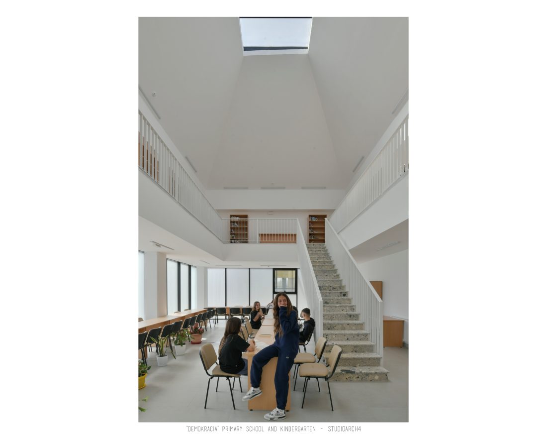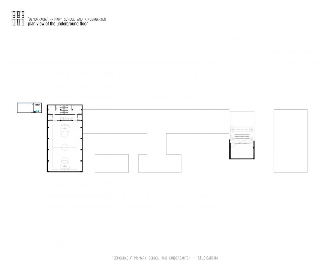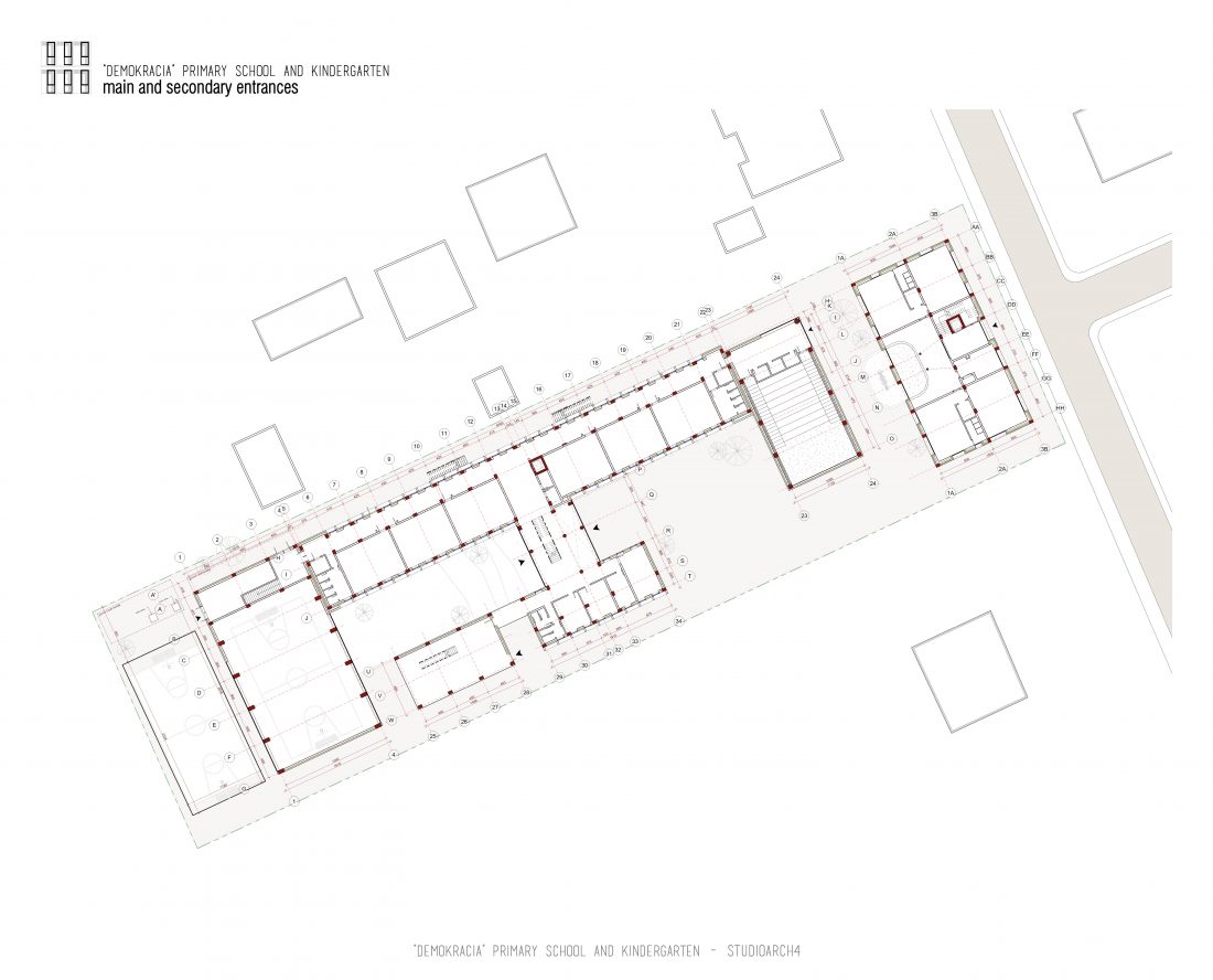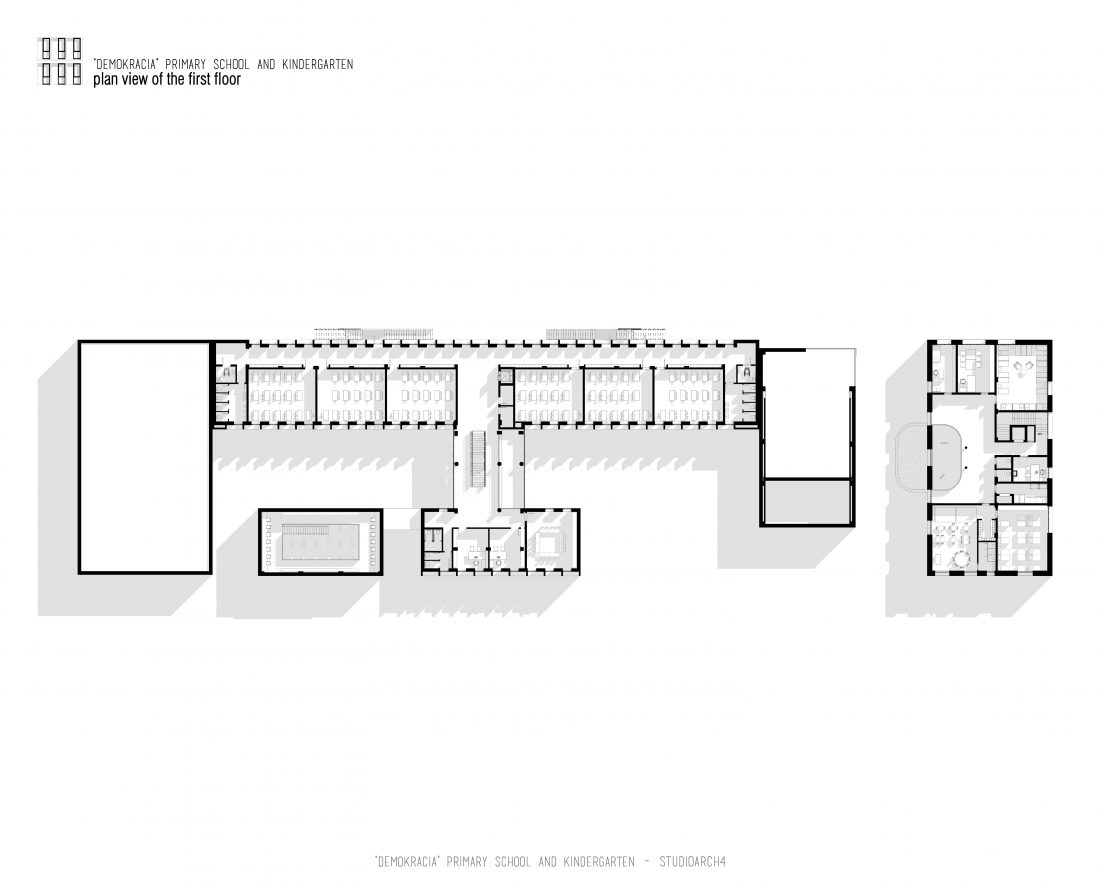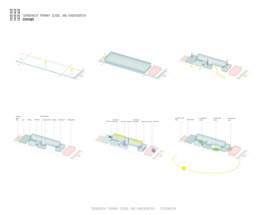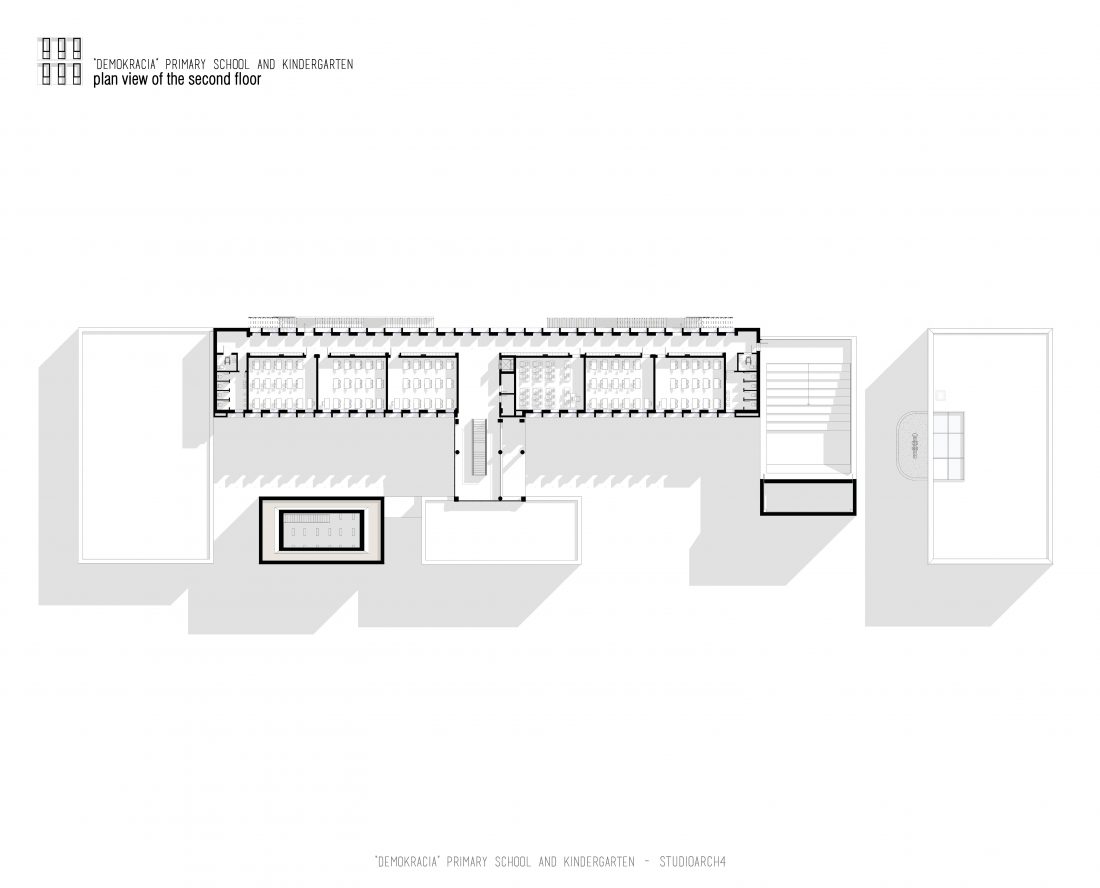 “Demokracia” Primary School and Kindergarten is an existing facility located in Valias which will be subject to reconstruction. The proposal consists in the division of the main functions into separate objects which are connected through the passage corridors. The kindergarden is a two-storey building that we face at the entrance of the property. The kindergarden consists of a simple cuboid volume, with windows that alternate from floor to floor imitating a chessboard in their manner of distribution. The school building is located next to the kindergarten, streching along the property, and is designed for a capacity of 500 students. The functional distribution of the floorplans remains unchanged between the floors, with the stairs located in the main entrance hall, and a corridor with classrooms located only on one side of it. The facade of the main building has a simple architecture with windows that extend to the floor-ceiling height equidistant from each other, with concrete shading that extends up to 50 cm outside the perimeter of the facade. The administration building follows the same style, while in the library, auditorium and gym we have changes in volumetric treatment, and changes in the facades to adapt to the functions they contain, and to create interior moments of light entering through the cracks in the tarace. The school building creates three outdoor yards in service of the school recreational spaces, one of which is an outdoor sports field, and one outdoor yard for the kindergarten.