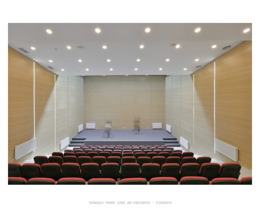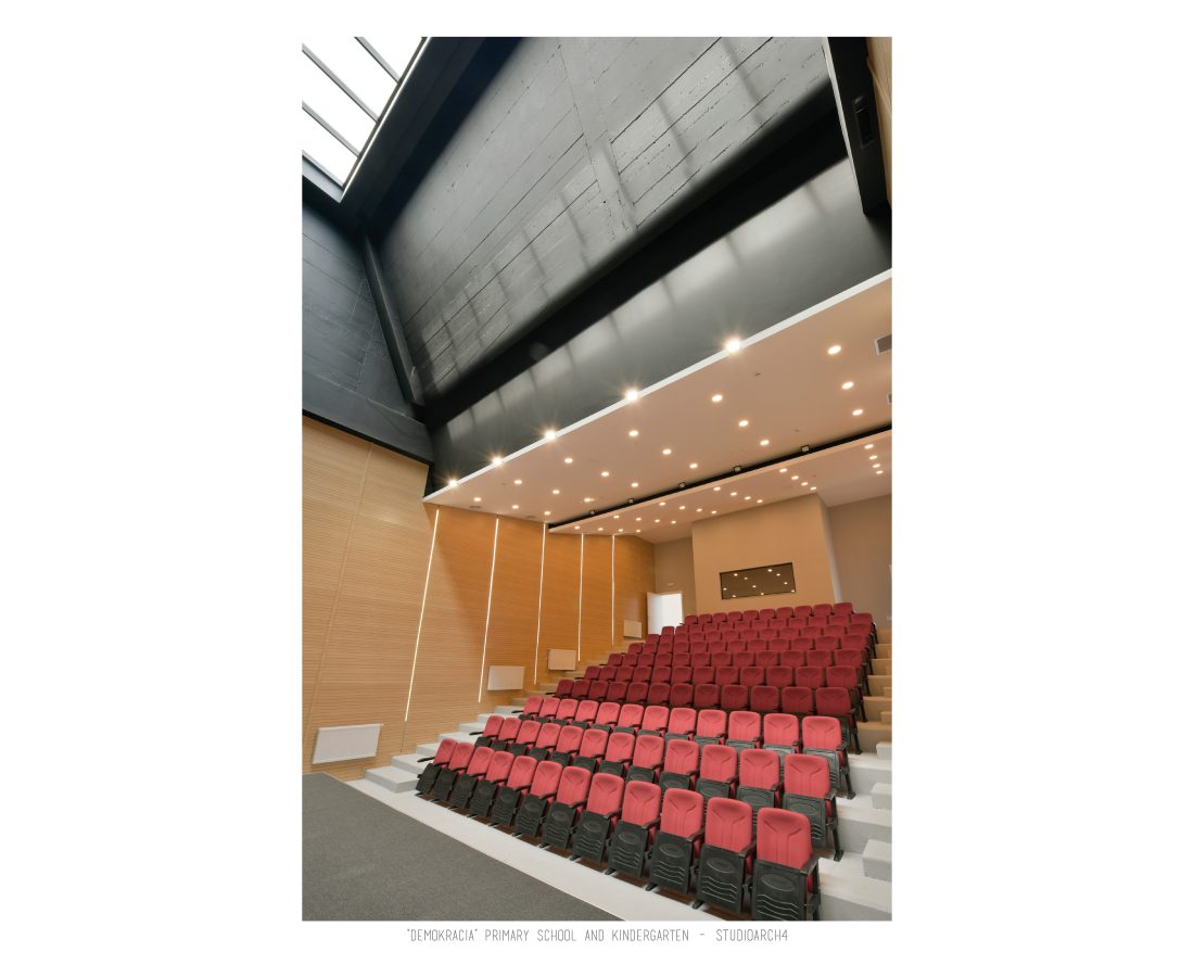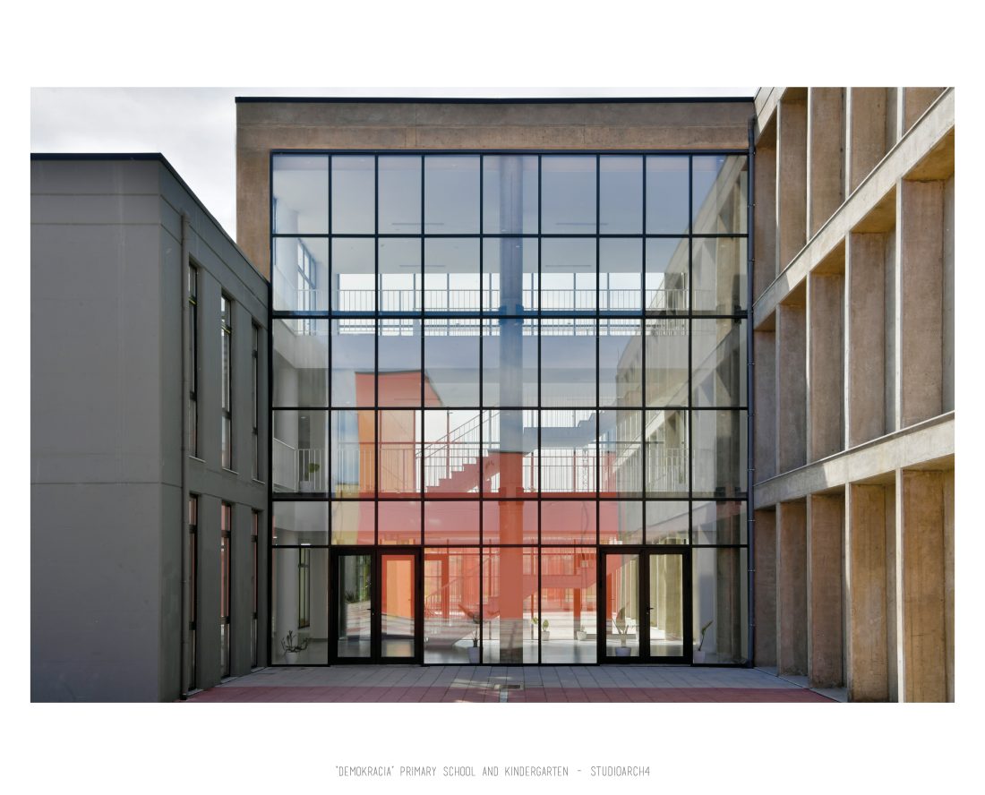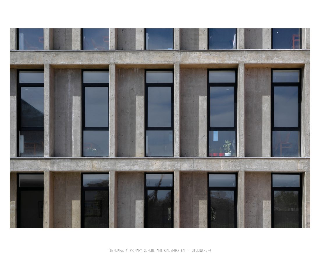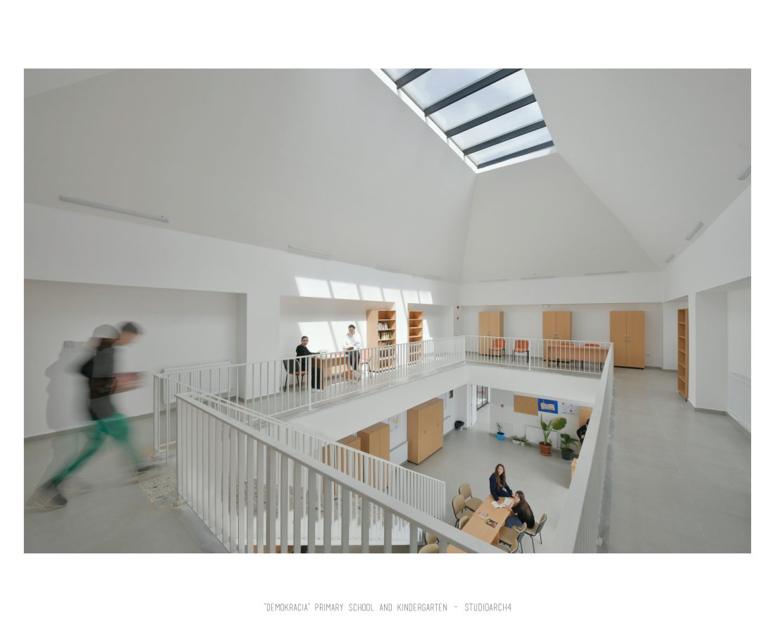 “Demokracia” Primary School and Kindergarten is an existing facility located in Valias which will be subject to reconstruction. The proposal consists in the division of the main functions into separate objects which are connected through the passage corridors. The kindergarden is a two-storey building that we face at the entrance of the property. The kindergarden consists of a simple cuboid volume, with windows that alternate from floor to floor imitating a chessboard in their manner of distribution. The school building is located next to the kindergarten, streching along the property, and is designed for a capacity of 500 students. The functional distribution of the floorplans remains unchanged between the floors, with the stairs located in the main entrance hall, and a corridor with classrooms located only on one side of it. The facade of the main building has a simple architecture with windows that extend to the floor-ceiling height equidistant from each other, with concrete shading that extends up to 50 cm outside the perimeter of the facade. The administration building follows the same style, while in the library, auditorium and gym we have changes in volumetric treatment, and changes in the facades to adapt to the functions they contain, and to create interior moments of light entering through the cracks in the tarace. The school building creates three outdoor yards in service of the school recreational spaces, one of which is an outdoor sports field, and one outdoor yard for the kindergarten.