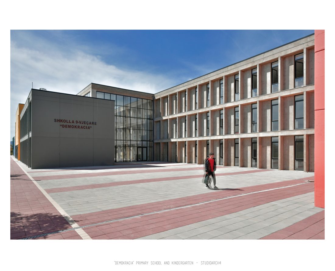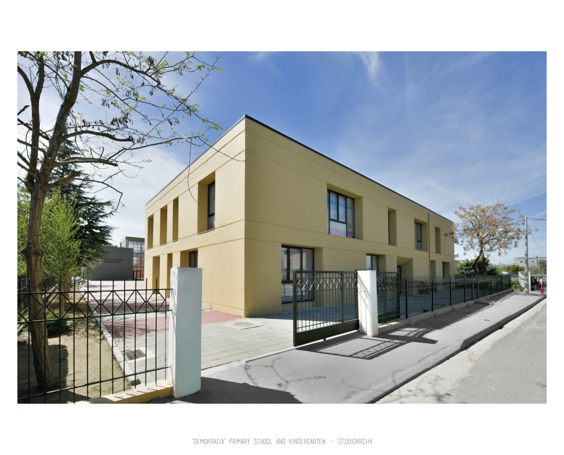 Shkolla dhe kopshti Demokracia, është një objekt ekzistues i ndodhur në Valias i cili do t’i nënshtrohet rindërtimit.Propozimi konsiston në ndarjen e funksioneve kryesore në objekte të veçuara nga njëra tjetra të cilat lidhen përmes korridoreve të kalimit. Kopshti është një objekt me 2 kate me të cilin përballemi që në hyrje të pronës. Kopshti ka një volum shumë të rregullt, të njëjtë në dy kate, me dritare që alternohen nga kati në kat duke imituar një tavolinë shahu në mënyrën e shpërndarjes. Objekti i shkollës ndodhet pranë kopshtit, dhe është i projektuar për një kapacitet prej 500 nxënësish të ciklit fillor. Shpërndarja funksionale e kateve qëndron e pandryshuar ndër kate, me hollin kryesor në hyrje, një shkallë kryesore në holl, dhe një korridor me klasa të vendosura vetëm nga njëra anë e tij. Fasada e objektit kryesor ka një arkitekturë të thjeshtë me dritare që zgjaten në lartësinë dysheme-tavan të barazlarguara nga njëra tjera, me hijëzues betoni që shtrihen deri në 50 cm jashtë perimetrit të fasadës. Objekti i administratës ndjek të njejtin stil, ndërkohë që tek objektet e librarisë, auditorit dhe palestrës kemi ndryshime në trajtim volumetrik, dhe të fasadave për t’ju përshtatur funksioneve që përmbajnë, dhe për të krijuar momente interieri të futjes së dritës përmes çarjeve në taracë. Objekti i shkolles krijon tre oborre te jashtme në shërbim të hapësirave rekreative të shkollës, një nga te cilat është një fushë e jashtme sportive, dhe një oborr i jashtëm për objektin e kopshtit.