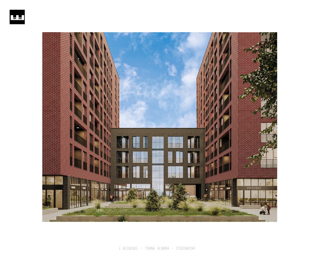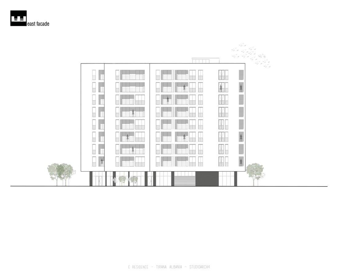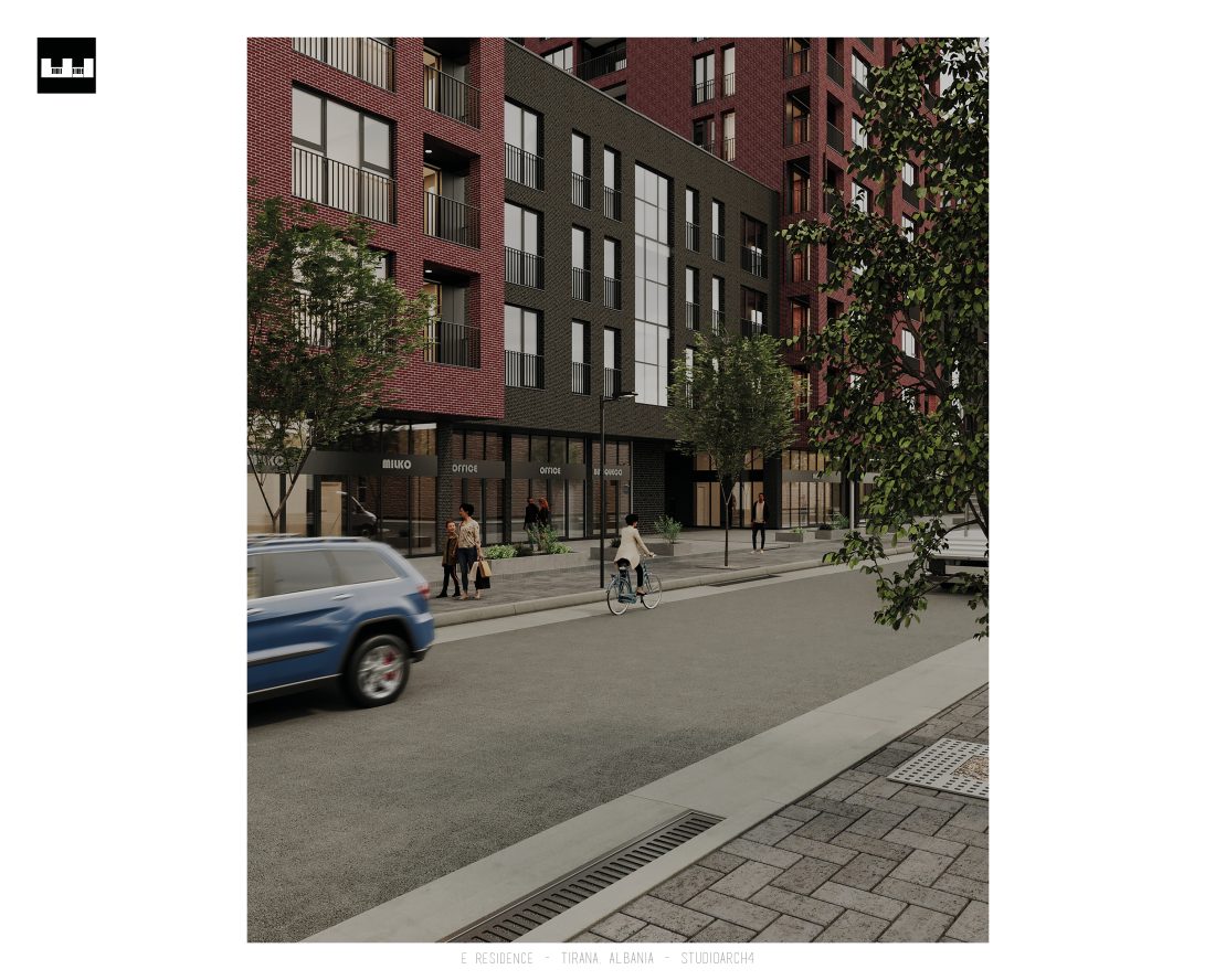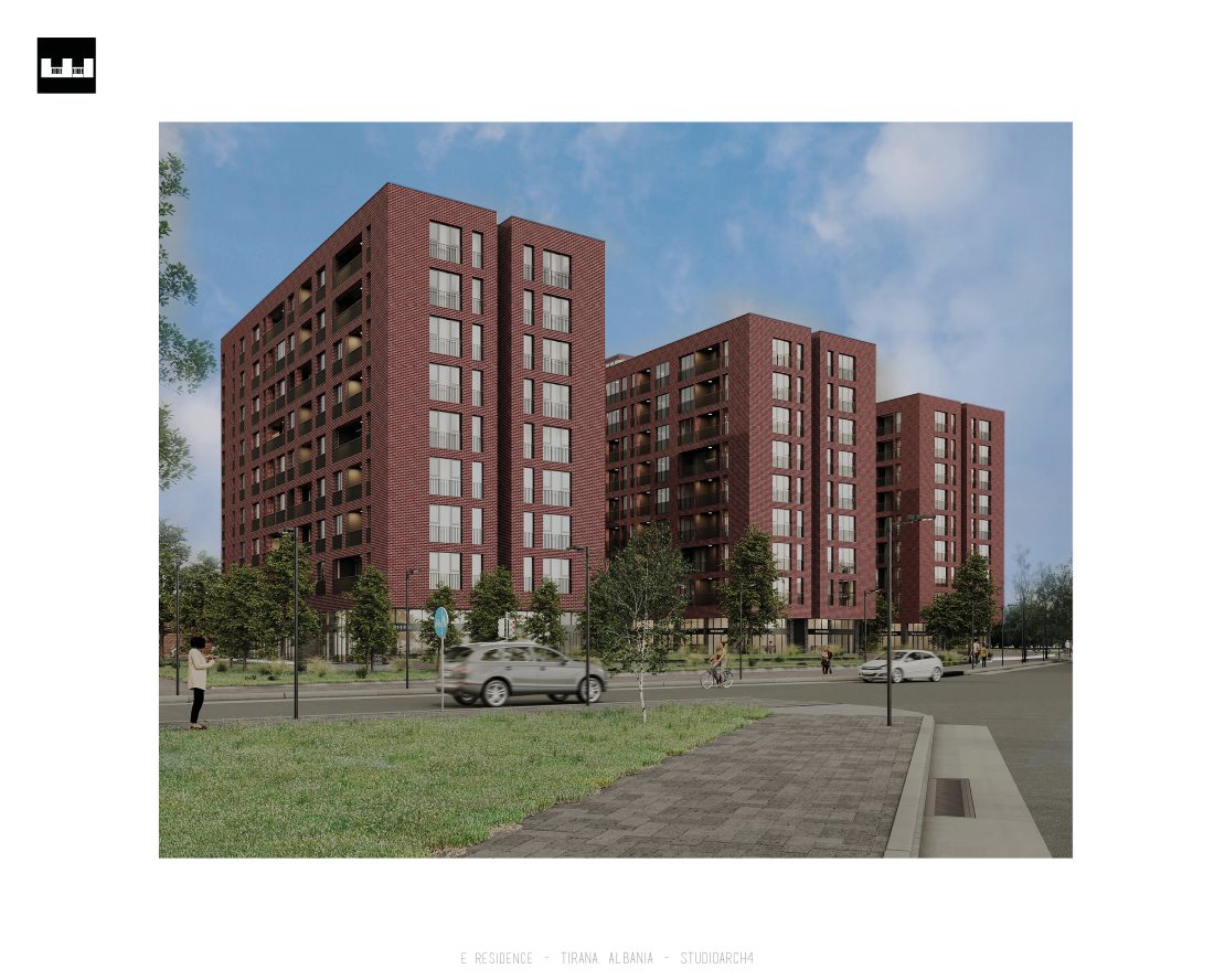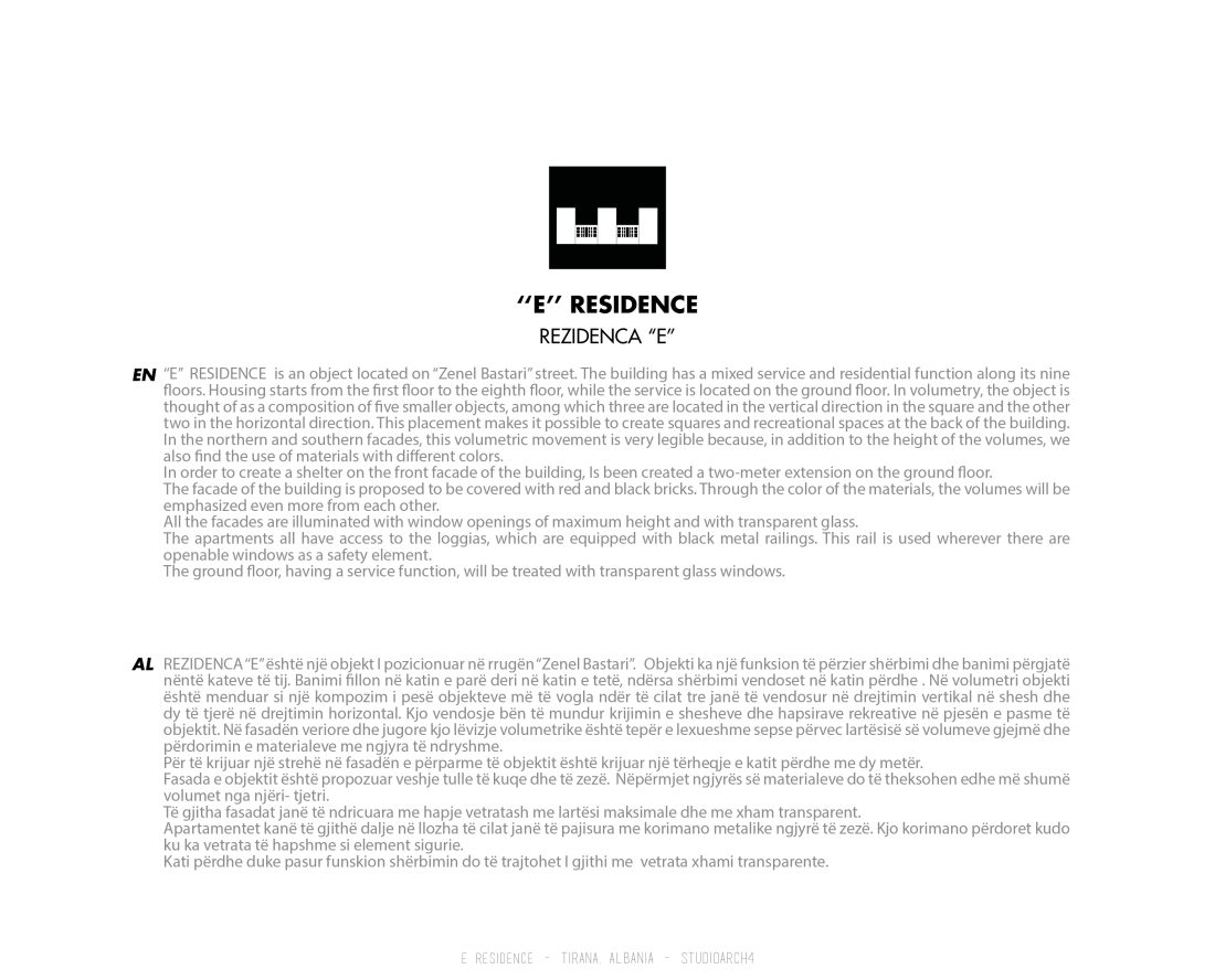 REZIDENCA ‘‘E’’ është një objekt I pozicionuar në rrugën “Zenel Bastari”. Objekti ka një funksion të përzier shërbimi dhe banimi përgjatë nëntë kateve të tij. Banimi fillon në katin e parë deri në katin e tetë, ndërsa shërbimi vendoset në katin përdhe . Në volumetri objekti është menduar si një kompozim i pesë objekteve më të vogla ndër të cilat tre janë të vendosur në drejtimin vertikal në shesh dhe dy të tjerë në drejtimin horizontal. Kjo vendosje bën të mundur krijimin e shesheve dhe hapsirave rekreative në pjesën e pasme të objektit. Në fasadën veriore dhe jugore kjo lëvizje volumetrike është tepër e lexueshme sepse përvec lartësisë së volumeve gjejmë dhe përdorimin e materialeve me ngjyra të ndryshme. Për të krijuar një strehë në fasadën e përparme të objektit është krijuar një tërheqje e katit përdhe me dy metër. Fasada e objektit është propozuar veshje tulle të kuqe dhe të zezë. Nëpërmjet ngjyrës së materialeve do të theksohen edhe më shumë