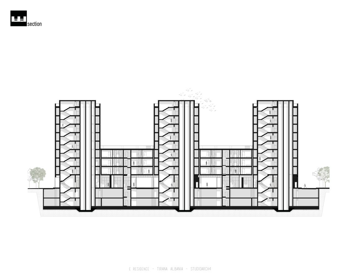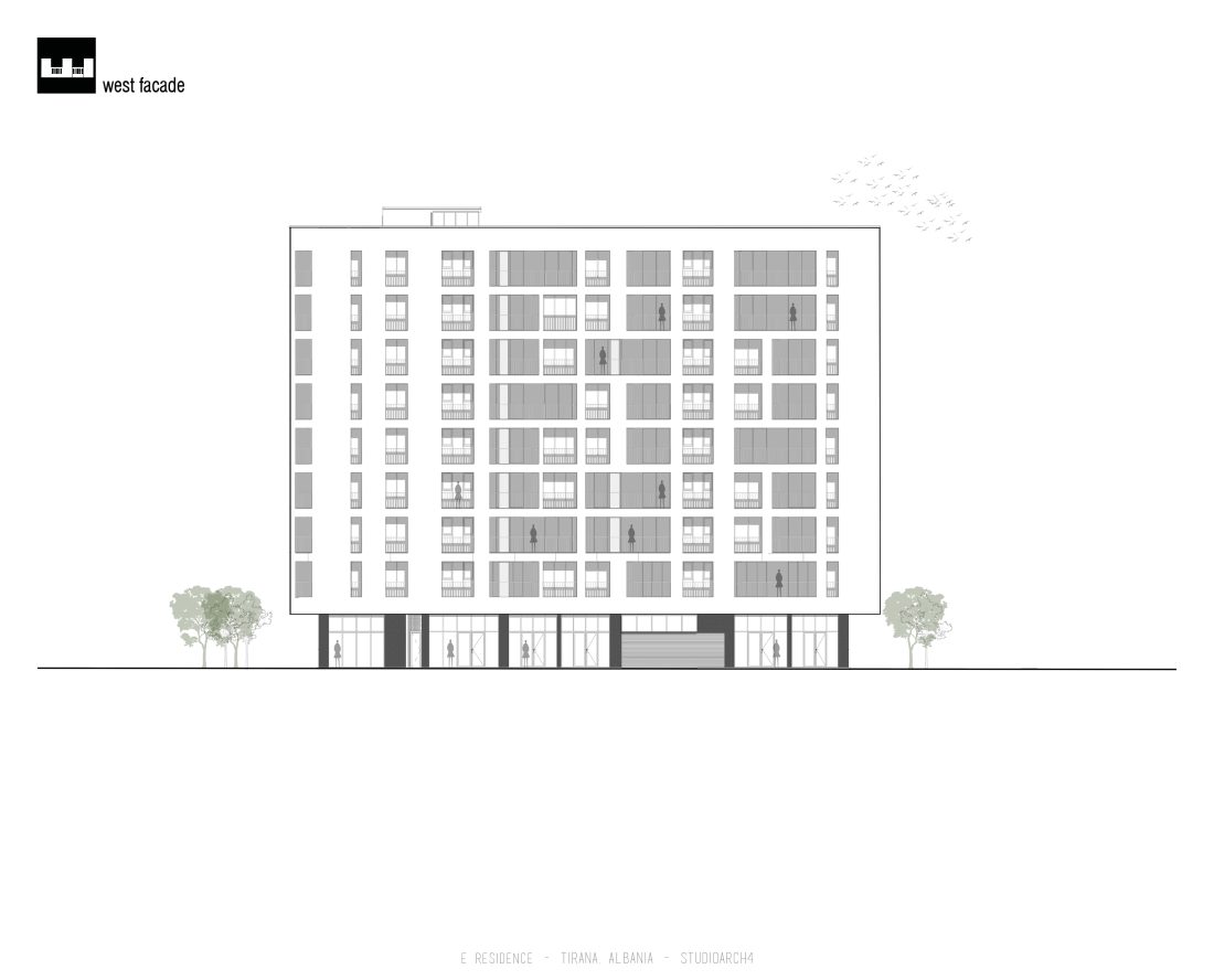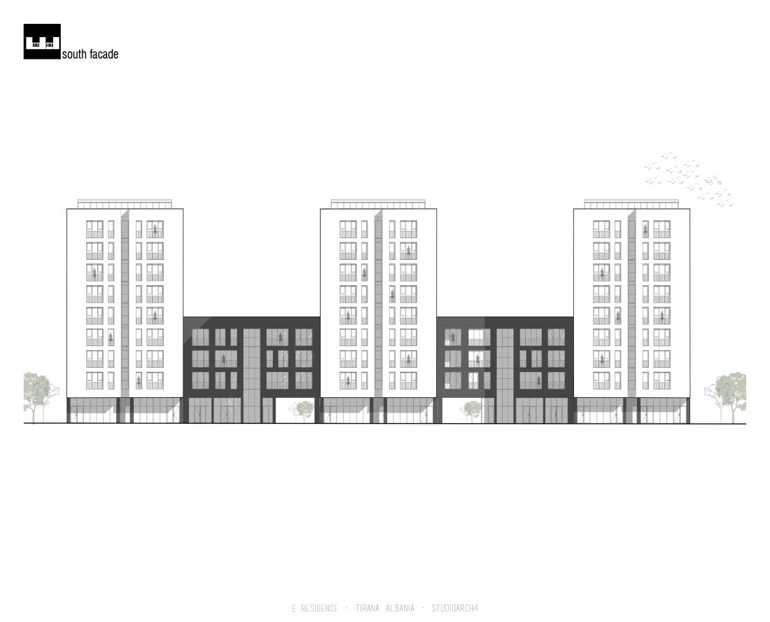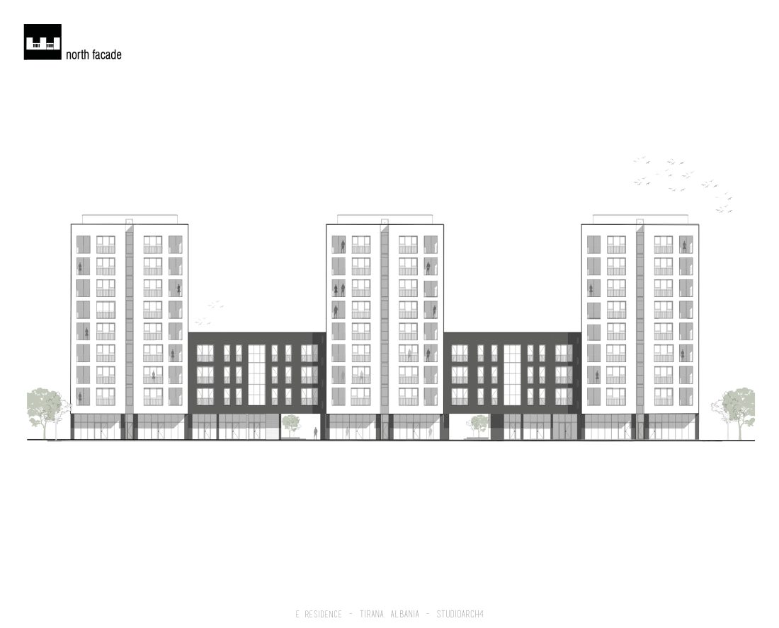 REZIDENCA ‘‘E’’ është një objekt I pozicionuar në rrugën “Zenel Bastari”. Objekti ka një funksion të përzier shërbimi dhe banimi përgjatë nëntë kateve të tij. Banimi fillon në katin e parë deri në katin e tetë, ndërsa shërbimi vendoset në katin përdhe . Në volumetri objekti është menduar si një kompozim i pesë objekteve më të vogla ndër të cilat tre janë të vendosur në drejtimin vertikal në shesh dhe dy të tjerë në drejtimin horizontal. Kjo vendosje bën të mundur krijimin e shesheve dhe hapsirave rekreative në pjesën e pasme të objektit. Në fasadën veriore dhe jugore kjo lëvizje volumetrike është tepër e lexueshme sepse përvec lartësisë së volumeve gjejmë dhe përdorimin e materialeve me ngjyra të ndryshme. Për të krijuar një strehë në fasadën e përparme të objektit është krijuar një tërheqje e katit përdhe me dy metër. Fasada e objektit është propozuar veshje tulle të kuqe dhe të zezë. Nëpërmjet ngjyrës së materialeve do të theksohen edhe më shumë