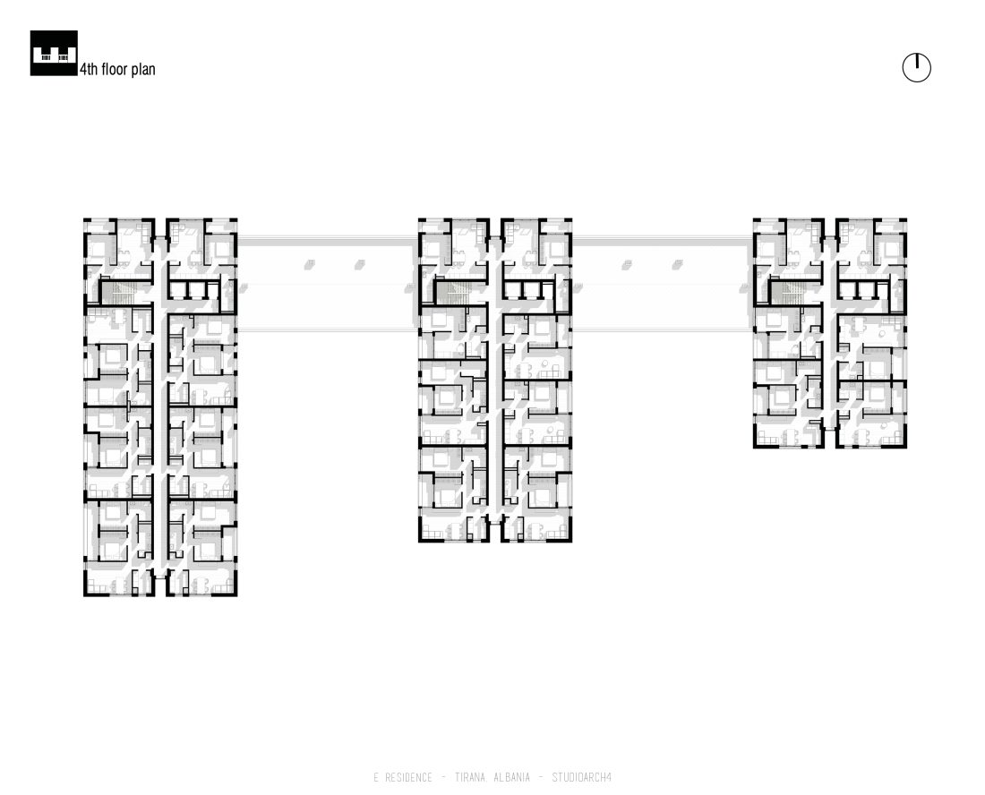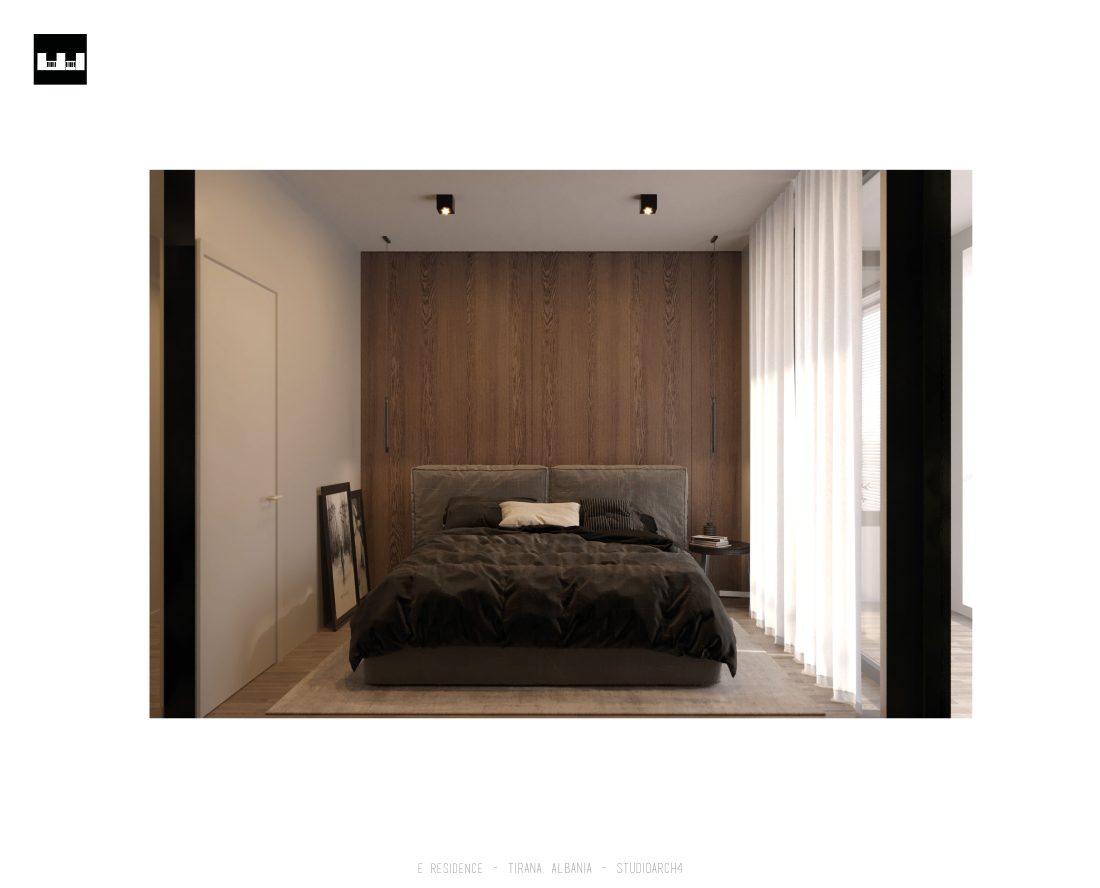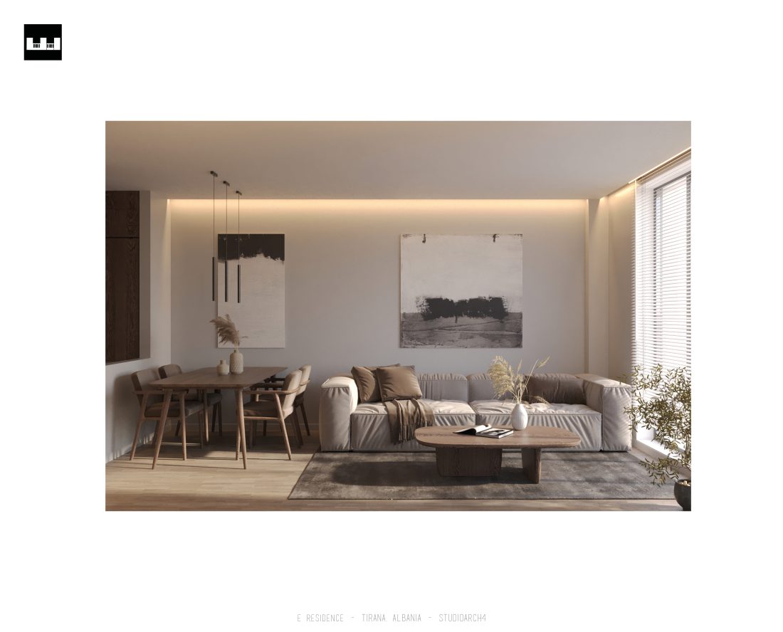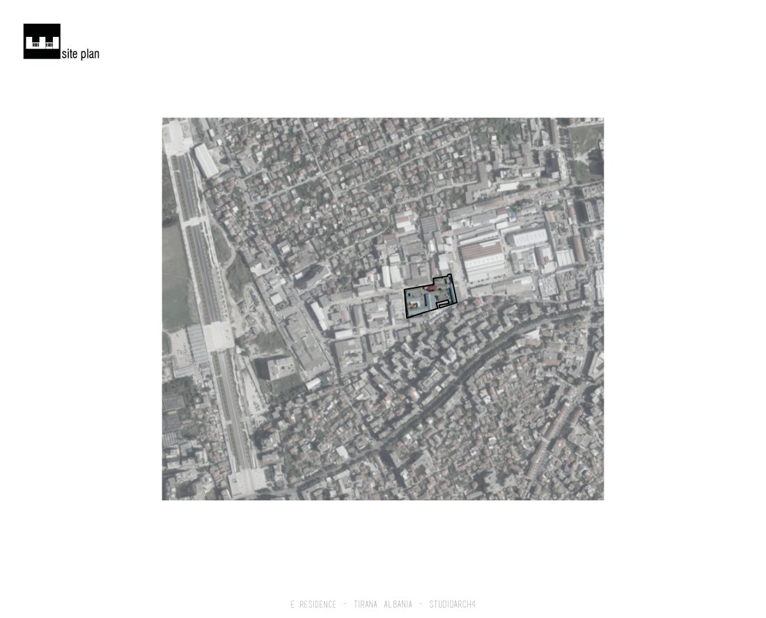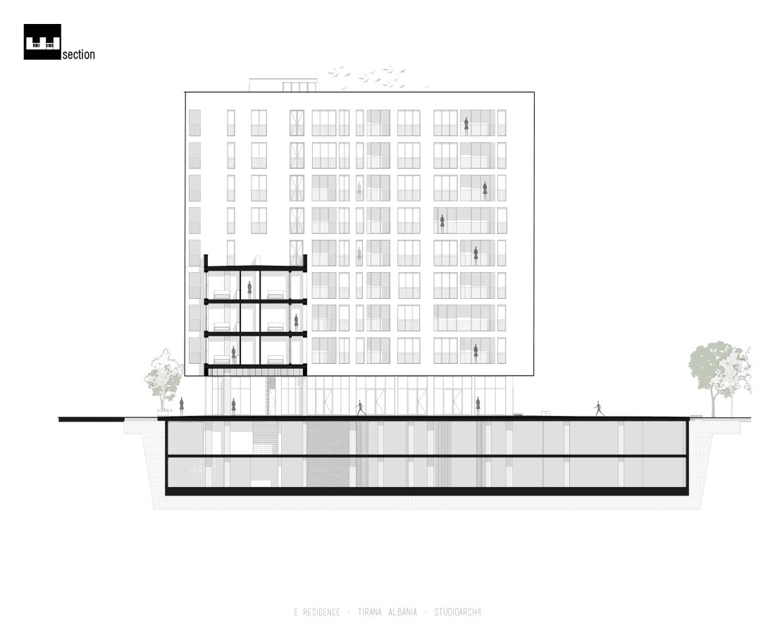REZIDENCA ‘‘E’’ është një objekt I pozicionuar në rrugën “Zenel Bastari”. Objekti ka një funksion të përzier shërbimi dhe banimi përgjatë nëntë kateve të tij. Banimi fillon në katin e parë deri në katin e tetë, ndërsa shërbimi vendoset në katin përdhe . Në volumetri objekti është menduar si një kompozim i pesë objekteve më të vogla ndër të cilat tre janë të vendosur në drejtimin vertikal në shesh dhe dy të tjerë në drejtimin horizontal. Kjo vendosje bën të mundur krijimin e shesheve dhe hapsirave rekreative në pjesën e pasme të objektit. Në fasadën veriore dhe jugore kjo lëvizje volumetrike është tepër e lexueshme sepse përvec lartësisë së volumeve gjejmë dhe përdorimin e materialeve me ngjyra të ndryshme. Për të krijuar një strehë në fasadën e përparme të objektit është krijuar një tërheqje e katit përdhe me dy metër. Fasada e objektit është propozuar veshje tulle të kuqe dhe të zezë. Nëpërmjet ngjyrës së materialeve do të theksohen edhe më shumë