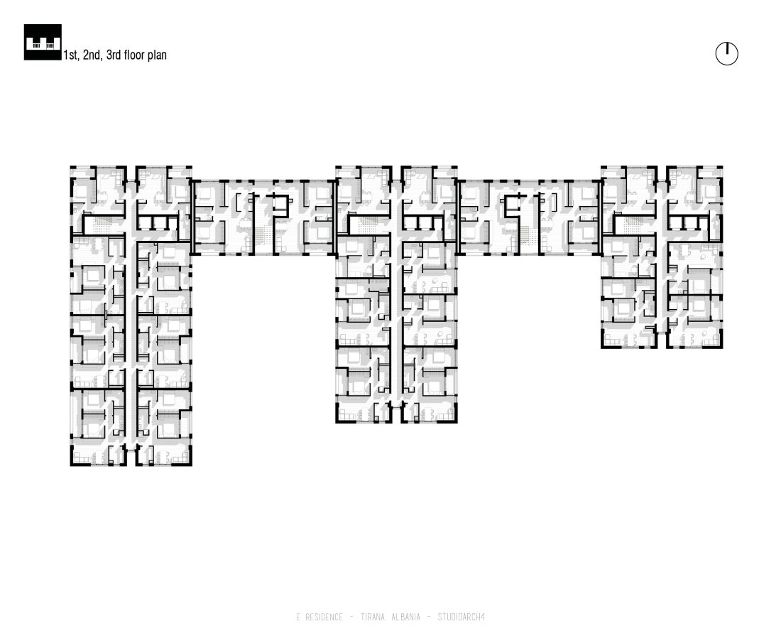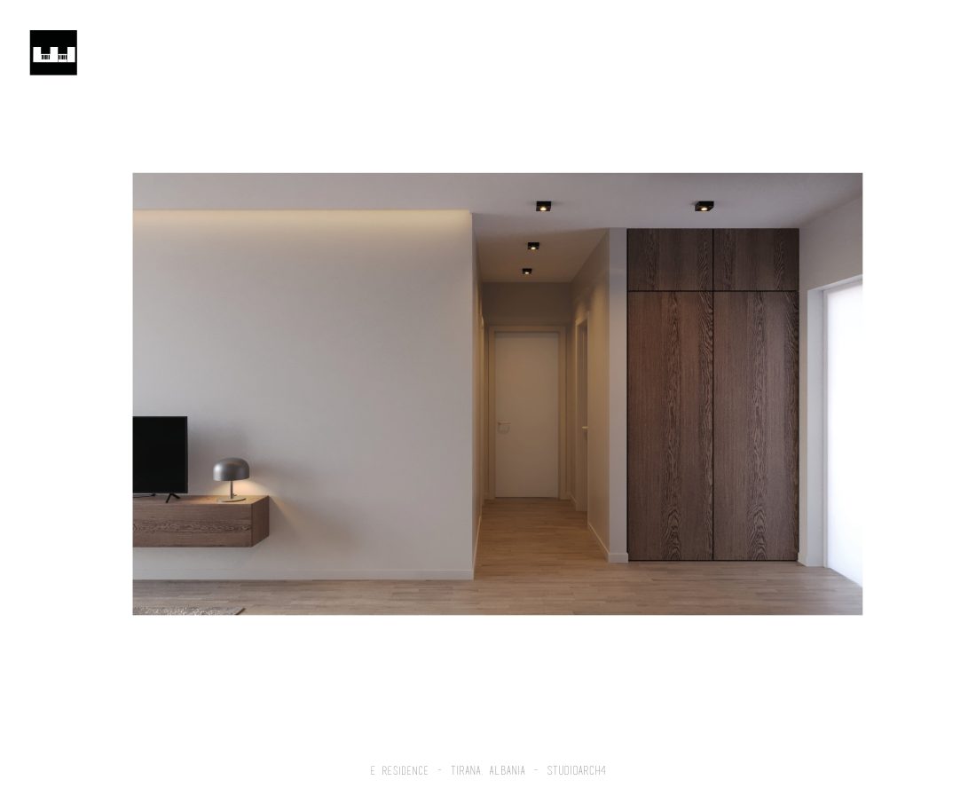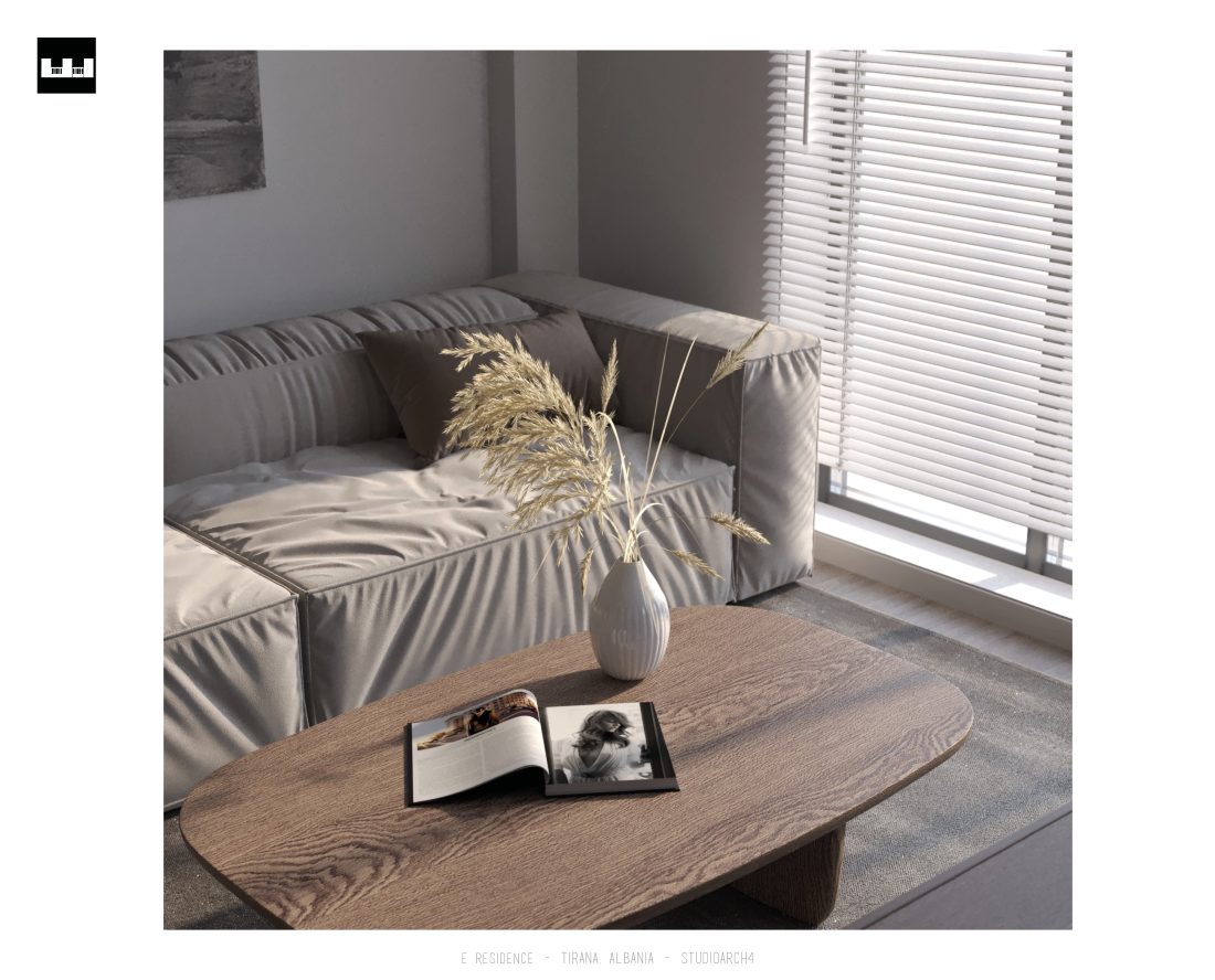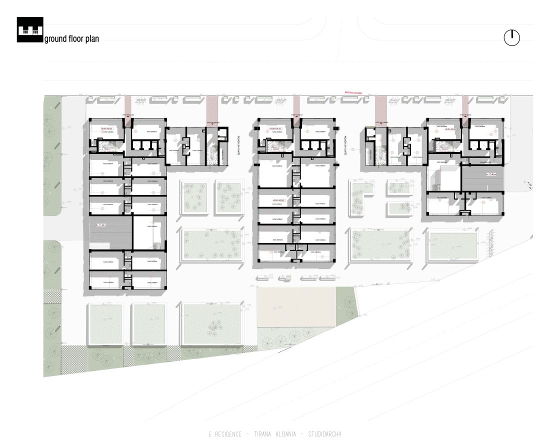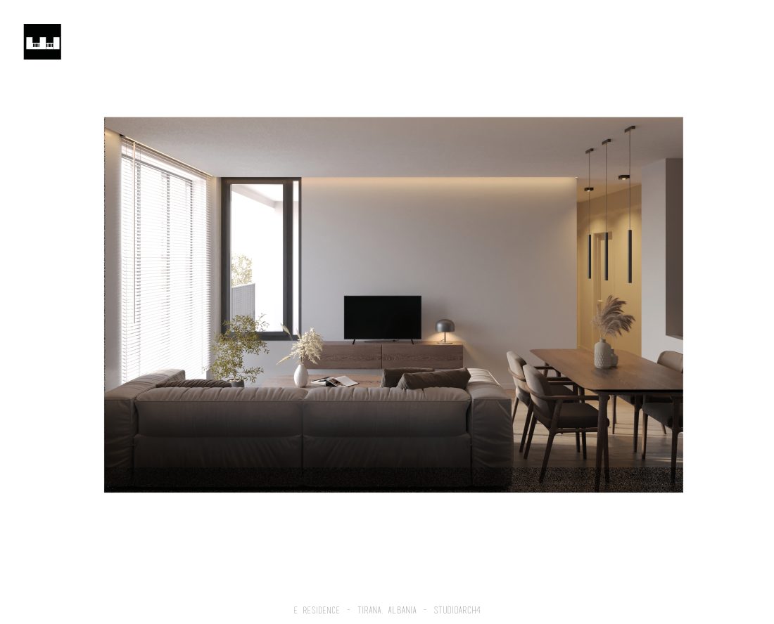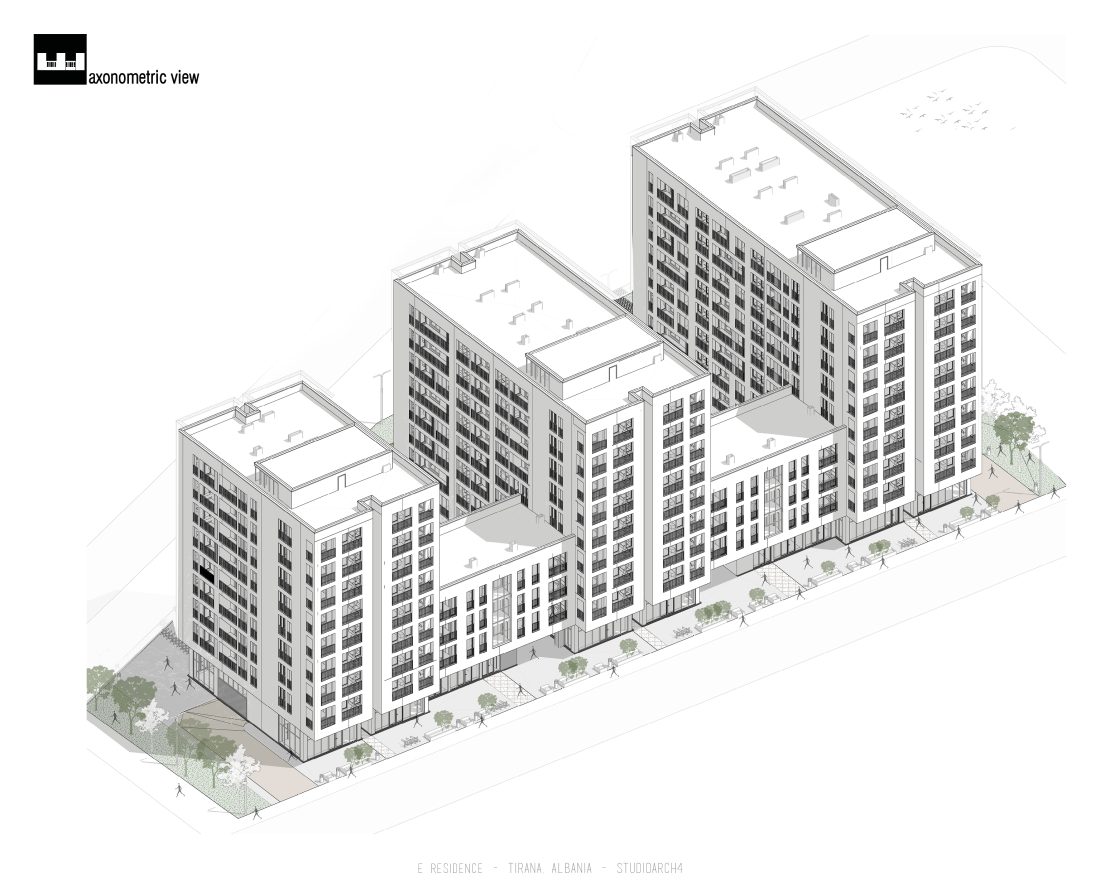 ‘‘E’’ RESIDENCE is an object located on “Zenel Bastari” street. The building has a mixed service and residential function along its nine floors. Housing starts from the first floor to the eighth floor, while the service is located on the ground floor. In volumetric, the object is thought of as a composition of five smaller objects, among which three are located in the vertical direction in the square and the other two in the horizontal direction. This placement makes it possible to create squares and recreational spaces at the back of the building. In the northern and southern facades, this volumetric movement is very legible because, in addition to the height of the volumes, we also find the use of materials with different colors. In order to create a shelter on the front facade of the building, Is been created a two-meter extension on the ground floor.