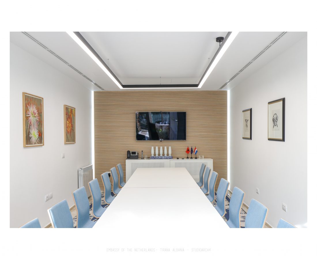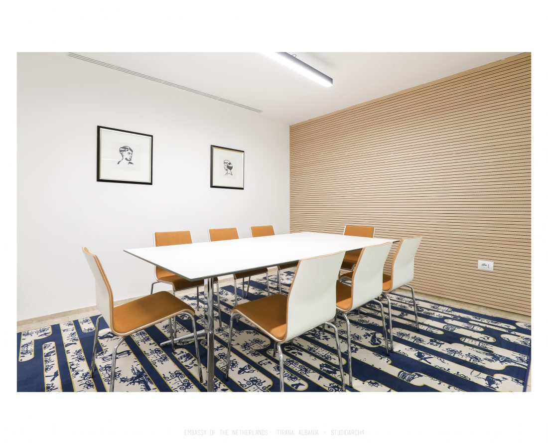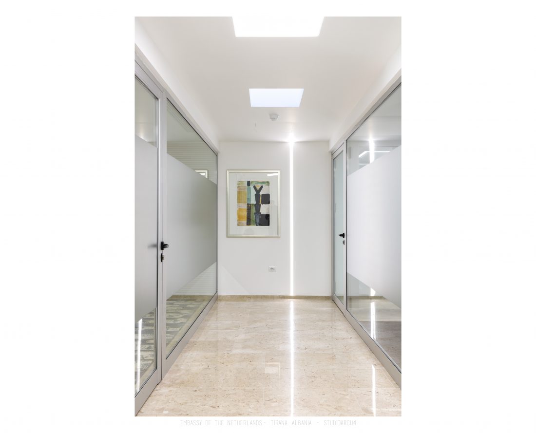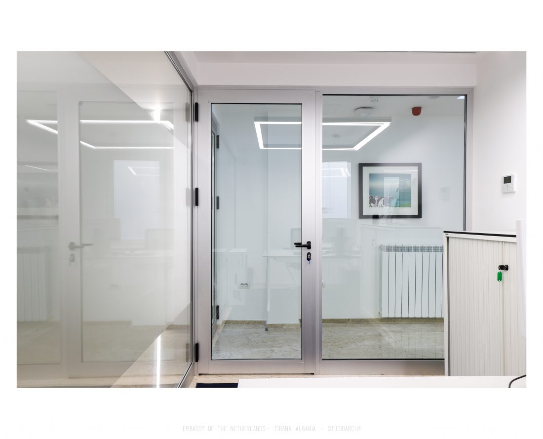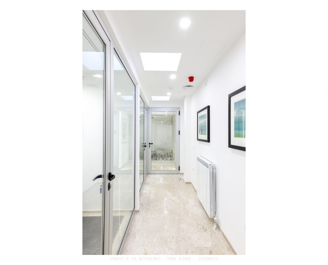 This renovation project of the Embassy of the Netherlands in Tirana focuses on its former consular section – a one floor building that connects to the main building of the Embassy. The function of this building will be to host visitors, engage in lectures, seminars, trainings, and be a working space for Embassy staff. It has two main meeting rooms, and three offices. One of the main characteristics of this renovation is the redesign of the corridor that connects the main building with this section, and does the distribution of the spaces within the building. For the renovation, all interiors walls are to be demolished, for a new design of the interior spaces to take place. All the areas are semi-transparent because at least one of the separating walls of the spaces is made of double glazed glass. The remaining new partitions, beside from the glass, are insulated gypsum walls. The proposal includes the distribution of the new offices, the capacity estimation, the new furnishing and materializing, and the electrical and heating systems.