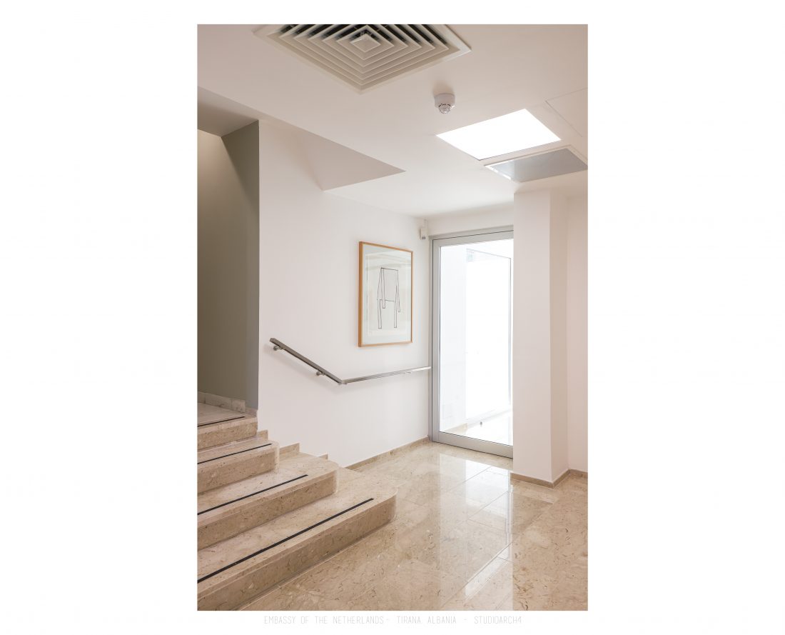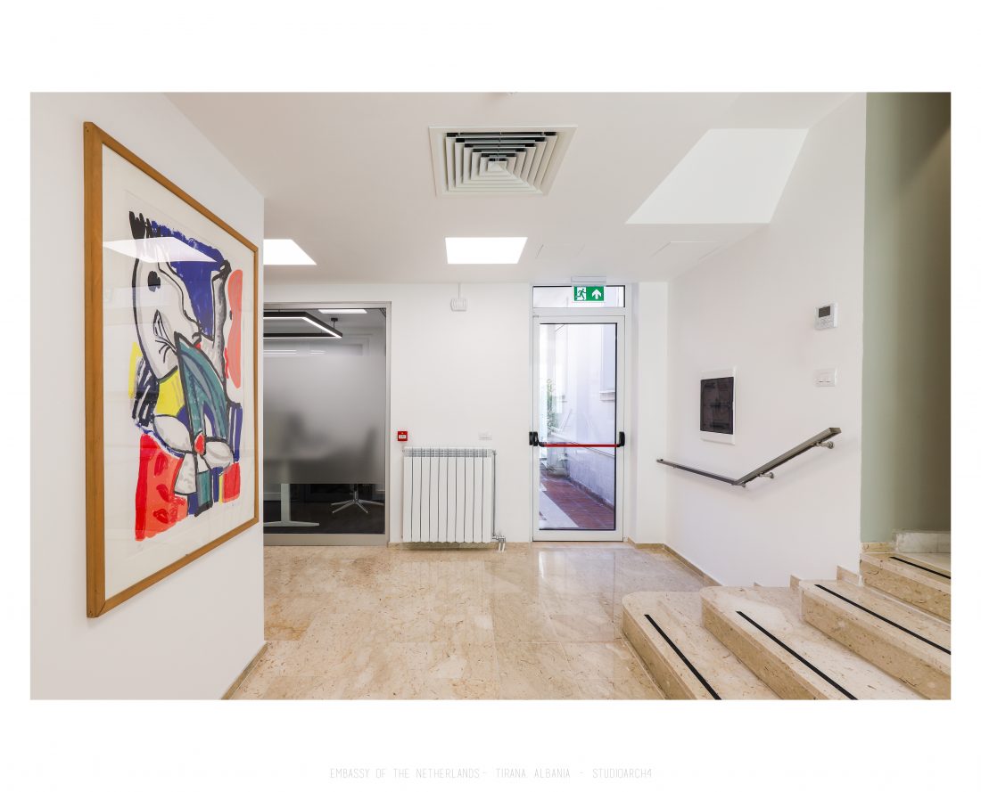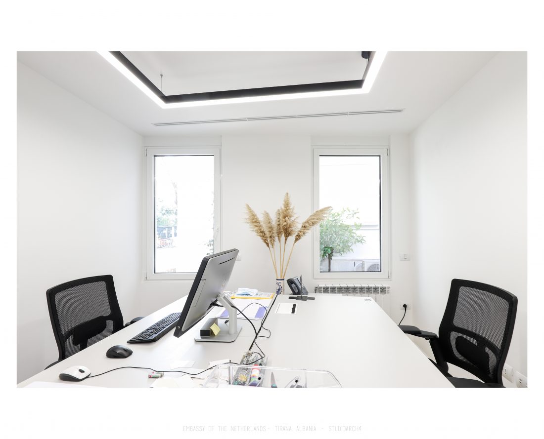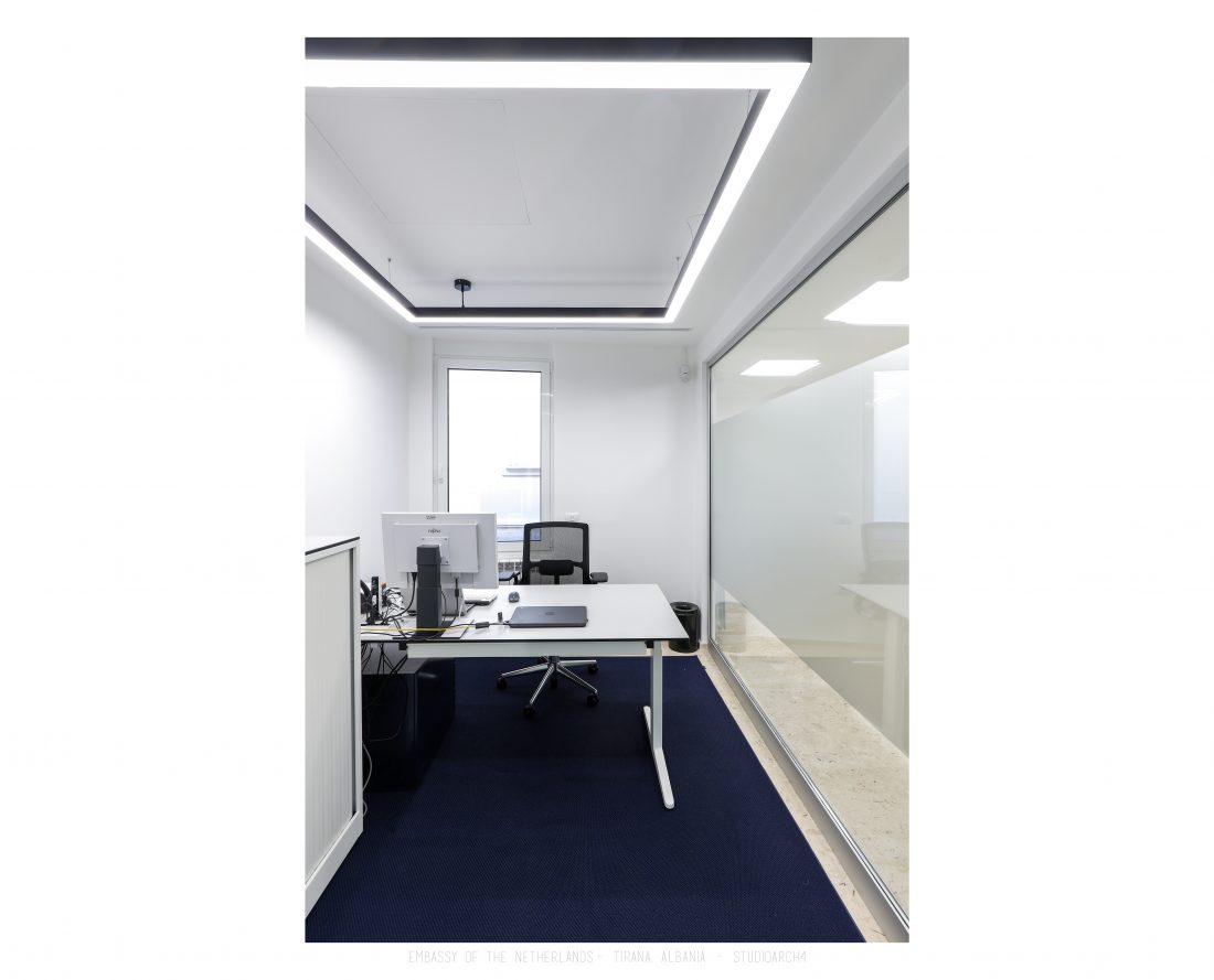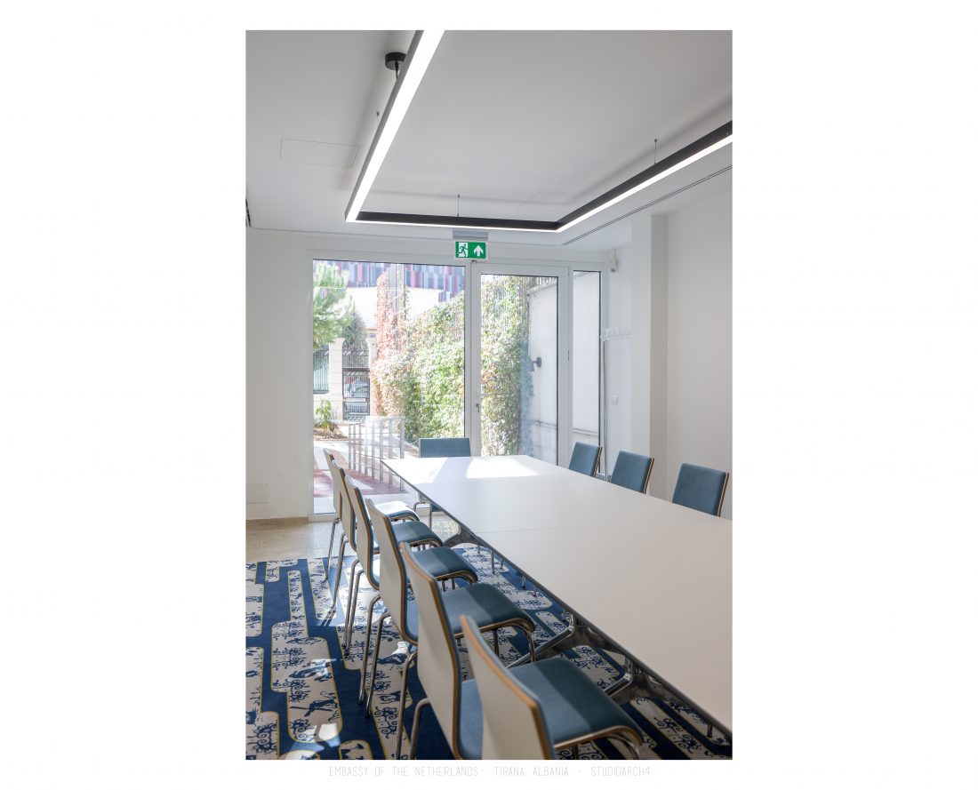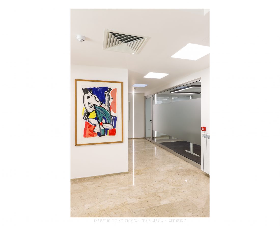 This renovation project of the Embassy of the Netherlands in Tirana focuses on its former consular section – a one floor building that connects to the main building of the Embassy. The function of this building will be to host visitors, engage in lectures, seminars, trainings, and be a working space for Embassy staff. It has two main meeting rooms, and three offices. One of the main characteristics of this renovation is the redesign of the corridor that connects the main building with this section, and does the distribution of the spaces within the building. For the renovation, all interiors walls are to be demolished, for a new design of the interior spaces to take place. All the areas are semi-transparent because at least one of the separating walls of the spaces is made of double glazed glass. The remaining new partitions, beside from the glass, are insulated gypsum walls. The proposal includes the distribution of the new offices, the capacity estimation, the new furnishing and materializing, and the electrical and heating systems.