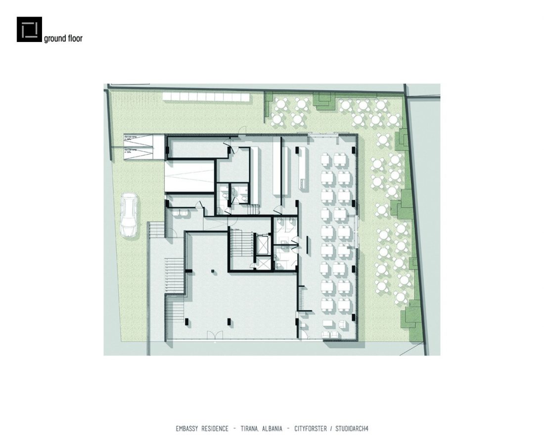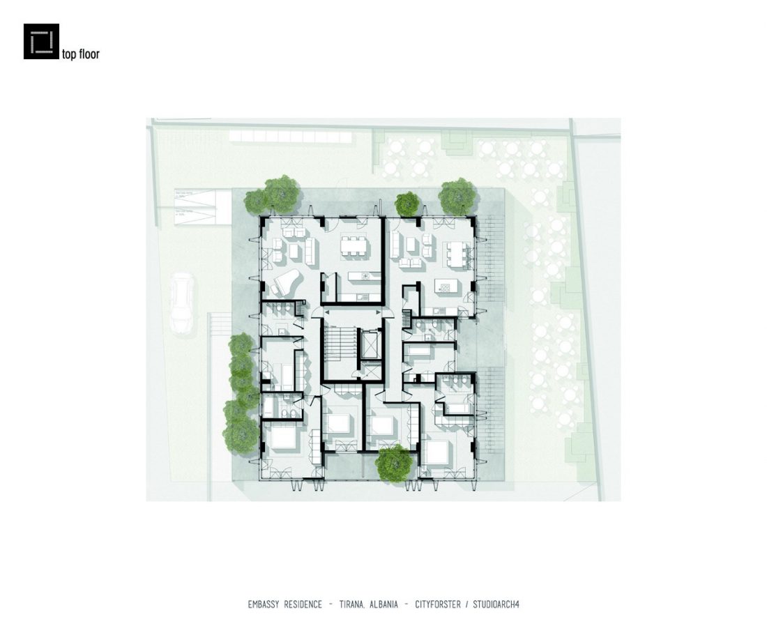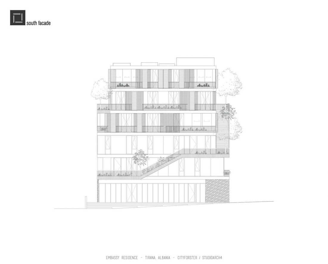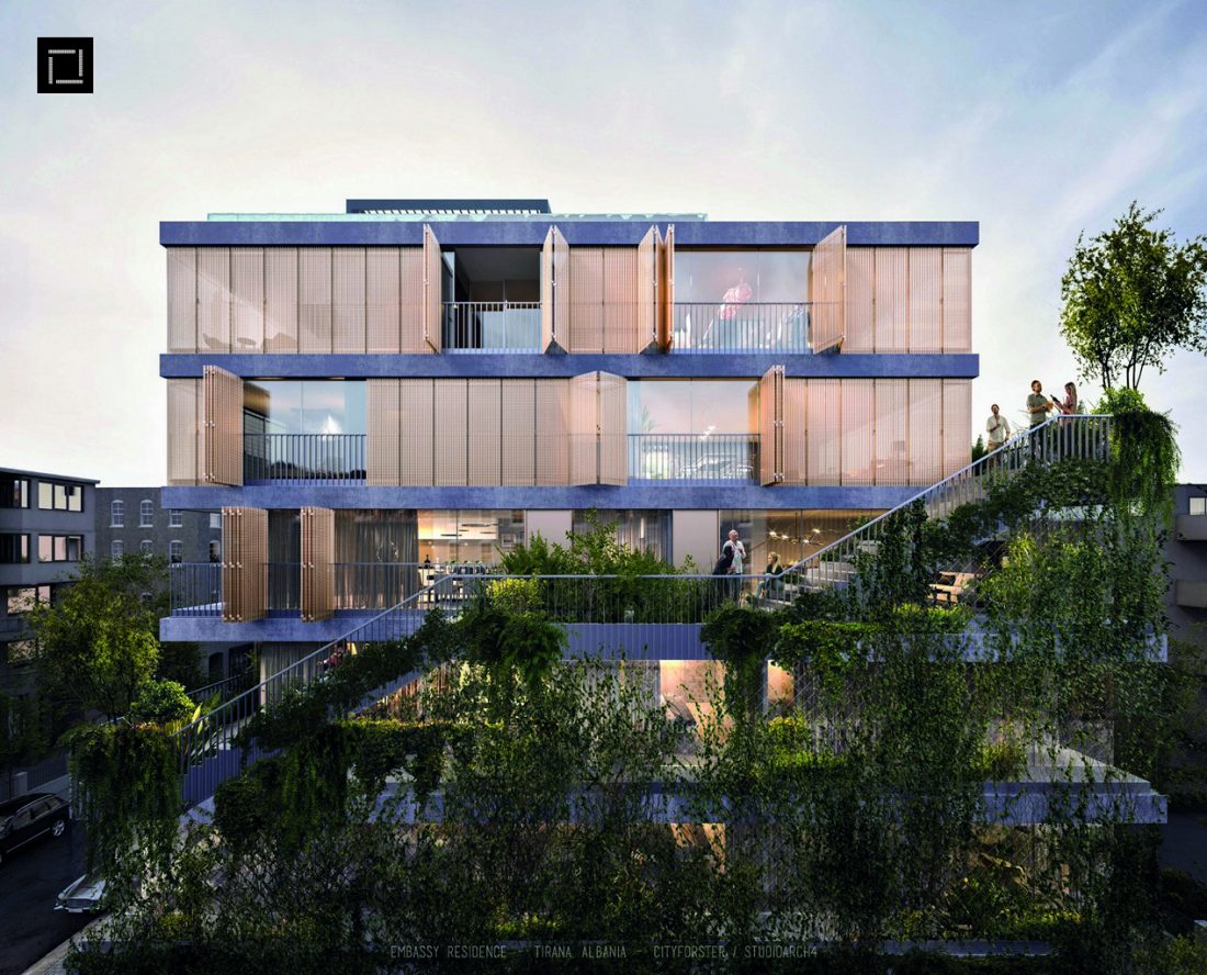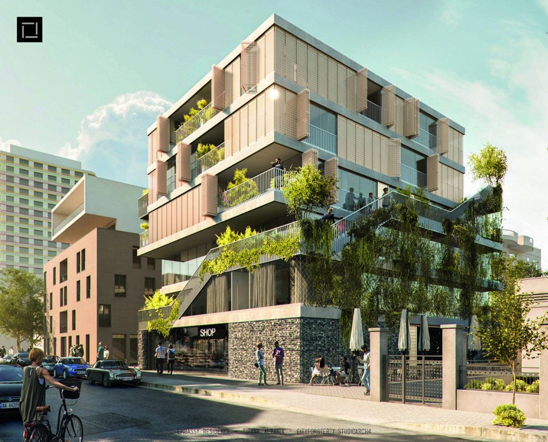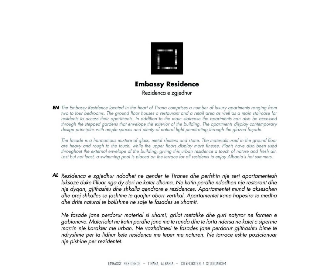 The Embassy Residence located in the heart of Tirana comprises a number of luxury apartments ranging from two to four bedrooms. The ground floor houses a restaurant and a retail area as well as a main staircase for residents to access their apartments. In addition to the main staircase the apartments can also be accessed through the stepped gardens that envelope the exterior of the building. The apartments display contemporary design principles with ample spaces and plenty of natural light penetrating through the glazed facade.