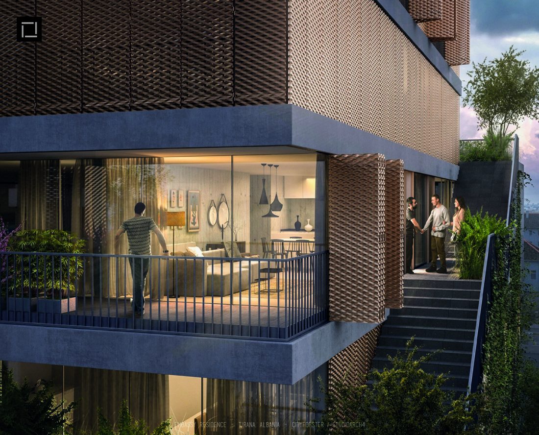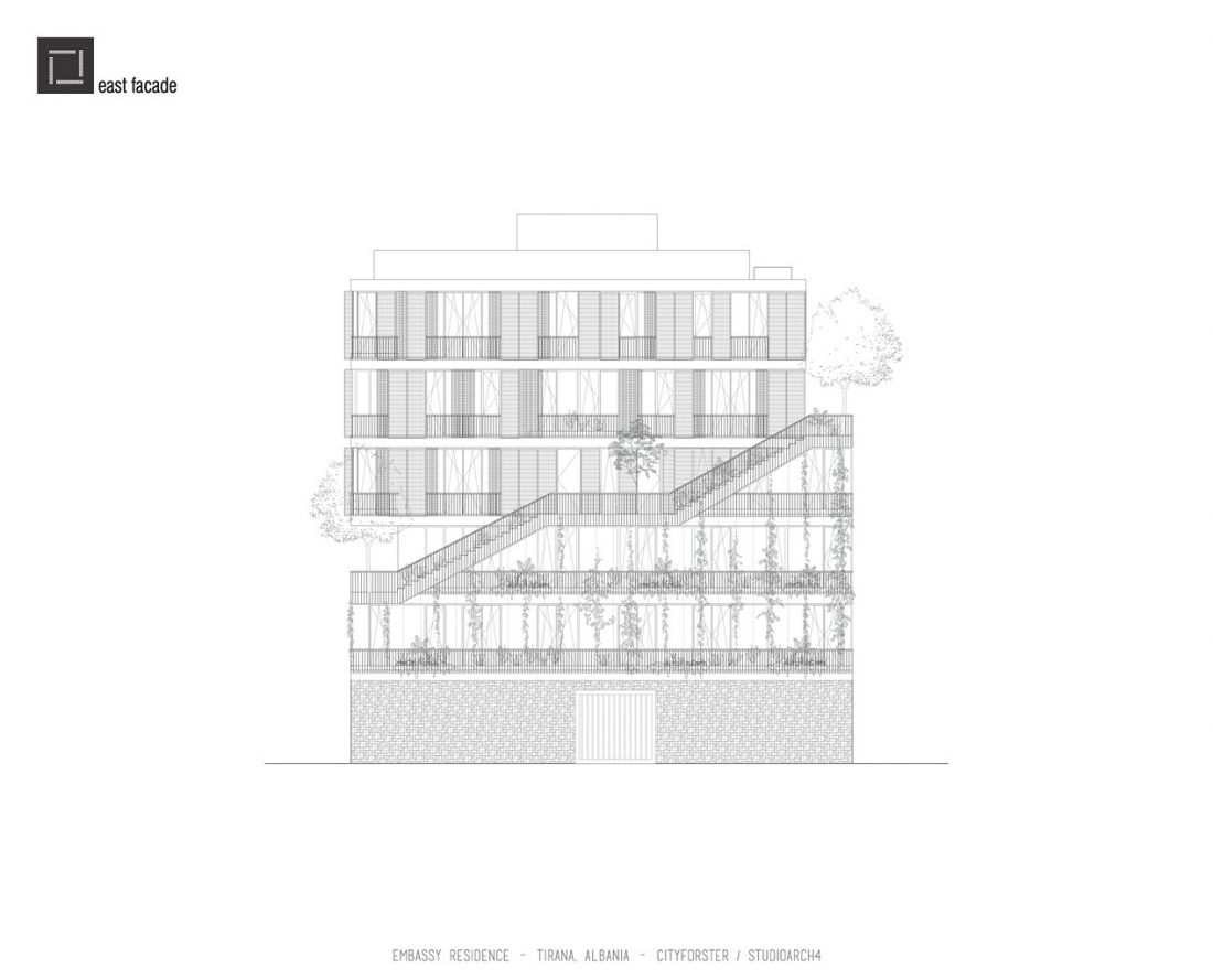 The facade is a harmonious mixture of glass, metal shutters and stone. The materials used in the ground floor are heavy and rough to the touch, while the upper floors display more finesse. Plants have also been used throughout the external envelope of the building, giving this urban residence a touch of nature and fresh air. A swimming pool is placed on the terrace for all residents to enjoy Albania’s hot summers.