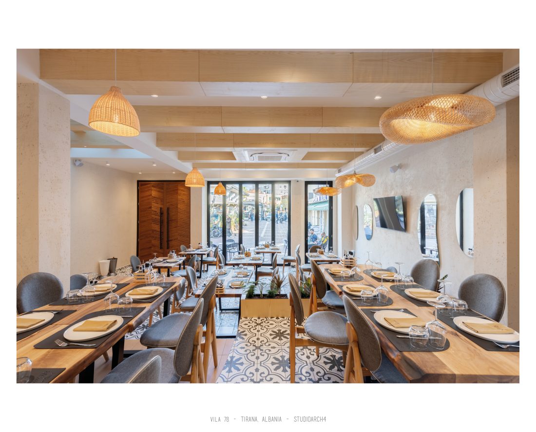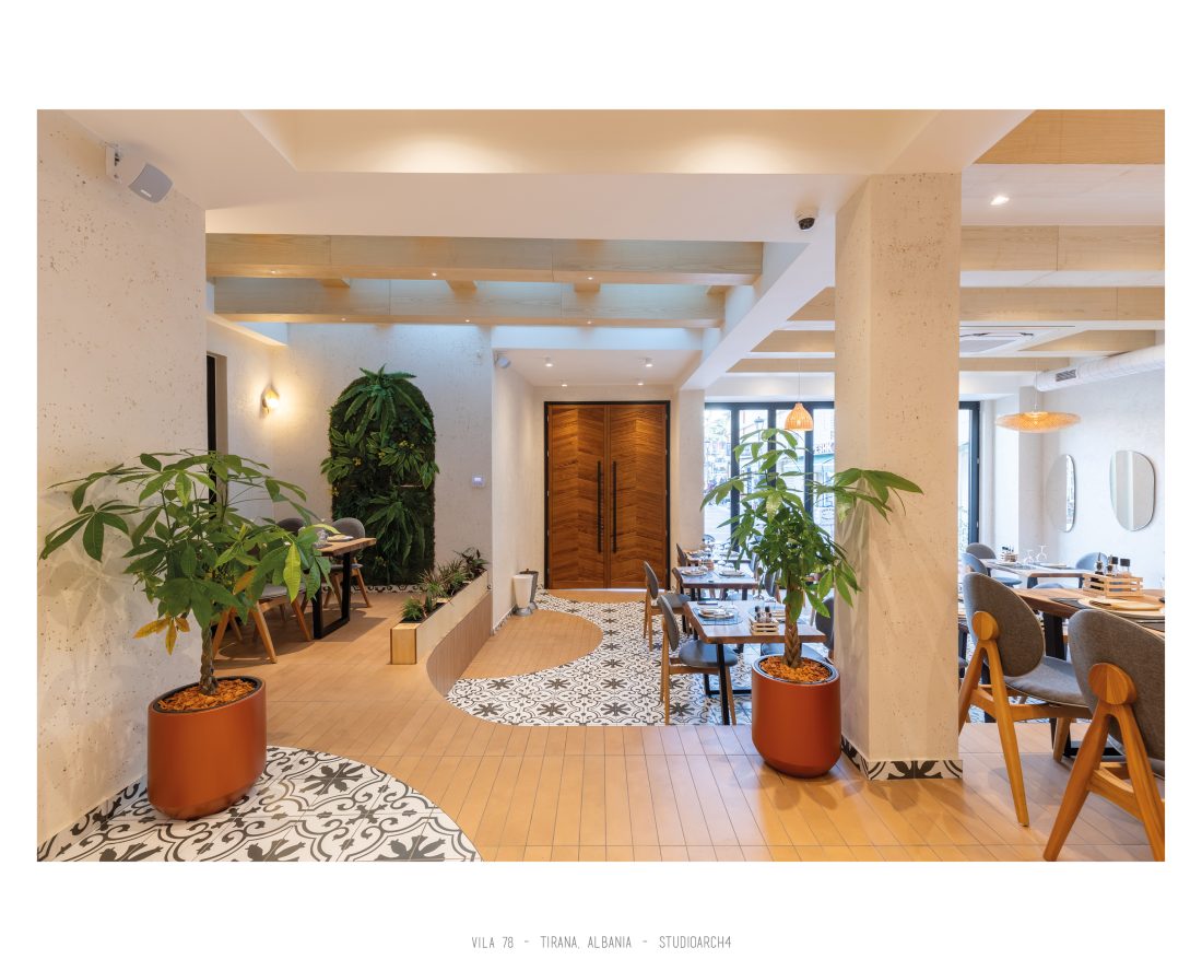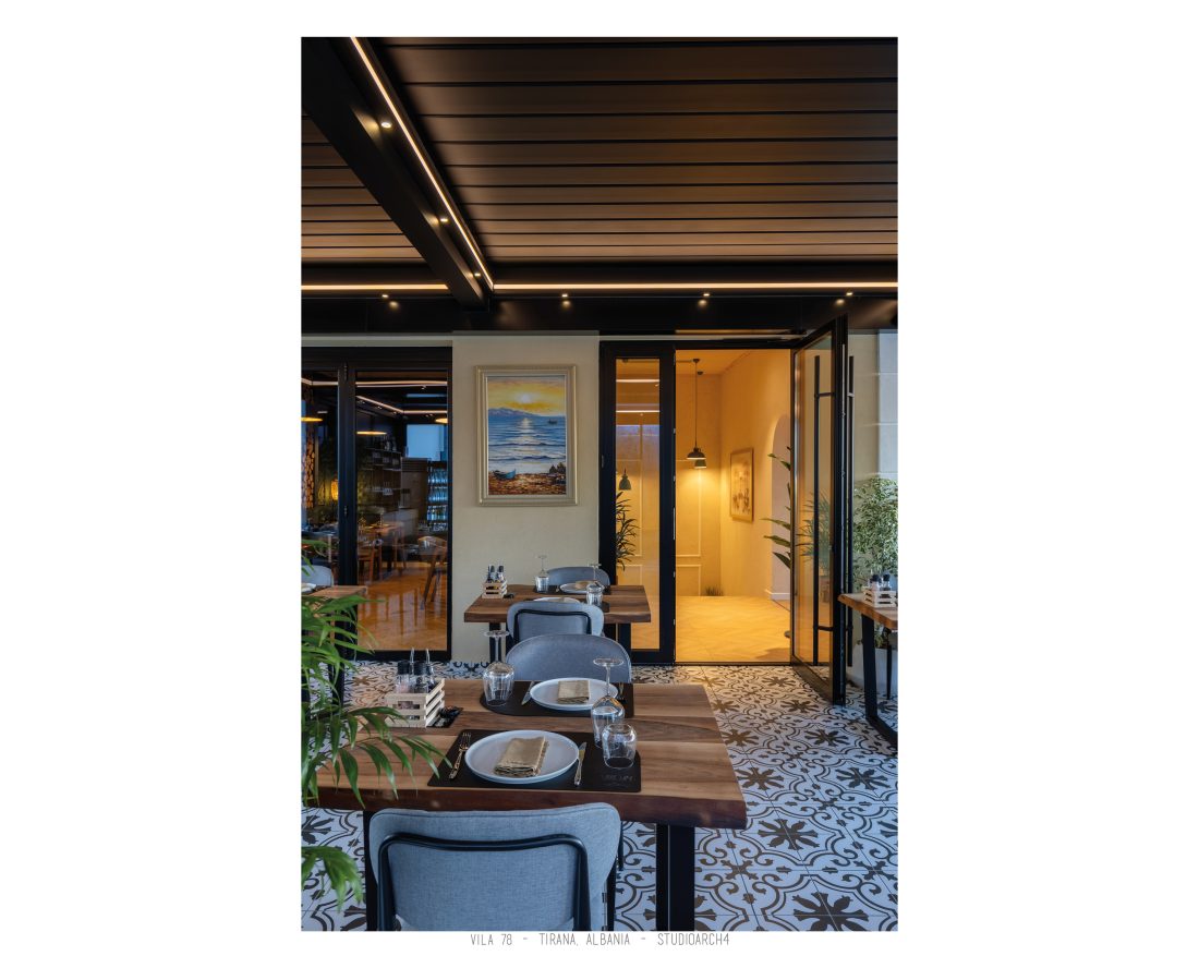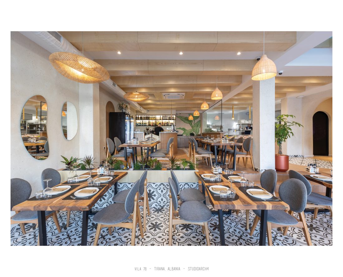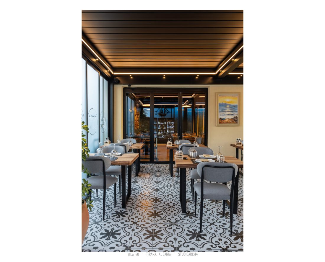 Ky projekt konsiston në transformimin e një vile të vjetër në një restorant tek Pazari i Ri. Qasja e dizajnit është të ruhet ndjenja e “shtëpisë”, duke e theksuar atë me materiale natyrore të tilla si terrakota, mermeri, guri dhe druri. Gërshetimi i materialeve rikthen intimitetin e vilës dhe historinë përmes mureve, dyshemeve dhe tavaneve me ngjyra dhe materiale të ndryshme. Kufizimet strukturore të ndërtesës ekzistuese krijojnë nevojën për një ndërtesë të re për të arritur kapacitetin e dëshiruar. Një oborr i brendshëm krijohet midis ndërtesave, duke kujtuar “oborrin e shtëpisë”. Funksionet janë restoranti, bar, kuzhinë dhe shërbime. Bodrumi ekzistues është zgjeruar dhe përdoret si hapësirë teknike për kuzhinë. Duke përfituar nga lidhja me rrugën, lokali është në katin përdhe të ndërtesës së re dhe oborrin e brendshëm. Kati përdhe i vilës përmban kuzhinën dhe një dhomë ngrënie. Kati i parë i vilës ka dy dhoma ngrënie. Njëra ofron një hapësirë më intime për grupe të mëdha, ndërsa tjetra ka më shumë tavolina. Në këtë të fundit, oxhaku ekzistues rikthehet në funksion. Nga kjo dhomë, mund të lëvizet për në tarracën e ndërtesës së re, e cila është gjysmë e mbuluar me një sistem hijezimi. Ky sistem qëndron i hapur në ditë me diell për hije dhe mbyllet në ditë me shi. Pamja nga tarraca e Pazarit të Ri, vilës dhe oborrit të brendshëm shton vlerë dhe angazhon klientët.
