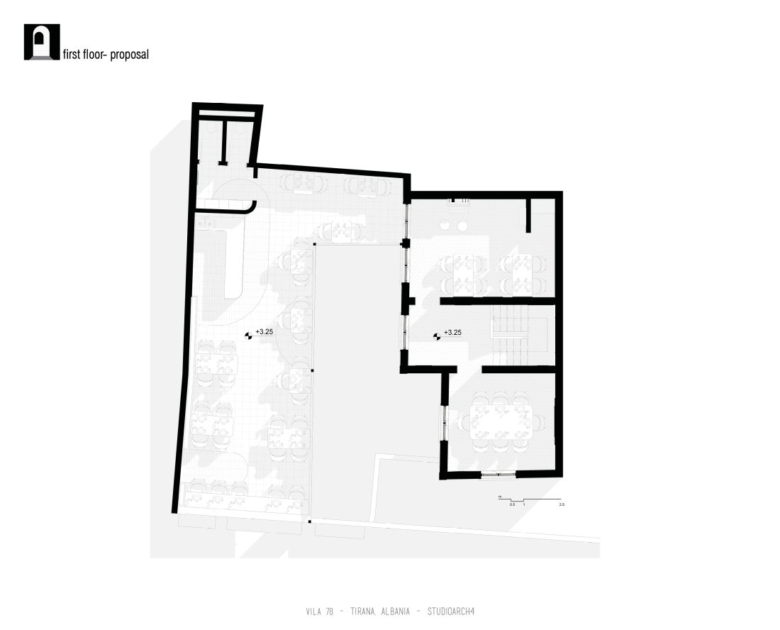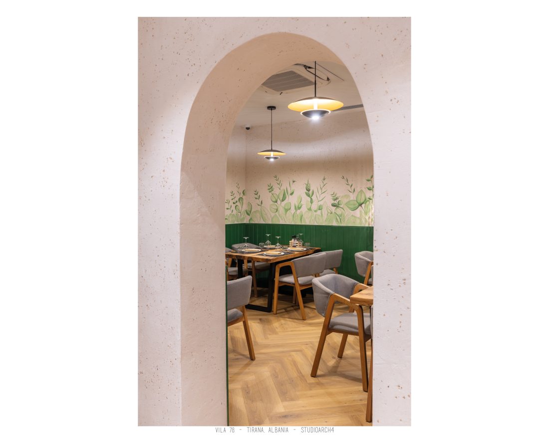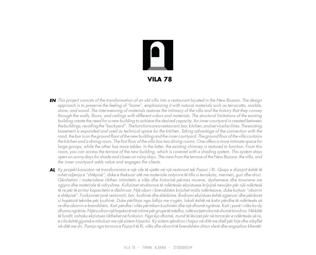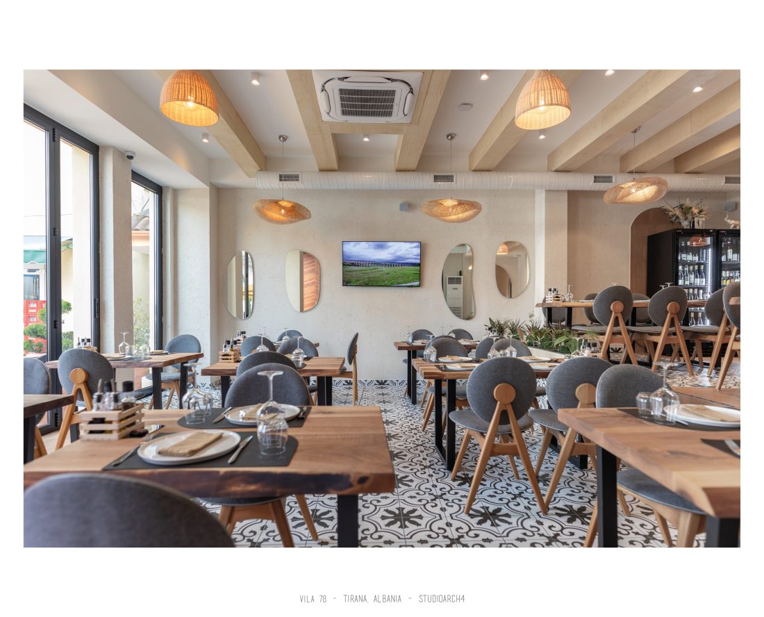 Ky projekt konsiston në transformimin e një vile të vjetër në një restorant tek Pazari i Ri. Qasja e dizajnit është të ruhet ndjenja e “shtëpisë”, duke e theksuar atë me materiale natyrore të tilla si terrakota, mermeri, guri dhe druri. Gërshetimi i materialeve rikthen intimitetin e vilës dhe historinë përmes mureve, dyshemeve dhe tavaneve me ngjyra dhe materiale të ndryshme. Kufizimet strukturore të ndërtesës ekzistuese krijojnë nevojën për një ndërtesë të re për të arritur kapacitetin e dëshiruar. Një oborr i brendshëm krijohet midis ndërtesave, duke kujtuar “oborrin e shtëpisë”. Funksionet janë restoranti, bar, kuzhinë dhe shërbime. Bodrumi ekzistues është zgjeruar dhe përdoret si hapësirë teknike për kuzhinë. Duke përfituar nga lidhja me rrugën, lokali është në katin përdhe të ndërtesës së re dhe oborrin e brendshëm. Kati përdhe i vilës përmban kuzhinën dhe një dhomë ngrënie. Kati i parë i vilës ka dy dhoma ngrënie. Njëra ofron një hapësirë më intime për grupe të mëdha, ndërsa tjetra ka më shumë tavolina. Në këtë të fundit, oxhaku ekzistues rikthehet në funksion. Nga kjo dhomë, mund të lëvizet për në tarracën e ndërtesës së re, e cila është gjysmë e mbuluar me një sistem hijezimi. Ky sistem qëndron i hapur në ditë me diell për hije dhe mbyllet në ditë me shi. Pamja nga tarraca e Pazarit të Ri, vilës dhe oborrit të brendshëm shton vlerë dhe angazhon klientët.