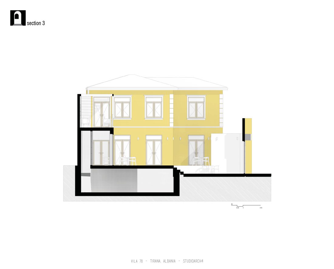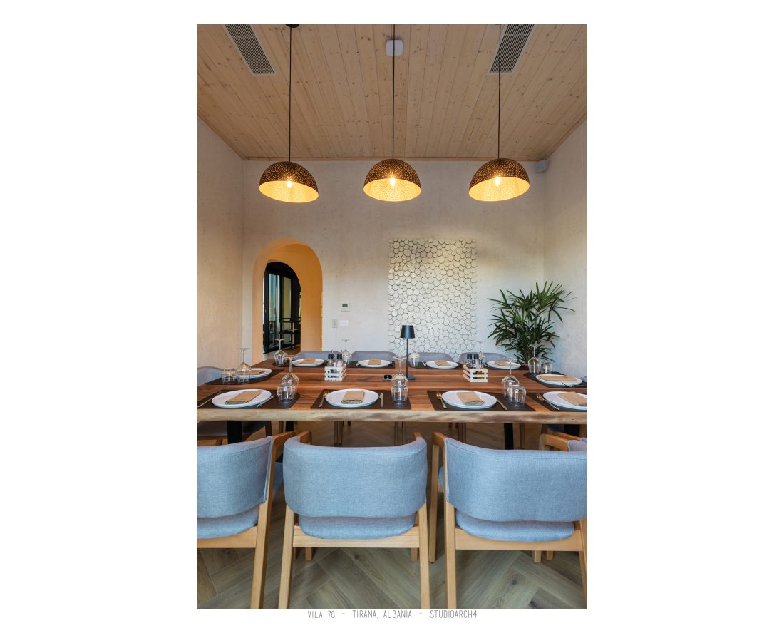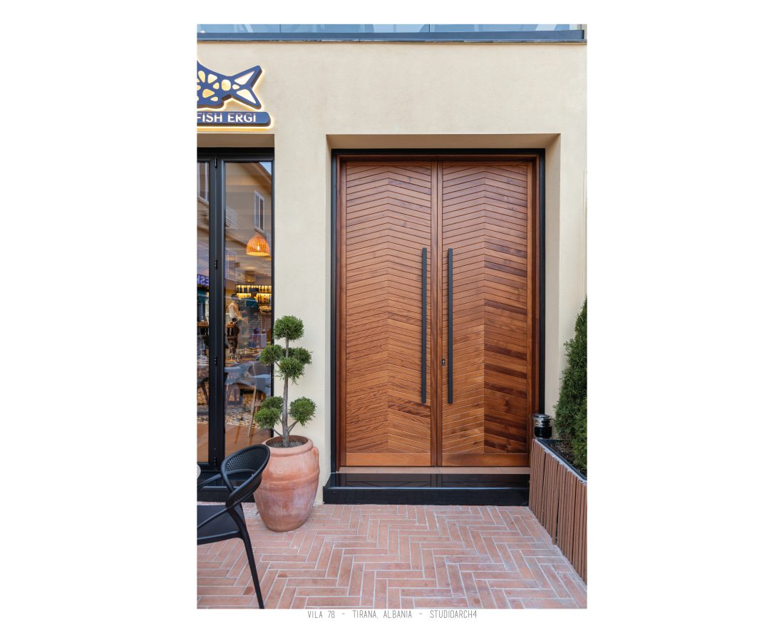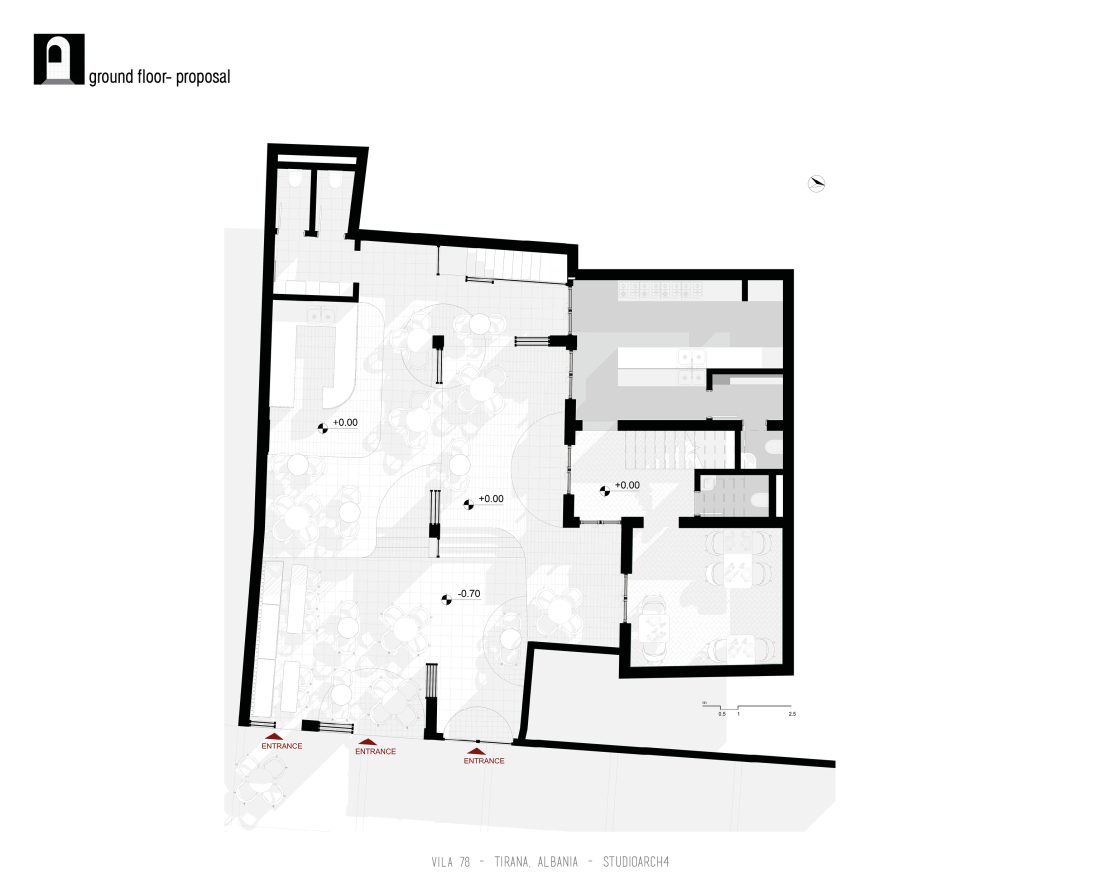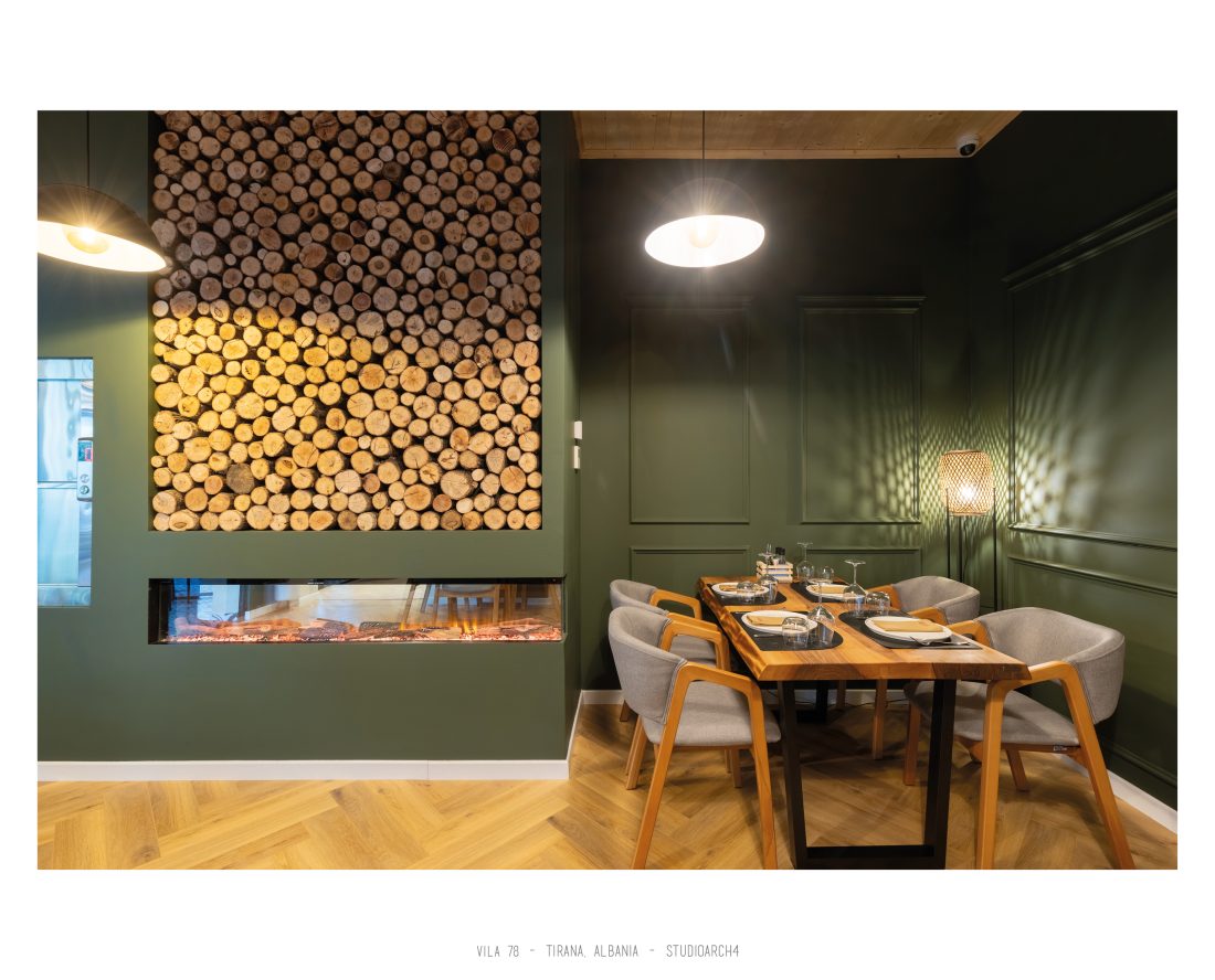 Ky projekt konsiston në transformimin e një vile të vjetër në një restorant tek Pazari i Ri. Qasja e dizajnit është të ruhet ndjenja e “shtëpisë”, duke e theksuar atë me materiale natyrore të tilla si terrakota, mermeri, guri dhe druri. Gërshetimi i materialeve rikthen intimitetin e vilës dhe historinë përmes mureve, dyshemeve dhe tavaneve me ngjyra dhe materiale të ndryshme. Kufizimet strukturore të ndërtesës ekzistuese krijojnë nevojën për një ndërtesë të re për të arritur kapacitetin e dëshiruar. Një oborr i brendshëm krijohet midis ndërtesave, duke kujtuar “oborrin e shtëpisë”. Funksionet janë restoranti, bar, kuzhinë dhe shërbime. Bodrumi ekzistues është zgjeruar dhe përdoret si hapësirë teknike për kuzhinë. Duke përfituar nga lidhja me rrugën, lokali është në katin përdhe të ndërtesës së re dhe oborrin e brendshëm. Kati përdhe i vilës përmban kuzhinën dhe një dhomë ngrënie. Kati i parë i vilës ka dy dhoma ngrënie. Njëra ofron një hapësirë më intime për grupe të mëdha, ndërsa tjetra ka më shumë tavolina. Në këtë të fundit, oxhaku ekzistues rikthehet në funksion. Nga kjo dhomë, mund të lëvizet për në tarracën e ndërtesës së re, e cila është gjysmë e mbuluar me një sistem hijezimi. Ky sistem qëndron i hapur në ditë me diell për hije dhe mbyllet në ditë me shi. Pamja nga tarraca e Pazarit të Ri, vilës dhe oborrit të brendshëm shton vlerë dhe angazhon klientët.