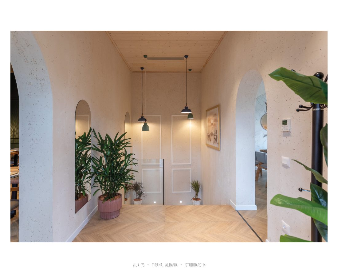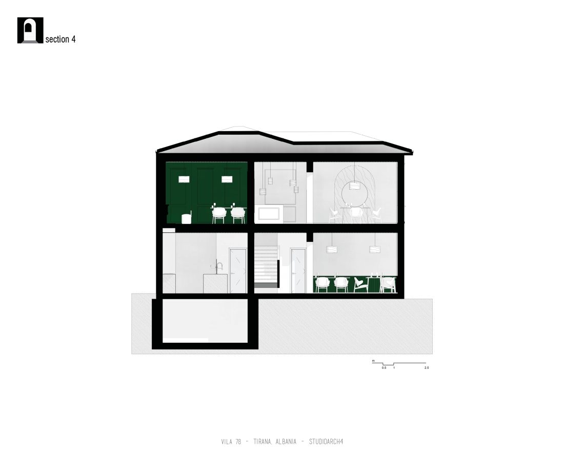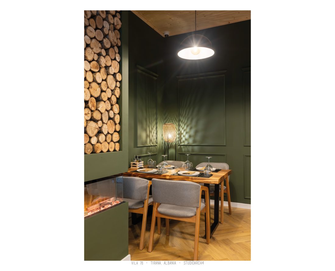 This project consists of the transformation of an old villa into a restaurant located in the New Bazaar. The design approach is to preserve the feeling of “home”, emphasizing it with natural materials such as terracotta, marble, stone, and wood. The interweaving of materials restores the intimacy of the villa and the history that they convey through the walls, floors, and ceilings with different colors and materials. The structural limitations of the existing building create the need for a new building to achieve the desired capacity. An inner courtyard is created between the buildings, recalling the “backyard”. The functions are a restaurant, bar, kitchen, and service facilities. The existing basement is expanded and used as technical space for the kitchen. Taking advantage of the connection with the road, the bar is on the ground floor of the new building and the inner courtyard. The ground floor of the villa contains the kitchen and a dining room. The first floor of the villa has two dining rooms. One offers a more intimate space for large groups, while the other has more tables. In the latter, the existing chimney is restored to function. From this room, you can access the terrace of the new building, which is covered with a shading system. This system stays open on sunny days for shade and closes on rainy days. The view from the terrace of the New Bazaar, the villa, and the inner courtyard adds value and engages the clients.