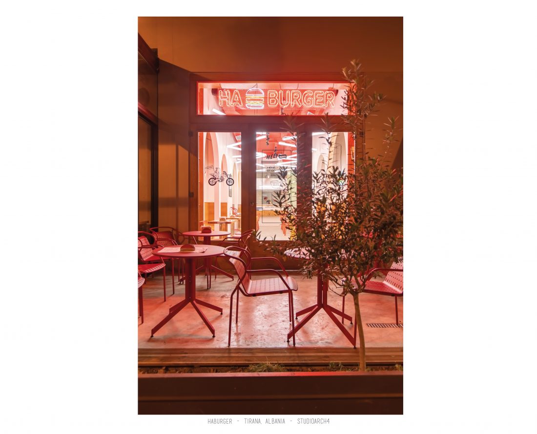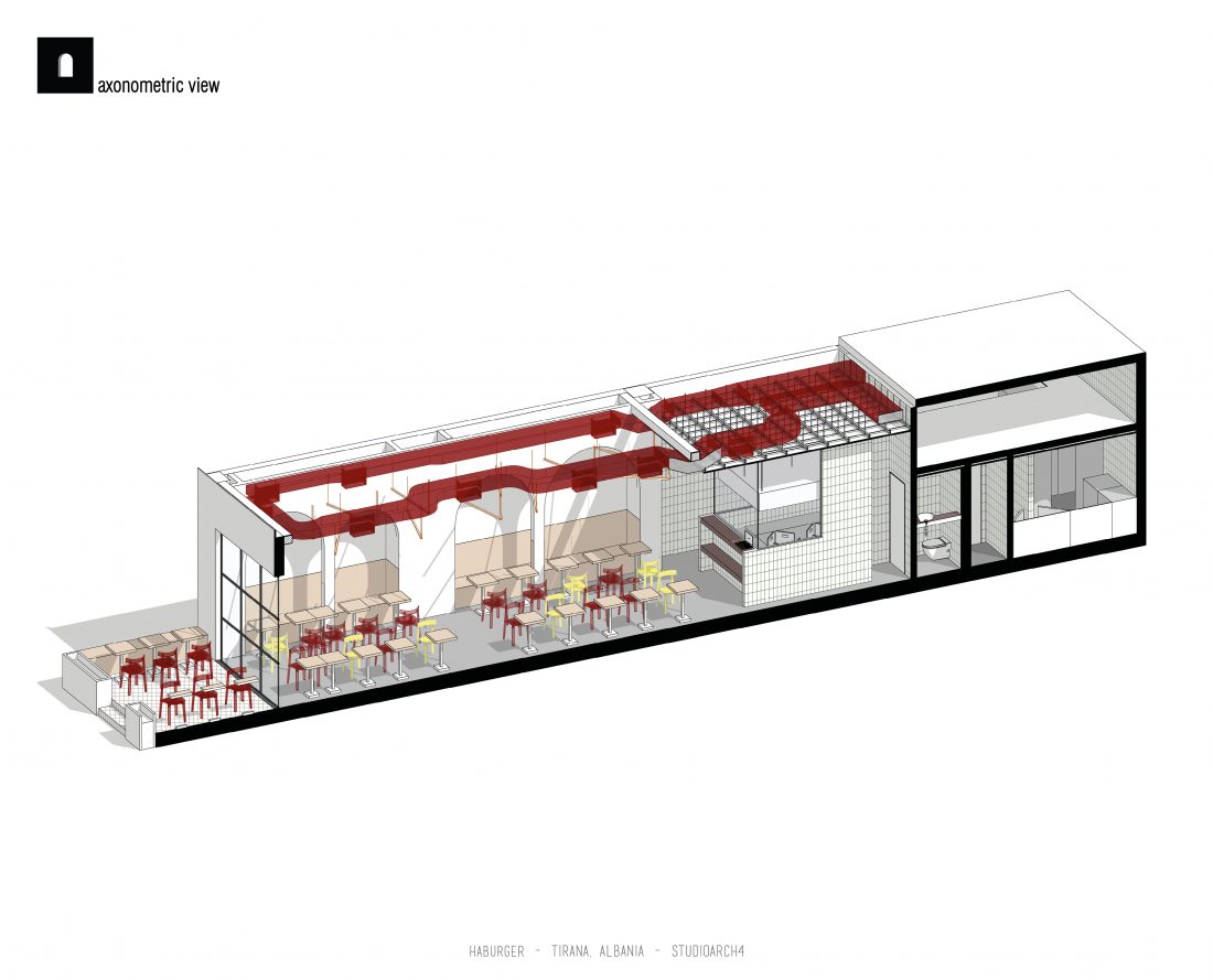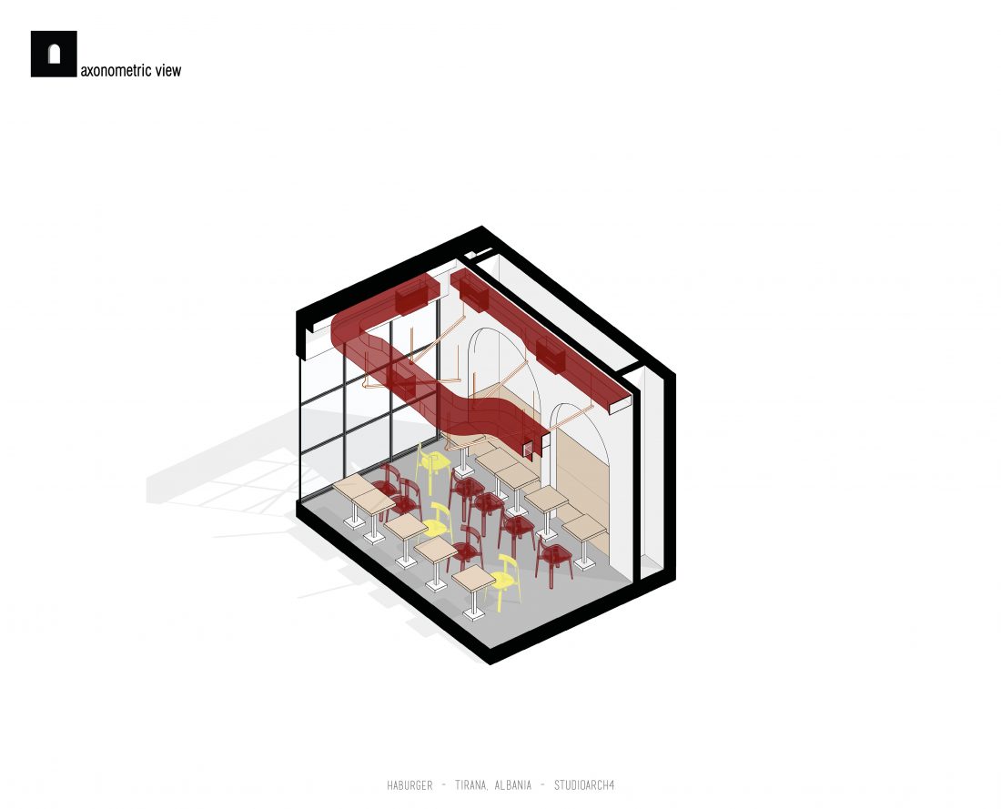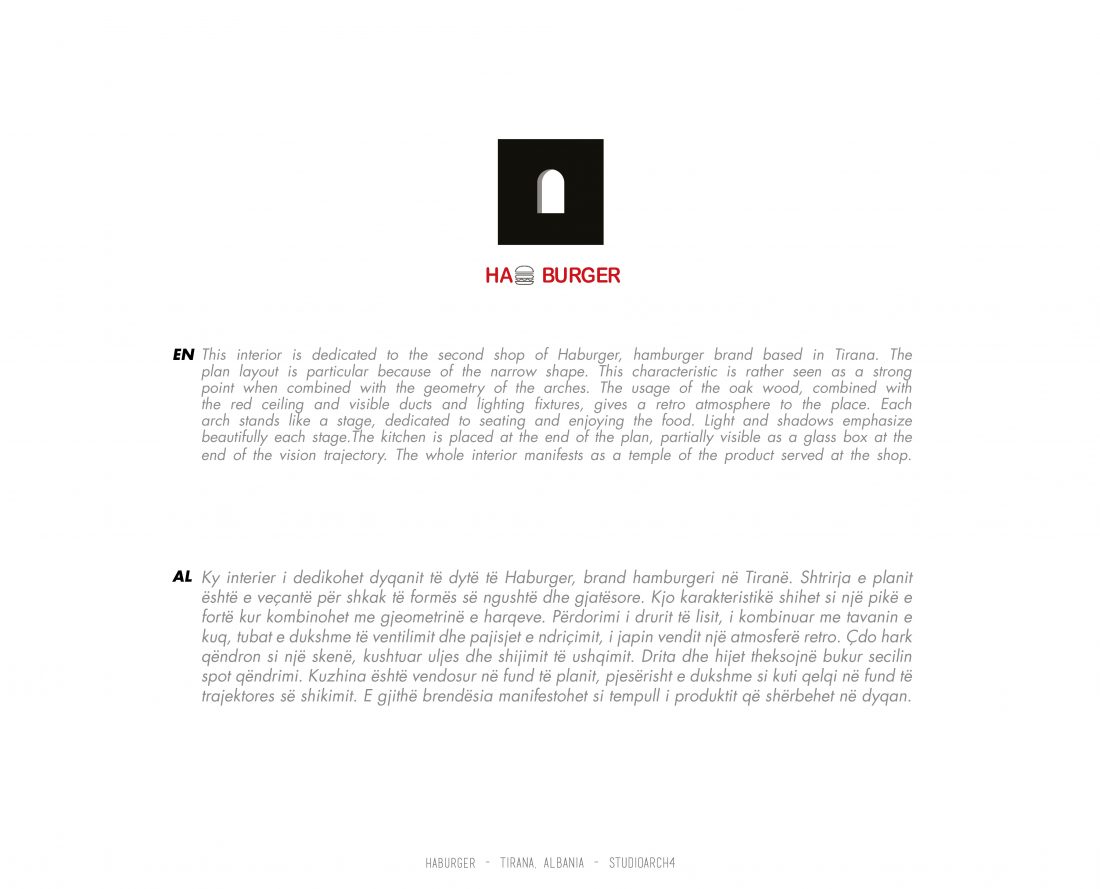 Ky interier i dedikohet dyqanit të dytë të Haburger, brand hamburgeri në Tiranë. Shtrirja e planit është e veçantë për shkak të formës së ngushtë dhe gjatësore. Kjo karakteristikë shihet si një pikë e fortë kur kombinohet me gjeometrinë e harqeve. Përdorimi i drurit të lisit, i kombinuar me tavanin e kuq, tubat e dukshme të ventilimit dhe pajisjet e ndriçimit, i japin vendit një atmosferë retro. Çdo hark qëndron si një skenë, kushtuar uljes dhe shijimit të ushqimit. Drita dhe hijet theksojnë bukur secilin spot qëndrimi. Kuzhina është vendosur në fund të planit, pjesërisht e dukshme si kuti qelqi në fund të trajektores së shikimit. E gjithë brendësia manifestohet si tempull i produktit që shërbehet në dyqan.
