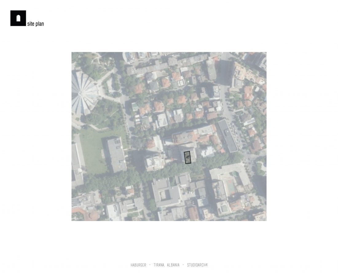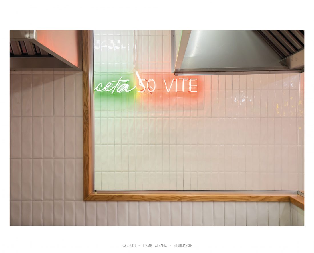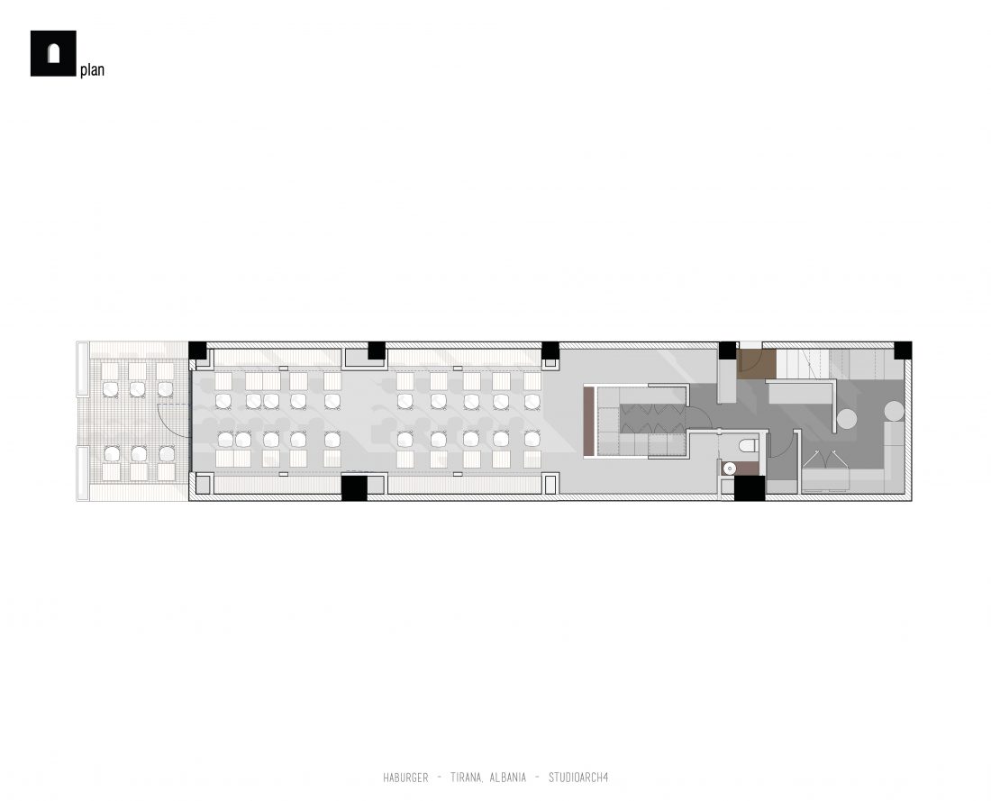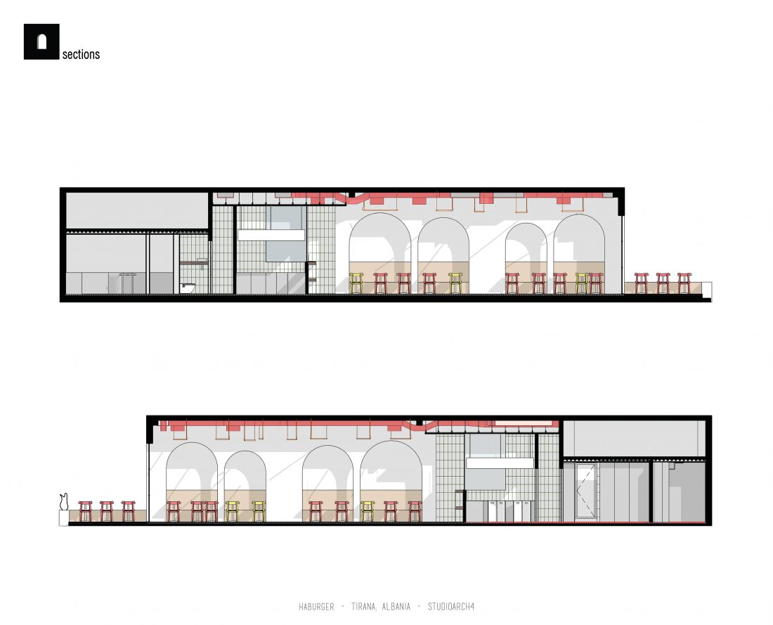 Ky interier i dedikohet dyqanit të dytë të Haburger, brand hamburgeri në Tiranë. Shtrirja e planit është e veçantë për shkak të formës së ngushtë dhe gjatësore. Kjo karakteristikë shihet si një pikë e fortë kur kombinohet me gjeometrinë e harqeve. Përdorimi i drurit të lisit, i kombinuar me tavanin e kuq, tubat e dukshme të ventilimit dhe pajisjet e ndriçimit, i japin vendit një atmosferë retro. Çdo hark qëndron si një skenë, kushtuar uljes dhe shijimit të ushqimit. Drita dhe hijet theksojnë bukur secilin spot qëndrimi. Kuzhina është vendosur në fund të planit, pjesërisht e dukshme si kuti qelqi në fund të trajektores së shikimit. E gjithë brendësia manifestohet si tempull i produktit që shërbehet në dyqan.
