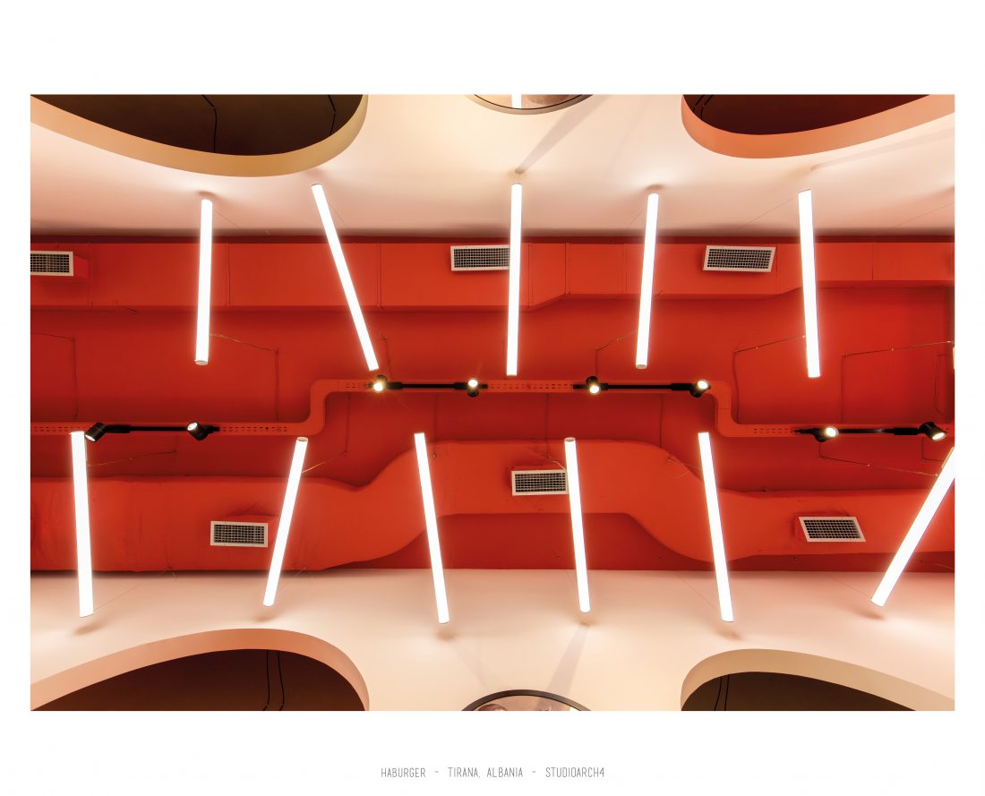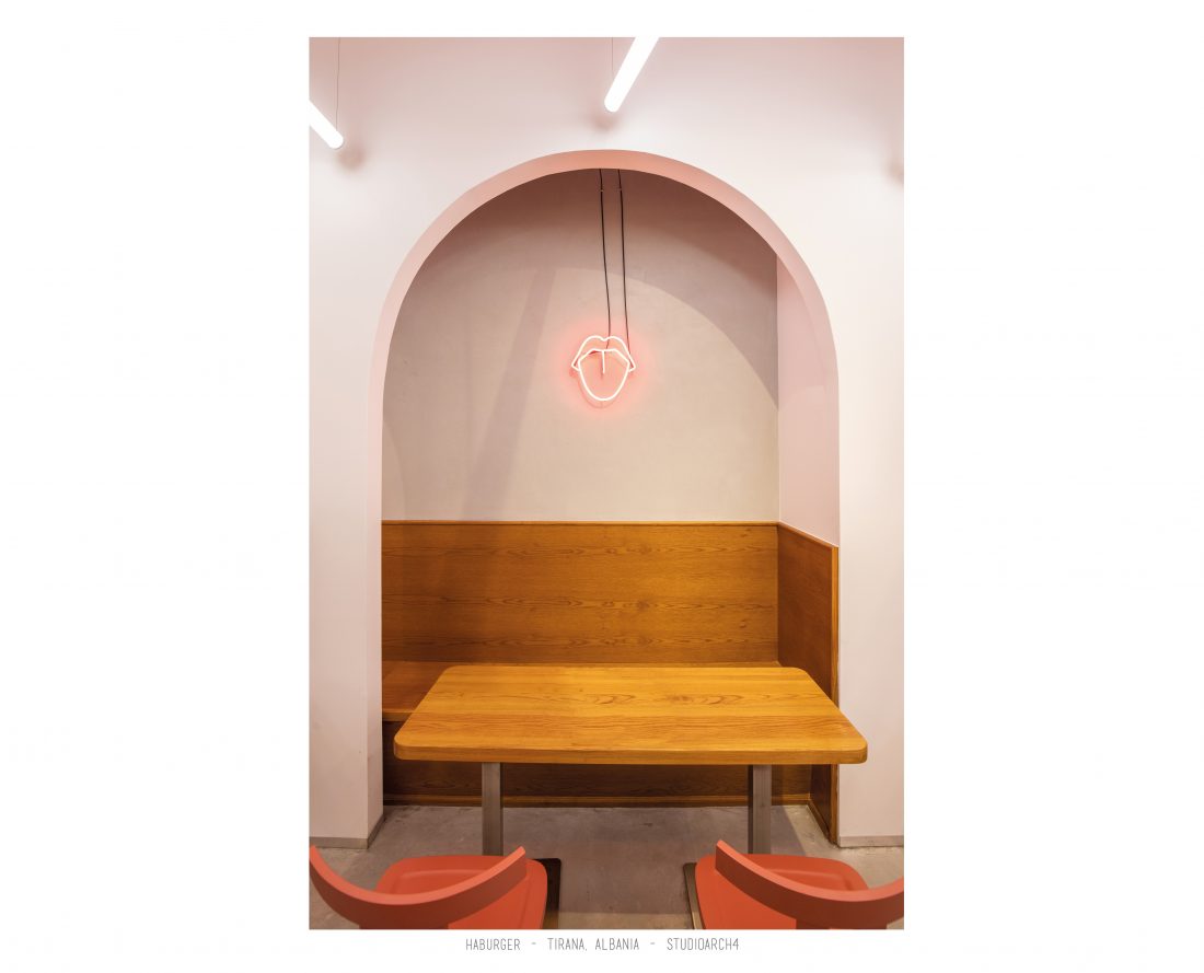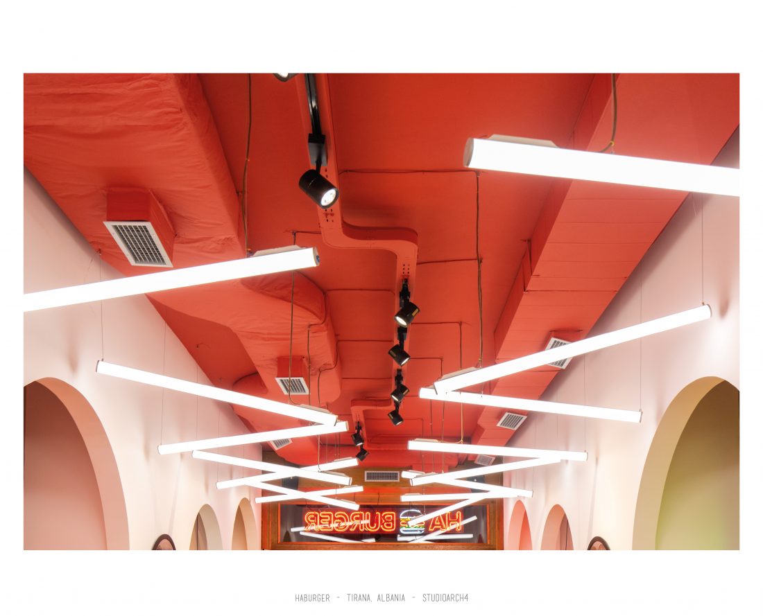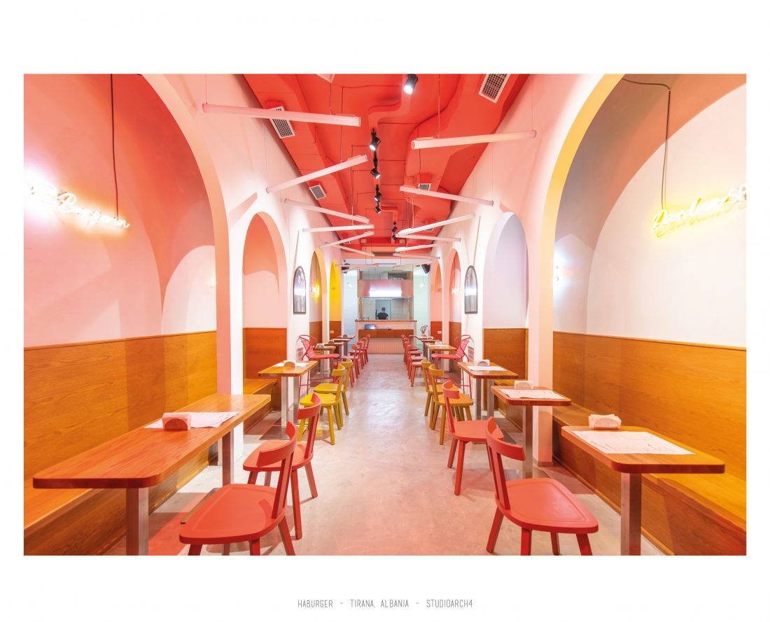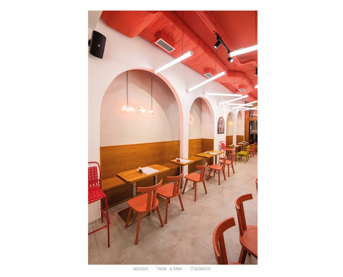 This interior is dedicated to the second shop of Haburger, hamburger brand based in Tirana. The plan layout is particular because of the narrow shape. This characteristic is rather seen as a strong point when combined with the geometry of the arches. The usage of the oak wood, combined with the red ceiling and visible ducts and lighting fixtures, gives a retro atmosphere to the place. Each arch stands like a stage, dedicated to seating and enjoying the food. Light and shadows emphasize beautifully each stage.The kitchen is placed at the end of the plan, partially visible as a glass box at the end of the vision trajectory. The whole interior manifests as a temple of the product served at the shop.