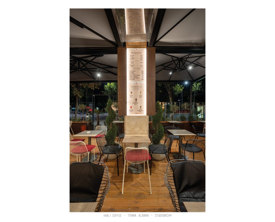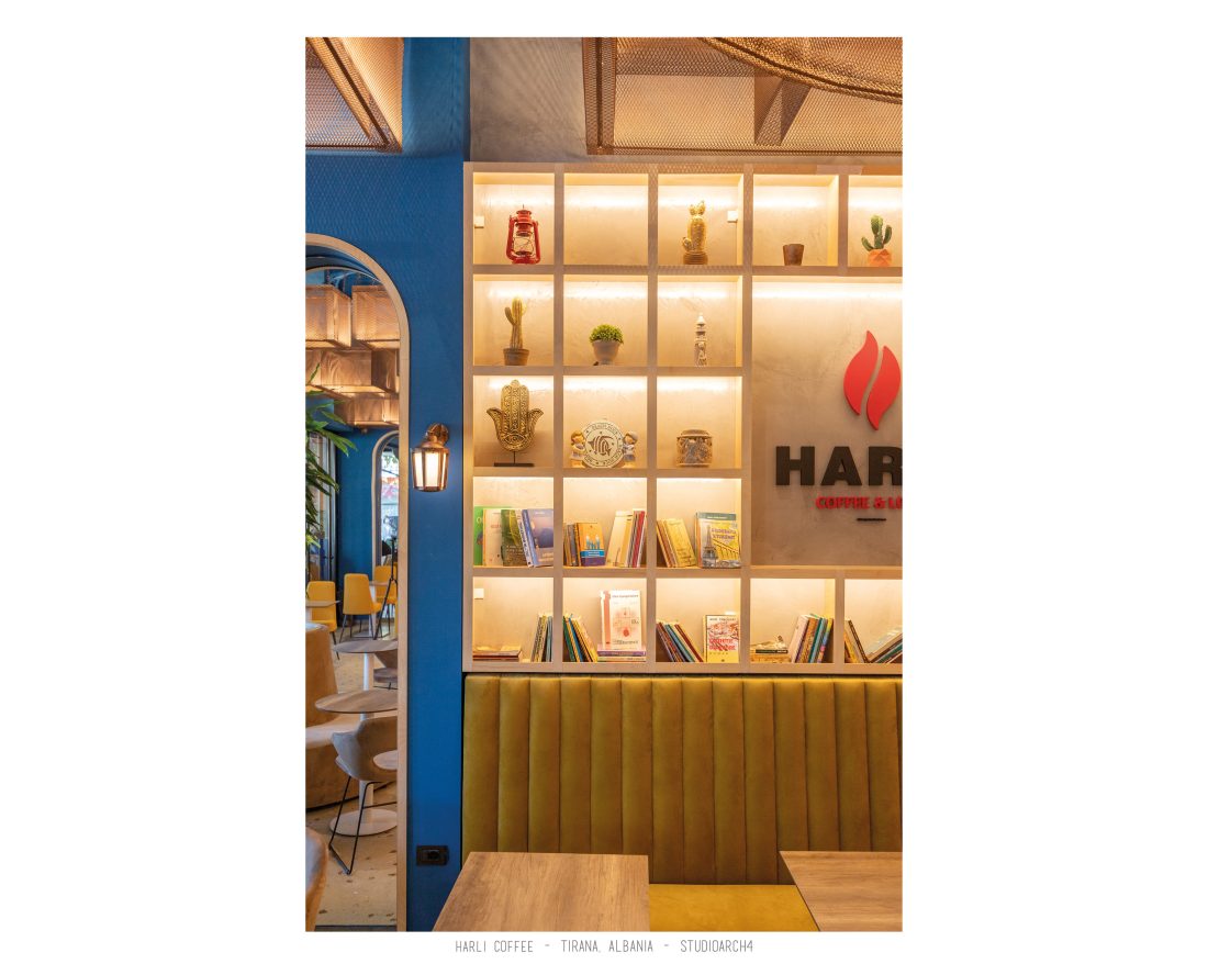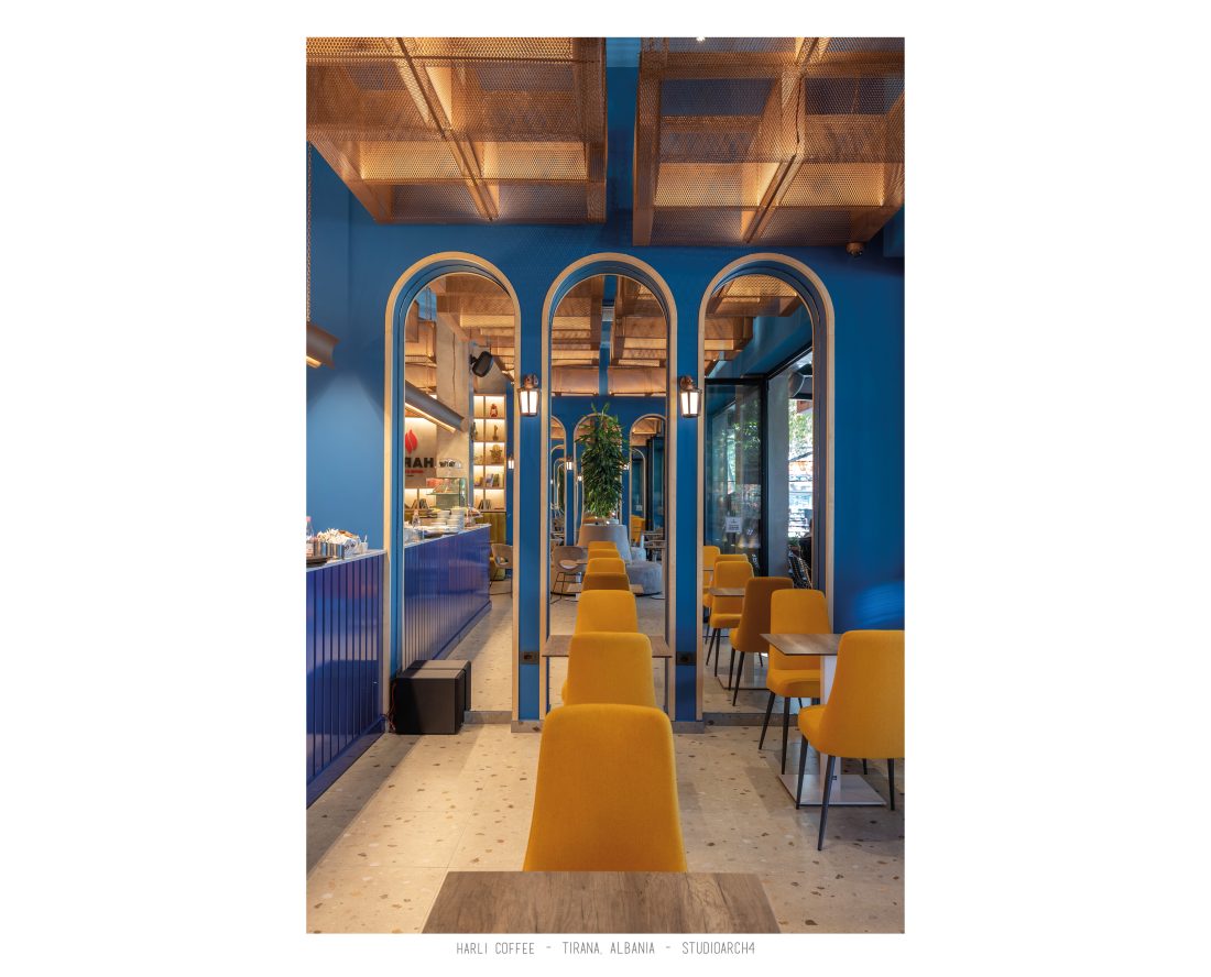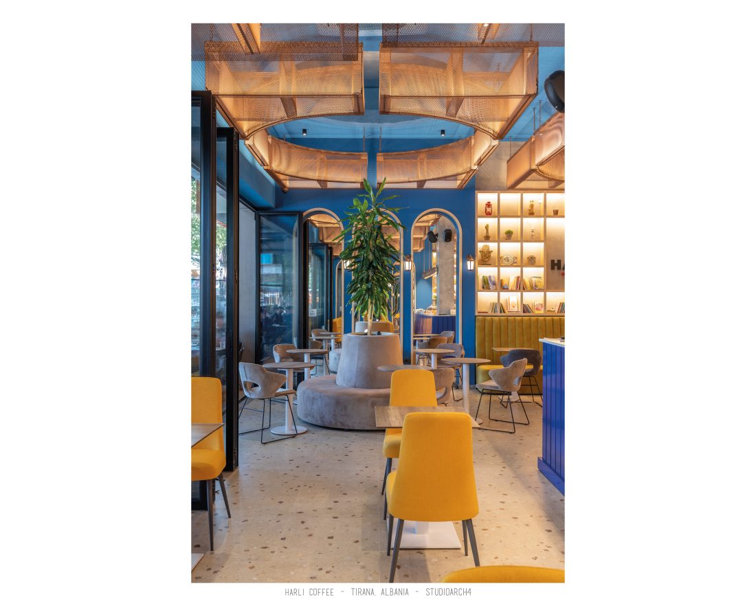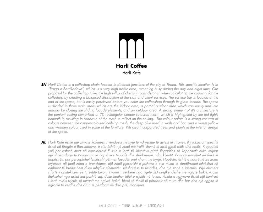 Harli Kafe është një zinxhir kafenesh i vendosur në nyje të ndryshme të qytetit të Tiranës. Ky lokacion specifik është në Rrugën e Barrikadave, e cila është një zonë me trafik shumë të lartë gjatë ditës dhe natës. Propozimi ynë për kafenë merr në konsideratë fluksin e lartë të klientëve gjatë llogaritjes së kapacitetit duke krijuar një shpërndarje të balancuar të hapsirave te stafit dhe shërbimeve ndaj klientit. Banaku ndodhet në fund të hapësirës, por perceptohet lehtësisht përmes fasadës prej xhami ne hyrje. Hapësira është e ndarë në tre zona kryesore që janë zona e brendshme, një zonë pjeserisht e jashtme e cila mund të shndërrohet lehtësisht në ambient të brendshem duke mbyllur elementët rrëshqitëse te fasadës, dhe një zonë e jashtme. Një element i fortë i arkitekturës së tij është tavani i varur i përbërë nga rrjetë 3D drejtkëndëshe me ngjyrë bakri, e cila theksohet nga dritat led poshtë saj, duke hedhur hijet e rrjetës në tavan. Paleta e ngjyrave është një kontrast i fortë midis rrjetës së tavanit me ngjyrë bakri, blusë së thellë të përdorur në mure dhe bar dhe një ngjyre të ngrohtë të verdhë dhe druri të përdorur në disa prej mobiljeve.
