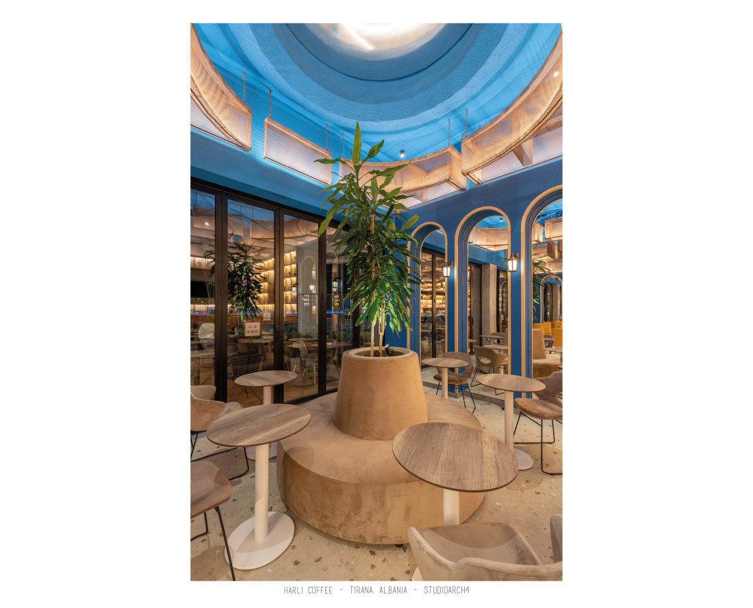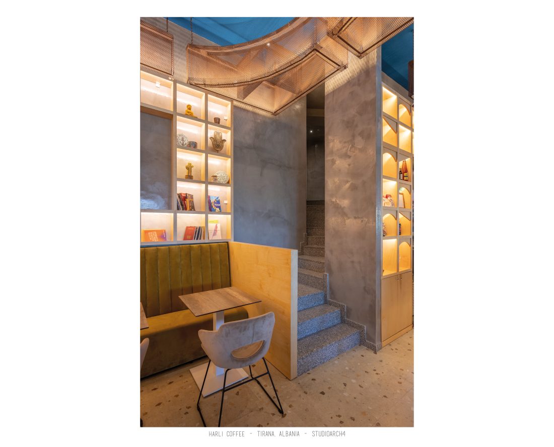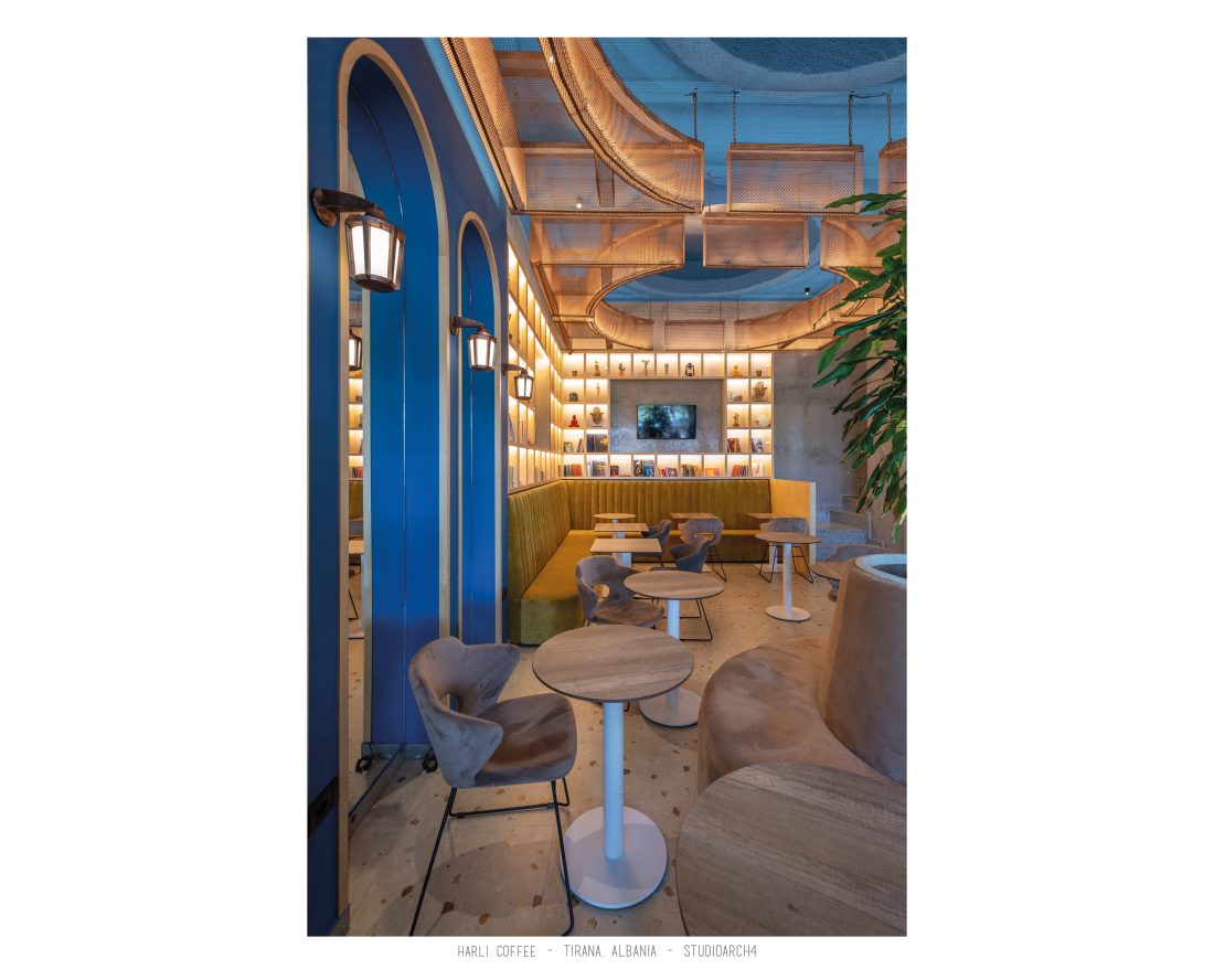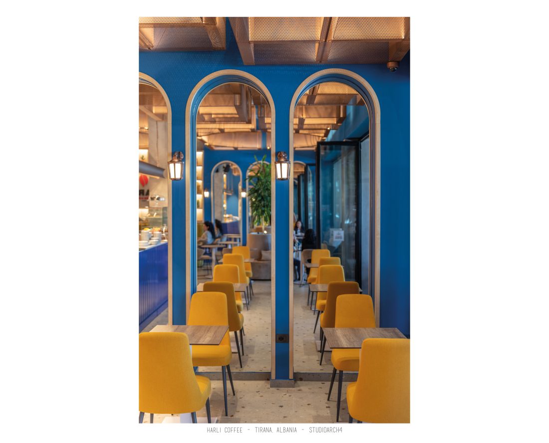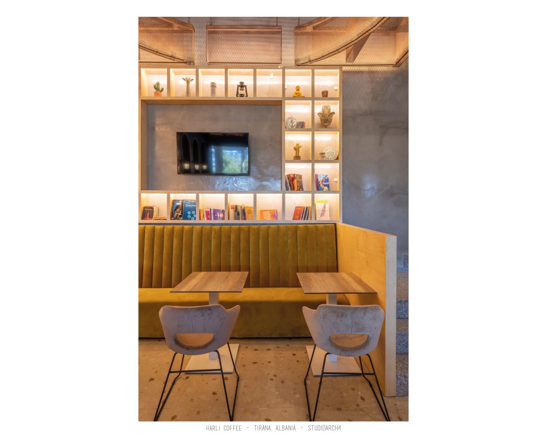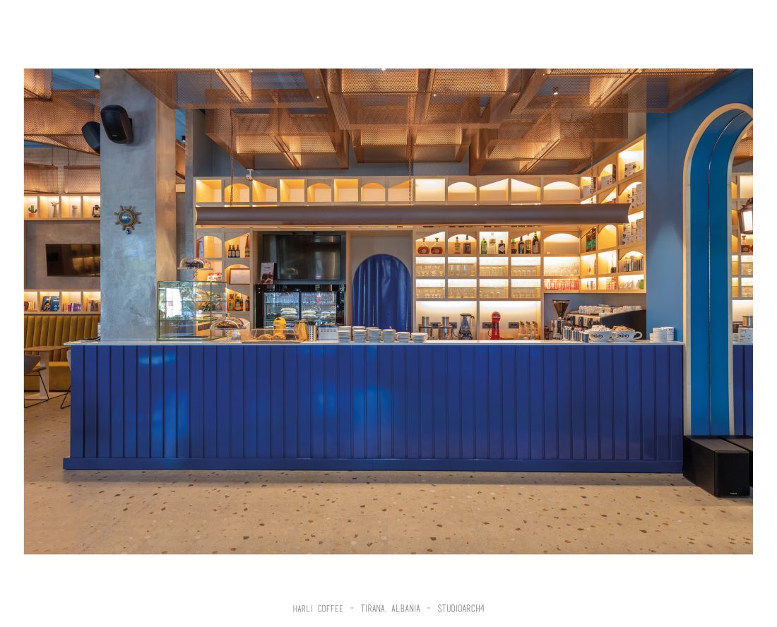 Harli Kafe është një zinxhir kafenesh i vendosur në nyje të ndryshme të qytetit të Tiranës. Ky lokacion specifik është në Rrugën e Barrikadave, e cila është një zonë me trafik shumë të lartë gjatë ditës dhe natës. Propozimi ynë për kafenë merr në konsideratë fluksin e lartë të klientëve gjatë llogaritjes së kapacitetit duke krijuar një shpërndarje të balancuar të hapsirave te stafit dhe shërbimeve ndaj klientit. Banaku ndodhet në fund të hapësirës, por perceptohet lehtësisht përmes fasadës prej xhami ne hyrje. Hapësira është e ndarë në tre zona kryesore që janë zona e brendshme, një zonë pjeserisht e jashtme e cila mund të shndërrohet lehtësisht në ambient të brendshem duke mbyllur elementët rrëshqitëse te fasadës, dhe një zonë e jashtme. Një element i fortë i arkitekturës së tij është tavani i varur i përbërë nga rrjetë 3D drejtkëndëshe me ngjyrë bakri, e cila theksohet nga dritat led poshtë saj, duke hedhur hijet e rrjetës në tavan. Paleta e ngjyrave është një kontrast i fortë midis rrjetës së tavanit me ngjyrë bakri, blusë së thellë të përdorur në mure dhe bar dhe një ngjyre të ngrohtë të verdhë dhe druri të përdorur në disa prej mobiljeve.